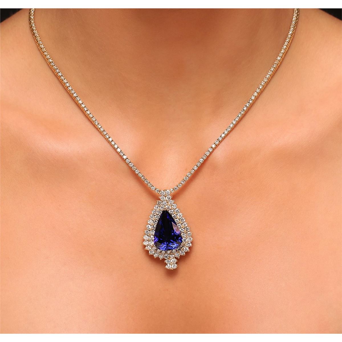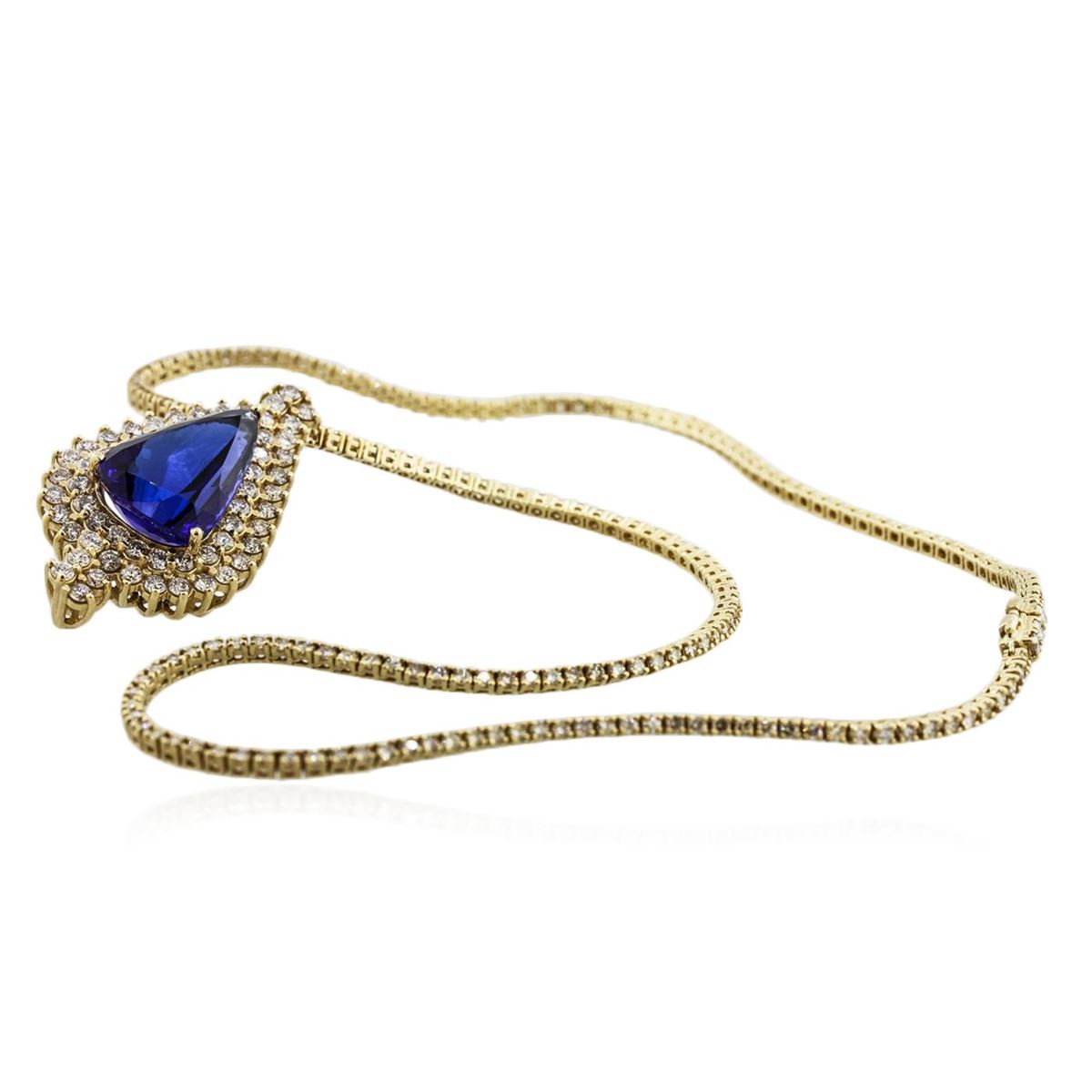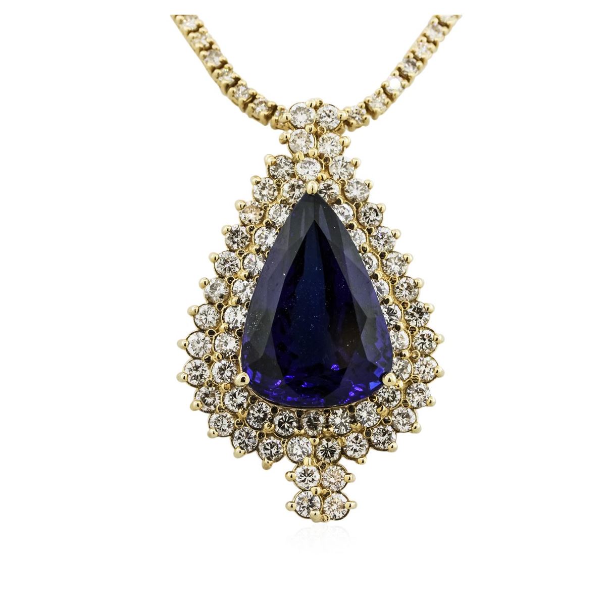One electronically tested 14KT yellow gold Ladies combination cast & assembled necklace with a hidden box clasp with a bright polish finish. Condition is new. Measurements: 16" in length. Identified with markings of "14K". Containing: One prong set pear modified brilliant cut natural tanzanite, measuring 22.25 x 15.25 x 11.07mm, exact weight 23.05ct., clarity is eye clean, type I, medium dark, moderately strong, violetish blue color, (GIA vB 6/4), cut is very good. GIA Report: 2151735357. One Hundred Eighty prong set round brilliant cut diamonds, measuring 2.00 - 2.00 x 1.20mm (depth est.) approximate. Total Weight of 180 Stones = 5.26ct. Clarity: I-1 to I-2. Color: K - L, Cut is Good. Sixty-Two prong set round brilliant cut diamonds, measuring 2.90 - 2.50 x 1.62mm (depth est.) approximate. Total Weight of 62 Stones = 4.46ct. Clarity: I-1 to I-2. Color: J - L, Cut is Good. Total Weight of Colored Stones 23.05ct. Total Weight of Diamonds 9.72ct. Total Weight of Necklace 36.70 grams. GGL Appraised at $55,890.00.