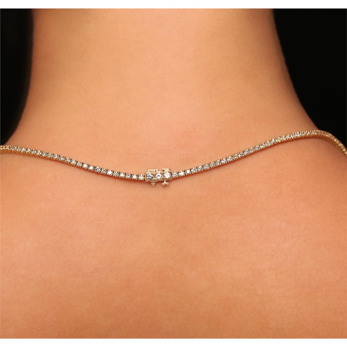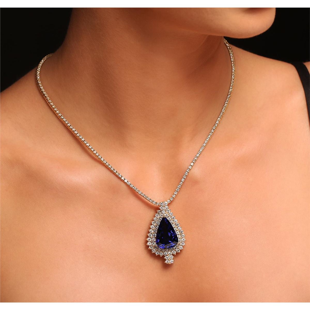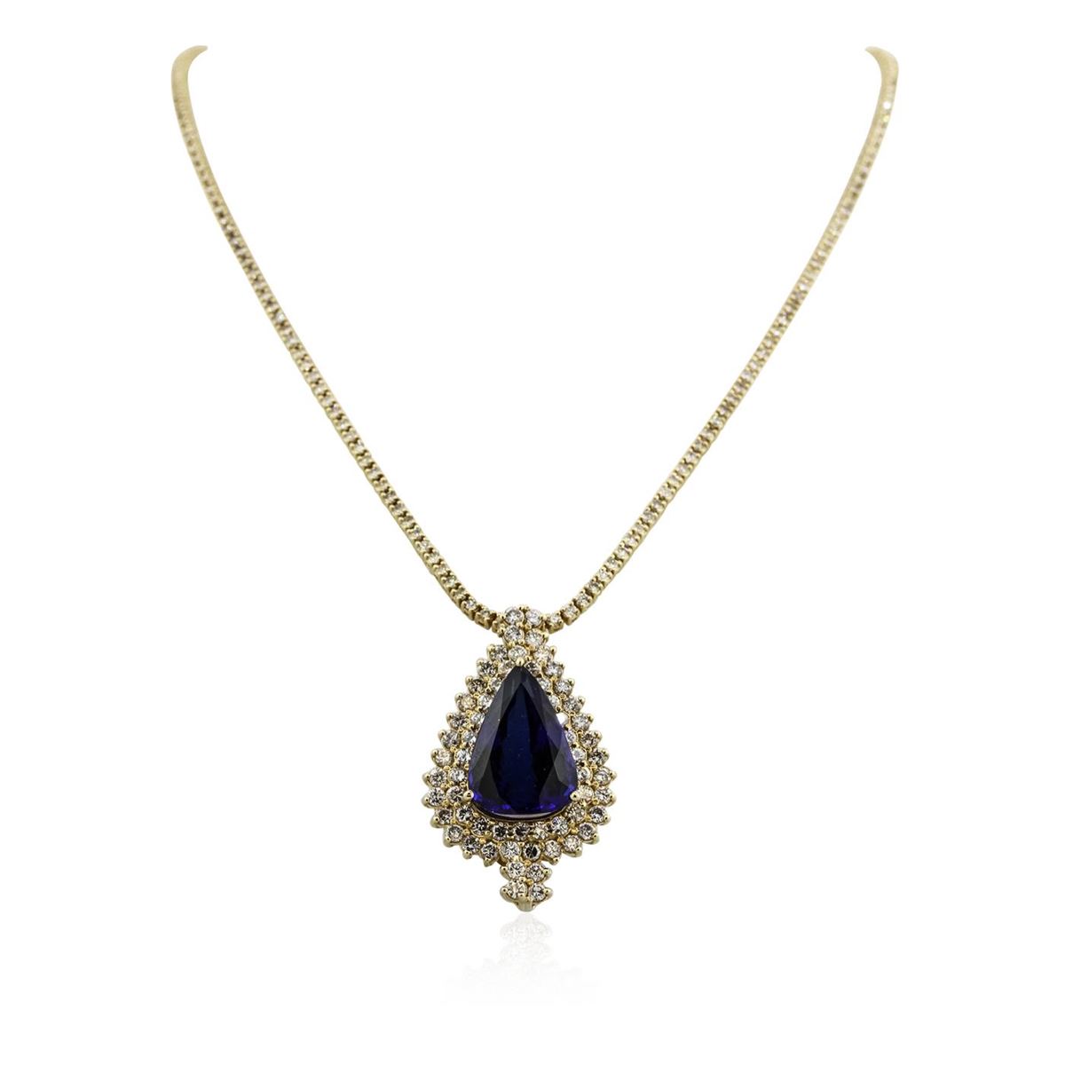 One electronically tested 14KT yellow gold Ladies combination cast & assembled necklace with a hidden box clasp with a bright polish finish. Condition is new. Measurements: 16" in length. Identified with markings of "14K". Containing: One prong set pear modified brilliant cut natural tanzanite, measuring 22.25 x 15.25 x 11.07mm, exact weight 23.05ct., clarity is eye clean, type I, medium dark, moderately strong, violetish blue color, (GIA vB 6/4), cut is very good. GIA Report: 2151735357. One Hundred Eighty prong set round brilliant cut diamonds, measuring 2.00 - 2.00 x 1.20mm (depth est.) approximate. Total Weight of 180 Stones = 5.26ct. Clarity: I-1 to I-2. Color: K - L, Cut is Good. Sixty-Two prong set round brilliant cut diamonds, measuring 2.90 - 2.50 x 1.62mm (depth est.) approximate. Total Weight of 62 Stones = 4.46ct. Clarity: I-1 to I-2. Color: J - L, Cut is Good. Total Weight of Colored Stones 23.05ct. Total Weight of Diamonds 9.72ct. Total Weight of Necklace 36.70 grams. GGL Appraised at $55,890.00.