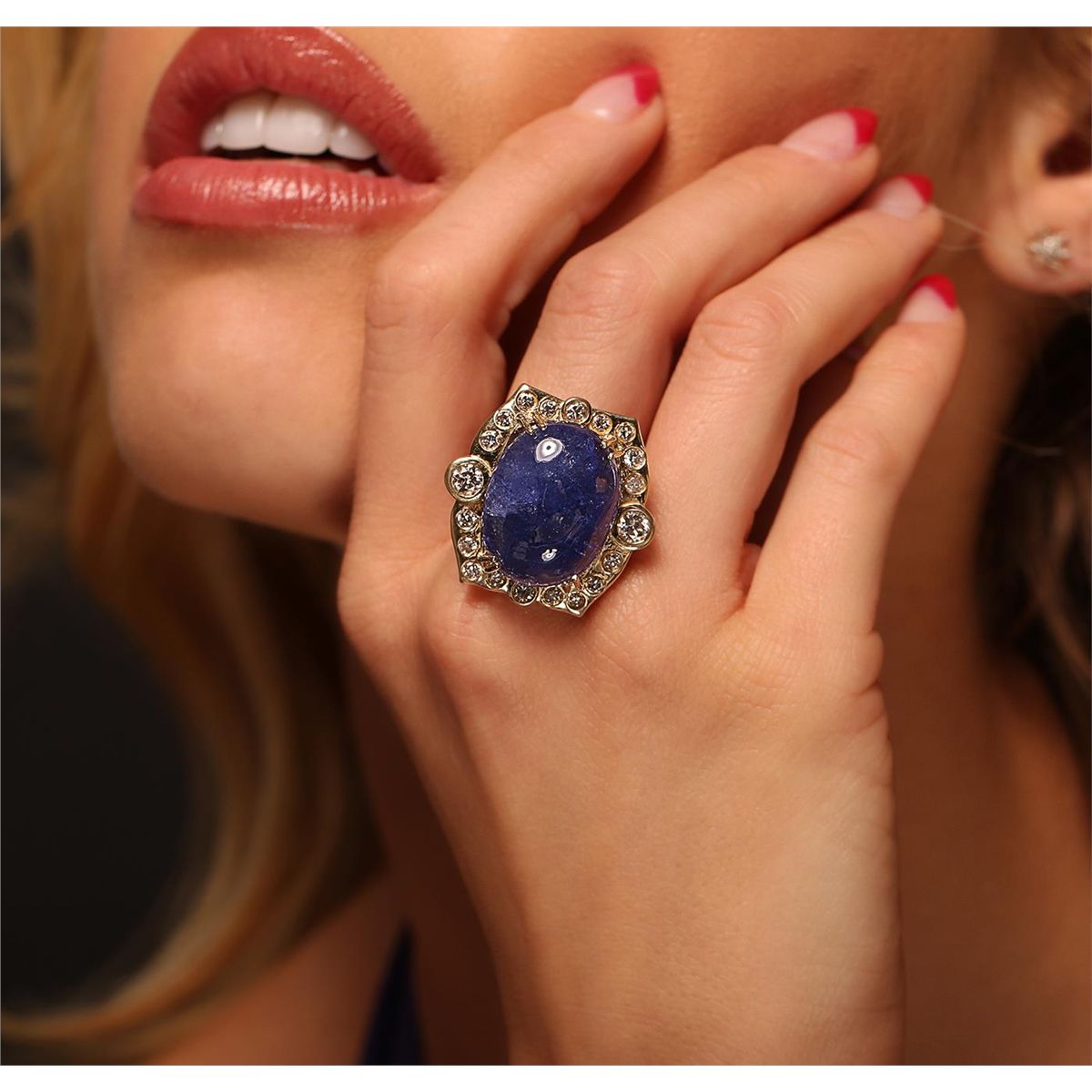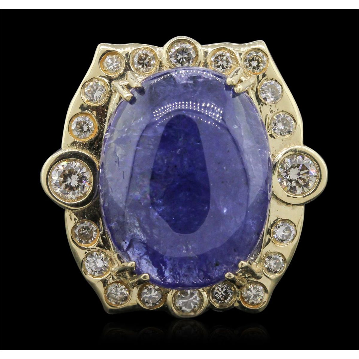 One electronically tested 14KT yellow gold ladies cast tanzanite and diamond ring with a bright polish finish. The featured tanzanite is set within a stylized diamond bezel supported by diamond set shoulders, completed by a one and one-half millimeter wide band. Identified with markings of "K14". Condition is new, good workmanship. Containing: One prong set oval cabochon cut natural tanzanite, measuring 21.50 x 16.50 x 6.30mm, 15%. bulge factor, approximate weight of 23.25ct., clarity is heavily included, type I, medium dark, moderately strong, bluish violet color, (GIA bV 6/4), cut is good. Transmitting light somewhat diffusely, translucent. Naturally occurring internal & external characteristics are present. Colored Stone Grading Report attached. Graded in the setting. Tanzanite is a very rare gemstone that is only found in the country of Tanzania. Originally discovered in 1967. Tiffany & Company, named the stone Tanzanite. It is found in the Usumburu Mountains that border the Umba Valley of northern Tanzania. Tanzanite occurs in gray, brown, violet, blue, reddish-purple, & green. The gem is interesting because of its exceptional pleochroism. Rotated in different directions a tanzanite will exhibit multiple changes of color. Tanzanite has a low tolerance to ultrasonic cleaning, and should not be cleaned using this method. Two bezel set round brilliant cut diamonds, measuring 4.10 - 4.00 x 2.43mm (depth est.) approximate. Total Weight of 2 Stones = 0.50ct. Color & clarity grade are an average for the pair. Graded in the setting. Clarity: SI-1. Color: H Twenty-Four bezel set round brilliant cut diamonds, measuring 2.60 - 2.00 x 1.38mm (depth est.) approximate. Total Weight of 24 Stones = 1.17ct. Graded in the setting. Clarity: SI-1 to I-1. Color: G - I. Total Weight of Colored Stones 23.25ct. Total Weight of Diamonds 1.67ct. AIG Appraised at $14,840.00.