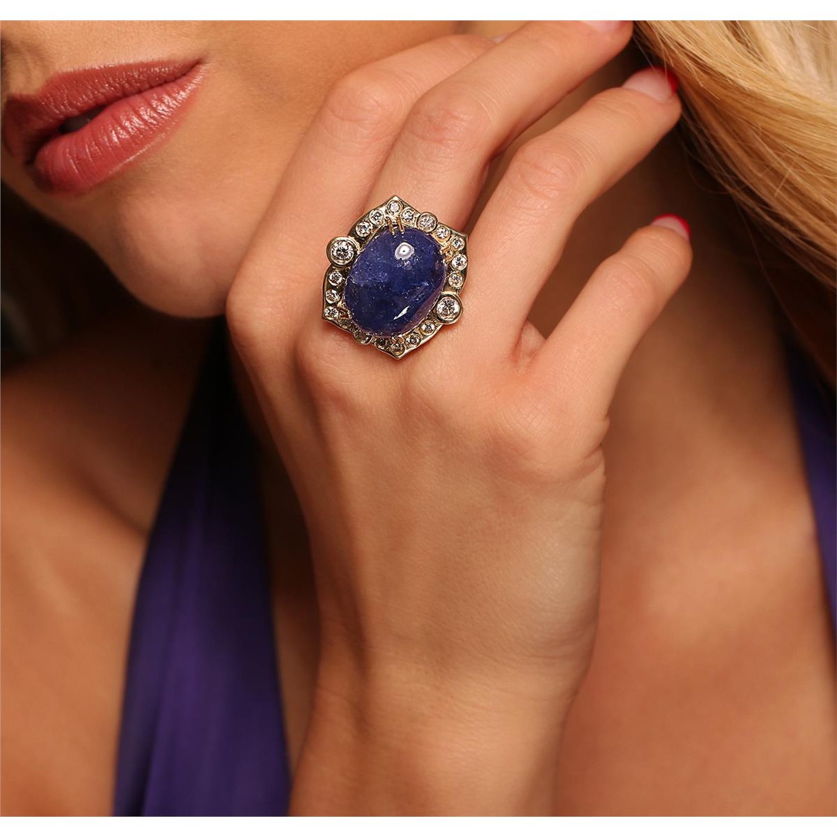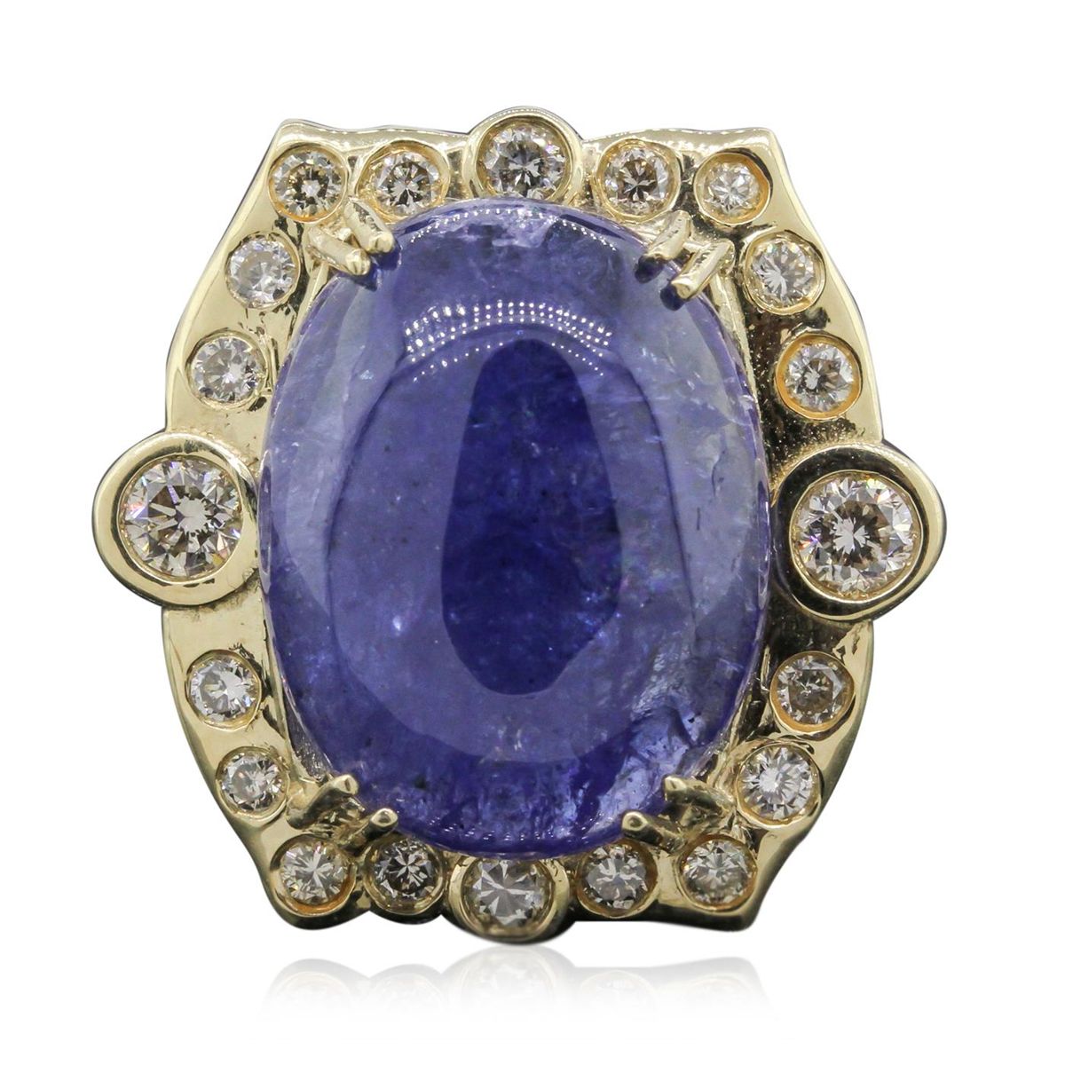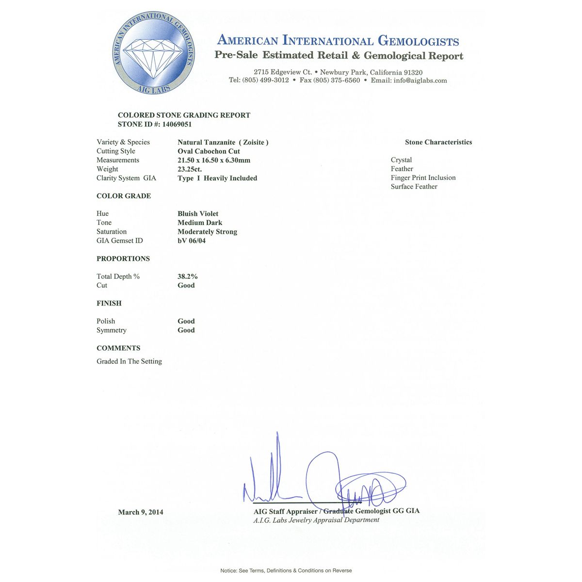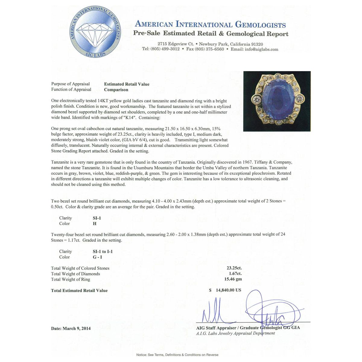 One electronically tested 14KT yellow gold ladies cast tanzanite and diamond ring with a bright polish finish. The featured tanzanite is set within a stylized diamond bezel supported by diamond set shoulders, completed by a one and one-half millimeter wide band. Identified with markings of "K14". Condition is new, good workmanship. Containing: One prong set oval cabochon cut natural tanzanite, measuring 21.50 x 16.50 x 6.30mm, 15%. bulge factor, approximate weight of 23.25ct., clarity is heavily included, type I, medium dark, moderately strong, bluish violet color, (GIA bV 6/4), cut is good. Transmitting light somewhat diffusely, translucent. Naturally occurring internal & external characteristics are present. Colored Stone Grading Report attached. Graded in the setting. Tanzanite is a very rare gemstone that is only found in the country of Tanzania. Originally discovered in 1967. Tiffany & Company, named the stone Tanzanite. It is found in the Usumburu Mountains that border the Umba Valley of northern Tanzania. Tanzanite occurs in gray, brown, violet, blue, reddish-purple, & green. The gem is interesting because of its exceptional pleochroism. Rotated in different directions a tanzanite will exhibit multiple changes of color. Tanzanite has a low tolerance to ultrasonic cleaning, and should not be cleaned using this method. Two bezel set round brilliant cut diamonds, measuring 4.10 - 4.00 x 2.43mm (depth est.) approximate. Total Weight of 2 Stones = 0.50ct. Color & clarity grade are an average for the pair. Graded in the setting. Clarity: SI-1. Color: H Twenty-Four bezel set round brilliant cut diamonds, measuring 2.60 - 2.00 x 1.38mm (depth est.) approximate. Total Weight of 24 Stones = 1.17ct. Graded in the setting. Clarity: SI-1 to I-1. Color: G - I. Total Weight of Colored Stones 23.25ct. Total Weight of Diamonds 1.67ct. AIG Appraised at $14,840.00.