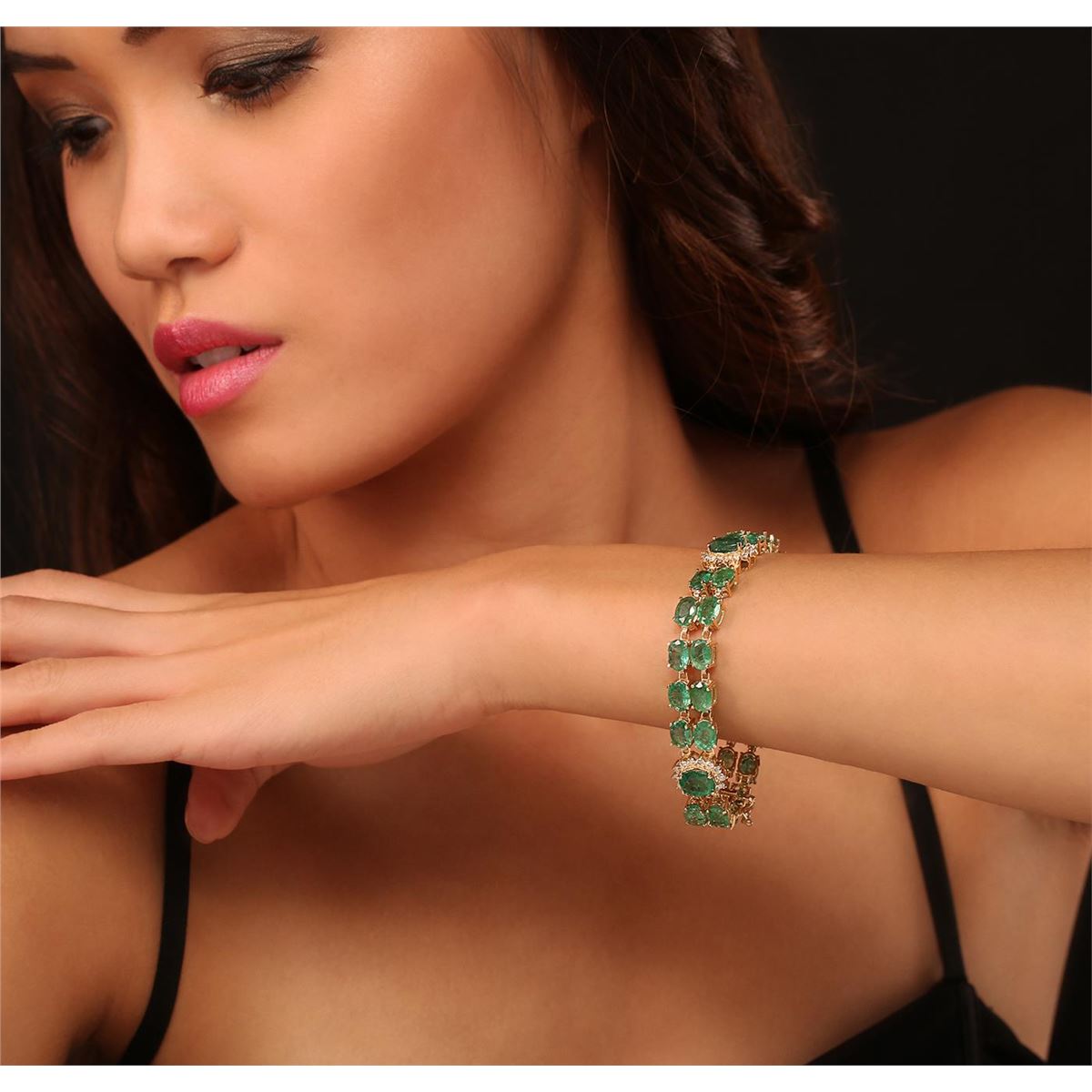 One electronically tested 14KT yellow gold ladies cast & assembled emerald and diamond bracelet with a bright polish finish. Condition is new, good workmanship. Seven inch length bracelet features two emerald ribbons supported by emerald and diamond florets at specific intervals, terminating in a hidden clasp with safety. Identified with markings of "14K". Containing: Three prong set oval mixed cut natural emeralds, measuring 9.00 x 7.00 x 4.30mm, 6%. bulge factor, approximate. Total Weight of 4.77ct., clarity is heavily included, type III, medium dark, very slightly grayish, very slightly bluish green color, (GIA vslbG 6/3), cut is good. Transmitting light with a minimum of distortion, transparent. Naturally occurring internal & external characteristics are present. Measurements & the color grade are an average for the group. Indications of oil residue. Graded in the setting. Thirty prong set oval mixed cut natural emeralds, measuring 7.00 x 5.00 x 3.00mm, 6%. bulge factor, approximate. Total Weight of 18.60ct., clarity is heavily included, type III, medium dark, very slightly grayish, very slightly bluish green color, (GIA vslbG 6/3), cut is good. Transmitting light with a minimum of distortion, transparent. Naturally occurring internal & external characteristics are present. Measurements & the color grade are an average for the group. Indications of oil residue. Graded in the setting. Forty-Two prong set round brilliant cut diamonds, measuring 1.80 - 1.70 x 1.05mm (depth est.) approximate. Total Weight of 42 Stones = 0.92ct. Graded in the setting. Clarity: SI-1 to I-1 . Color: G - I. Total Weight of Colored Stones 23.37ct.. Total Weight of Diamonds 0.92ct.. Total Weight of Bracelet 24.21gm. AIG Appraised at $17,825.00.