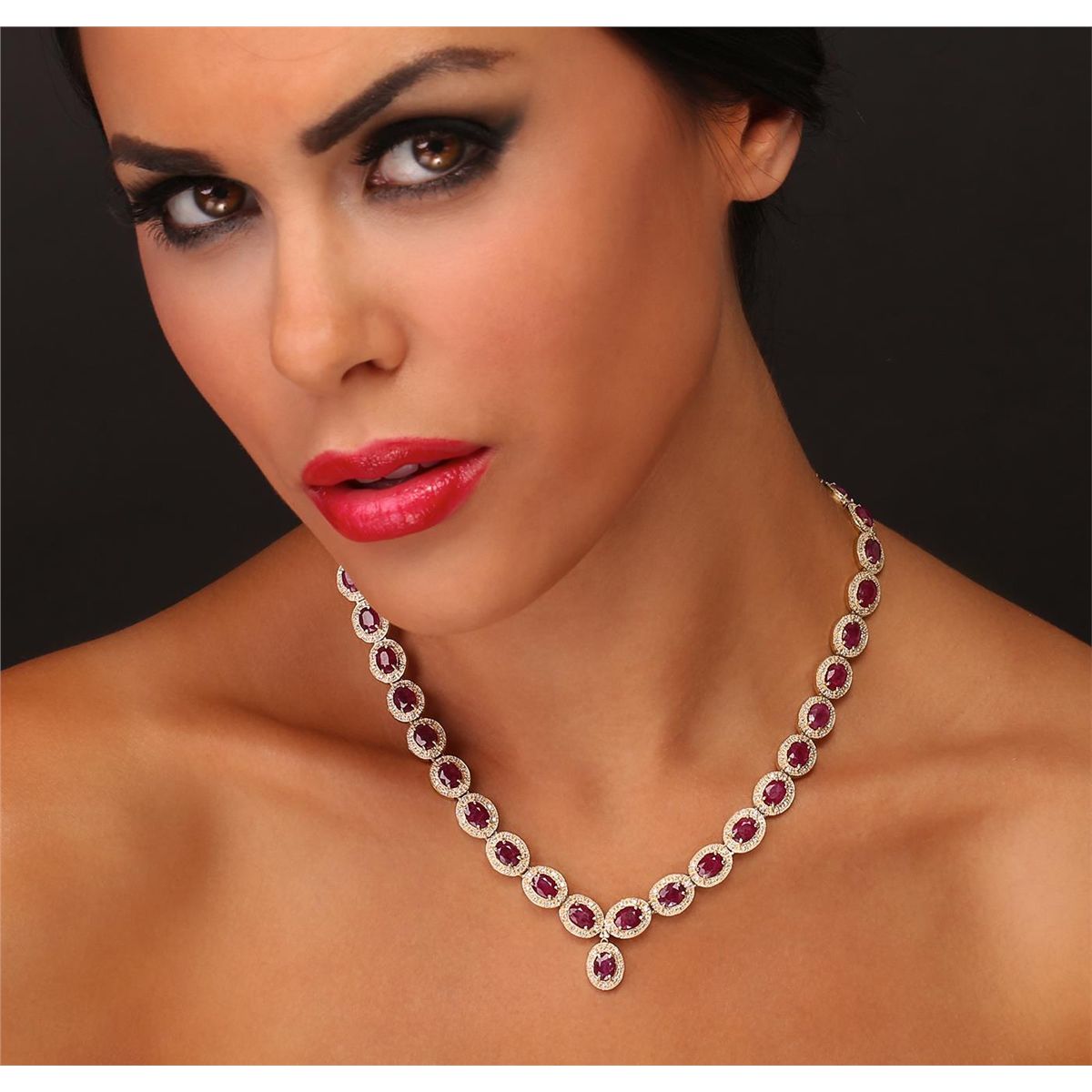 One electronically tested 14KT yellow gold Ladies combination cast & assembled necklace with a hidden box clasp with a bright polish finish. Condition is new. Measurements: 17" in length. Identified with markings of "14K". Containing: Thirty-seven prong set oval modified brilliant cut natural rubies, measuring 7.30 x 4.80 x 2.22mm, approximate. Total Weight of 24.05ct., clarity is heavily included, type II, medium, moderately strong, strongly purplish red color, (GIA stpR 5/4), cut is good. Colored gemstones are presumed to have been subjected to commonly used color/clarity enhancement processes. Two Hundred Ninety-Six prong set round brilliant cut diamonds, measuring 1.30 - 1.30 x 0.78mm (depth est.) approximate. Total Weight of 296 Stones = 2.37ct. Clarity: SI-2 to I-2. Color: J - K, Cut is Good. Total Weight of Colored Stones 24.05ct. Total Weight of Diamonds 2.37ct. Total Weight of Necklace 44.60 grams. GGL Appraised at $27,575.00.