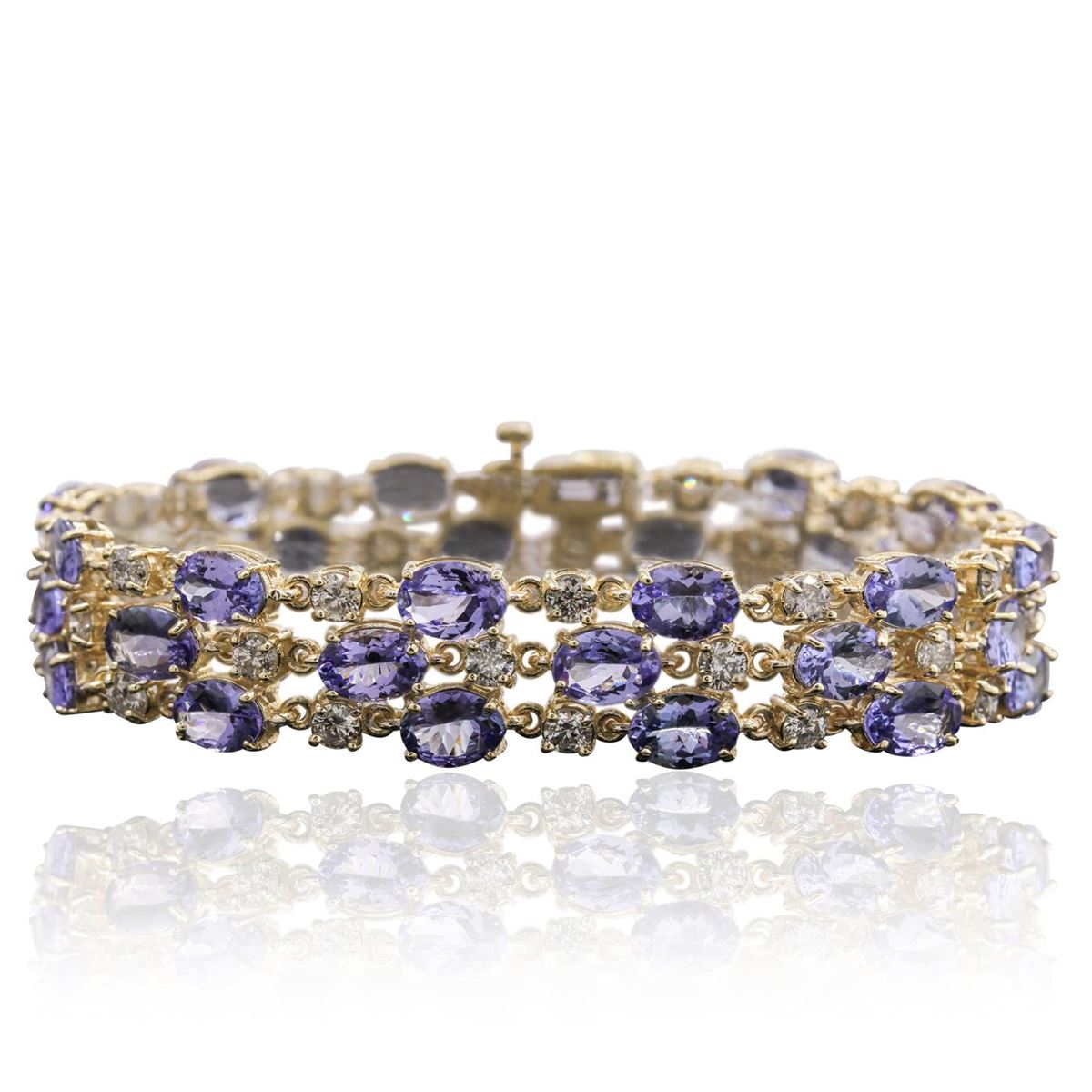 One electronically tested 14KT yellow gold Ladies combination cast & assembled bracelet with a hidden box clasp with a bright polish finish. Condition is new. Measurements: 7" in length. Containing: Thirty-six prong set oval modified brilliant cut natural tanzanites, measuring 6.84 x 5.10 x 2.81mm, approximate. Total Weight of 24.17ct., clarity is eye clean, type I, medium light, very slightly grayish, violet color, (GIA V 4/3), cut is very good. Colored gemstones are presumed to have been subjected to commonly used color/clarity enhancement processes. Thirty-Six prong set round brilliant cut diamonds, measuring 3.00 - 3.00 x 1.80mm (depth est.) approximate. Total Weight of 36 Stones = 4.22ct. Clarity: I-1 to I-3. Color: H - I, Cut is Good. Total Weight of Colored Stones 24.17ct. Total Weight of Diamonds 4.22ct. Total Weight of Bracelet 25.70 grams. GGL Appraised at $39,075.00.
