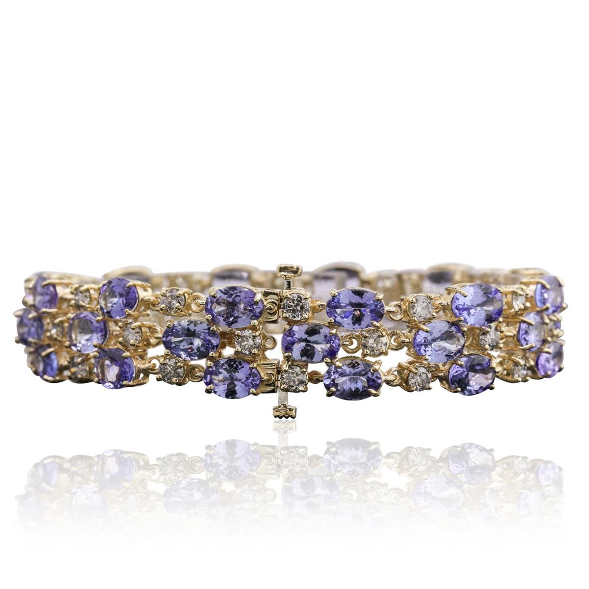 One electronically tested 14KT yellow gold Ladies combination cast & assembled bracelet with a hidden box clasp with a bright polish finish. Condition is new. Measurements: 7" in length. Containing: Thirty-six prong set oval modified brilliant cut natural tanzanites, measuring 6.84 x 5.10 x 2.81mm, approximate. Total Weight of 24.17ct., clarity is eye clean, type I, medium light, very slightly grayish, violet color, (GIA V 4/3), cut is very good. Colored gemstones are presumed to have been subjected to commonly used color/clarity enhancement processes. Thirty-Six prong set round brilliant cut diamonds, measuring 3.00 - 3.00 x 1.80mm (depth est.) approximate. Total Weight of 36 Stones = 4.22ct. Clarity: I-1 to I-3. Color: H - I, Cut is Good. Total Weight of Colored Stones 24.17ct. Total Weight of Diamonds 4.22ct. Total Weight of Bracelet 25.70 grams. GGL Appraised at $39,075.00.