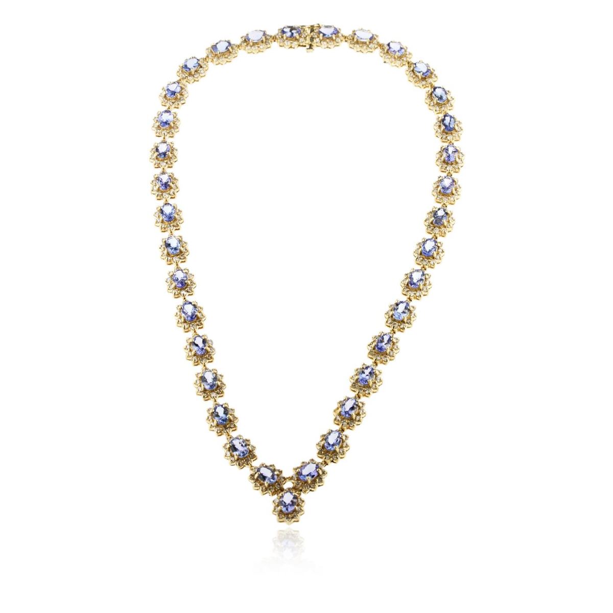 One electronically tested 14KT yellow gold ladies cast & assembled tanzanite and diamond necklace. Condition is new, good workmanship. Seventeen and one-half inch length necklace features a chevron style tanzanite and diamond floret ribbon, terminating in a concealed clasp with safety. Bright polish finish. Identified with markings of "14K". Containing: Thirty-five prong set oval mixed cut natural tanzanites, measuring 7.00 x 5.00 x 2.95mm, approximate. Total Weight of 24.95ct., clarity is eye clean, type I, medium dark, very slightly grayish, bluish violet color, (GIA bV 6/3), cut is good. Transmitting light with no distortion, transparent. Measurements & the color grade are an average for the group. Graded in the setting. Tanzanite is a very rare gemstone that is only found in the country of Tanzania. Originally discovered in 1967. Tiffany & Company, named the stone Tanzanite. It is found in the Usumburu Mountains that border the Umba Valley of northern Tanzania. Tanzanite occurs in gray, brown, violet, blue, reddish-purple, & green. The gem is interesting because of its exceptional pleochroism. Rotated in different directions a tanzanite will exhibit multiple changes of color. Tanzanite has a low tolerance to ultrasonic cleaning, and should not be cleaned using this method. Three Hundred Fifty prong set round brilliant cut diamonds, measuring 2.10 - 2.00 x 1.23mm (depth est.) approximate. Total Weight of 350 Stones = 11.12ct. Graded in the setting. Clarity: SI-1 to I-1. Color: H - J. Total Weight of Colored Stones 24.95ct. Total Weight of Diamonds 11.12ct. Total Weight of Necklace 55.81 grams. AIG Appraised at $57,995.00.