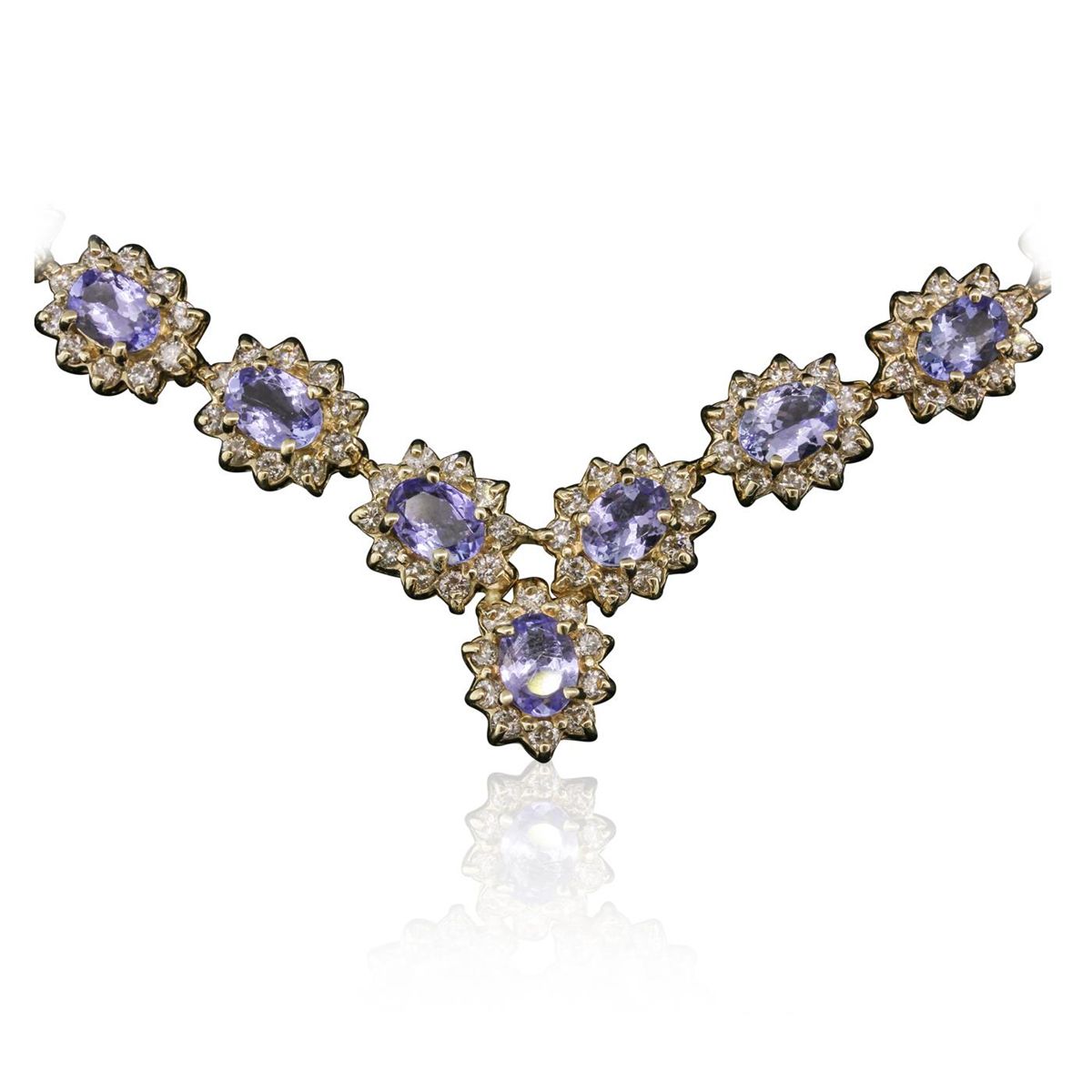 One electronically tested 14KT yellow gold ladies cast & assembled tanzanite and diamond necklace. Condition is new, good workmanship. Seventeen and one-half inch length necklace features a chevron style tanzanite and diamond floret ribbon, terminating in a concealed clasp with safety. Bright polish finish. Identified with markings of "14K". Containing: Thirty-five prong set oval mixed cut natural tanzanites, measuring 7.00 x 5.00 x 2.95mm, approximate. Total Weight of 24.95ct., clarity is eye clean, type I, medium dark, very slightly grayish, bluish violet color, (GIA bV 6/3), cut is good. Transmitting light with no distortion, transparent. Measurements & the color grade are an average for the group. Graded in the setting. Tanzanite is a very rare gemstone that is only found in the country of Tanzania. Originally discovered in 1967. Tiffany & Company, named the stone Tanzanite. It is found in the Usumburu Mountains that border the Umba Valley of northern Tanzania. Tanzanite occurs in gray, brown, violet, blue, reddish-purple, & green. The gem is interesting because of its exceptional pleochroism. Rotated in different directions a tanzanite will exhibit multiple changes of color. Tanzanite has a low tolerance to ultrasonic cleaning, and should not be cleaned using this method. Three Hundred Fifty prong set round brilliant cut diamonds, measuring 2.10 - 2.00 x 1.23mm (depth est.) approximate. Total Weight of 350 Stones = 11.12ct. Graded in the setting. Clarity: SI-1 to I-1. Color: H - J. Total Weight of Colored Stones 24.95ct. Total Weight of Diamonds 11.12ct. Total Weight of Necklace 55.81 grams. AIG Appraised at $57,995.00.