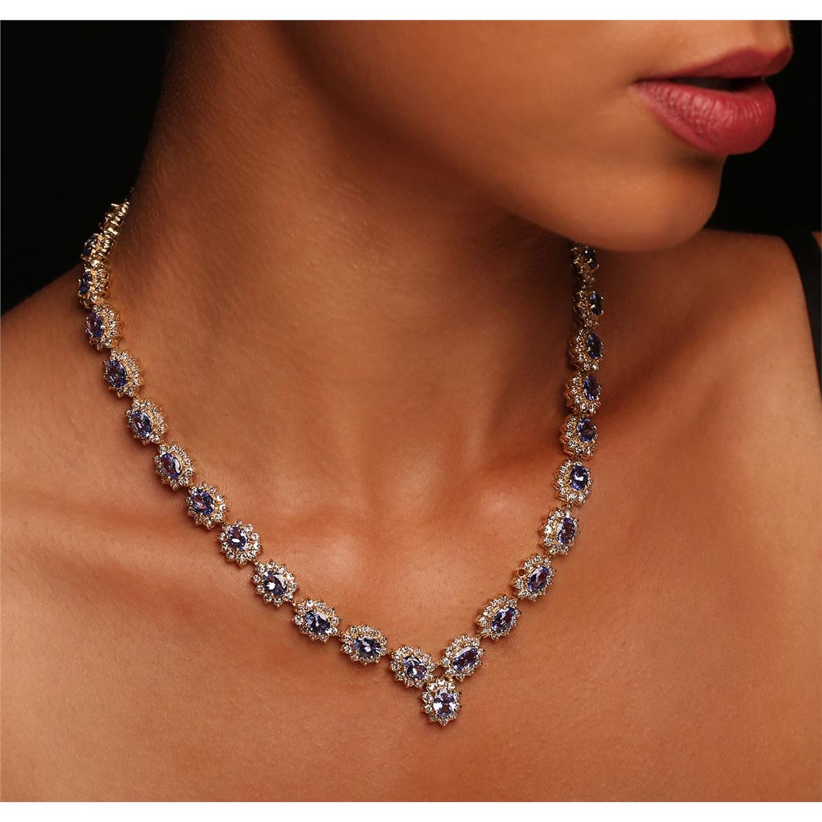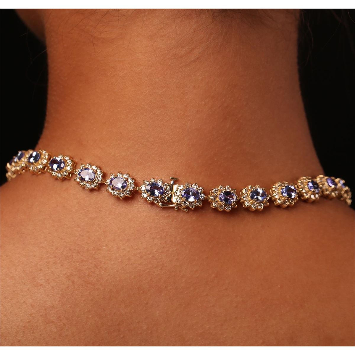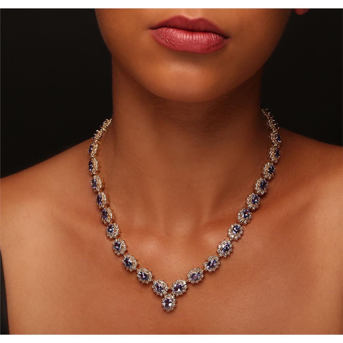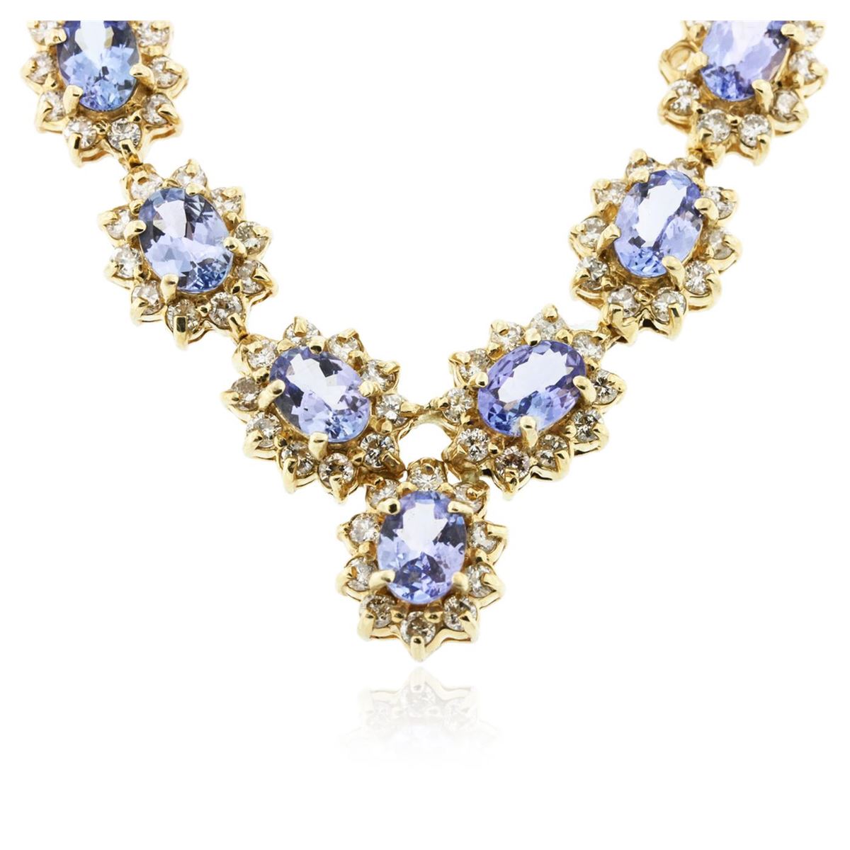One electronically tested 14KT yellow gold ladies cast & assembled tanzanite and diamond necklace. Condition is new, good workmanship. Seventeen and one-half inch length necklace features a chevron style tanzanite and diamond floret ribbon, terminating in a concealed clasp with safety. Bright polish finish. Identified with markings of "14K". Containing: Thirty-five prong set oval mixed cut natural tanzanites, measuring 7.00 x 5.00 x 2.95mm, approximate. Total Weight of 24.95ct., clarity is eye clean, type I, medium dark, very slightly grayish, bluish violet color, (GIA bV 6/3), cut is good. Transmitting light with no distortion, transparent. Measurements & the color grade are an average for the group. Graded in the setting. Tanzanite is a very rare gemstone that is only found in the country of Tanzania. Originally discovered in 1967. Tiffany & Company, named the stone Tanzanite. It is found in the Usumburu Mountains that border the Umba Valley of northern Tanzania. Tanzanite occurs in gray, brown, violet, blue, reddish-purple, & green. The gem is interesting because of its exceptional pleochroism. Rotated in different directions a tanzanite will exhibit multiple changes of color. Tanzanite has a low tolerance to ultrasonic cleaning, and should not be cleaned using this method. Three Hundred Fifty prong set round brilliant cut diamonds, measuring 2.10 - 2.00 x 1.23mm (depth est.) approximate. Total Weight of 350 Stones = 11.12ct. Graded in the setting. Clarity: SI-1 to I-1. Color: H - J. Total Weight of Colored Stones 24.95ct. Total Weight of Diamonds 11.12ct. Total Weight of Necklace 55.81 grams. AIG Appraised at $57,995.00.