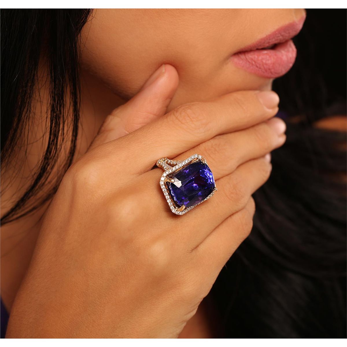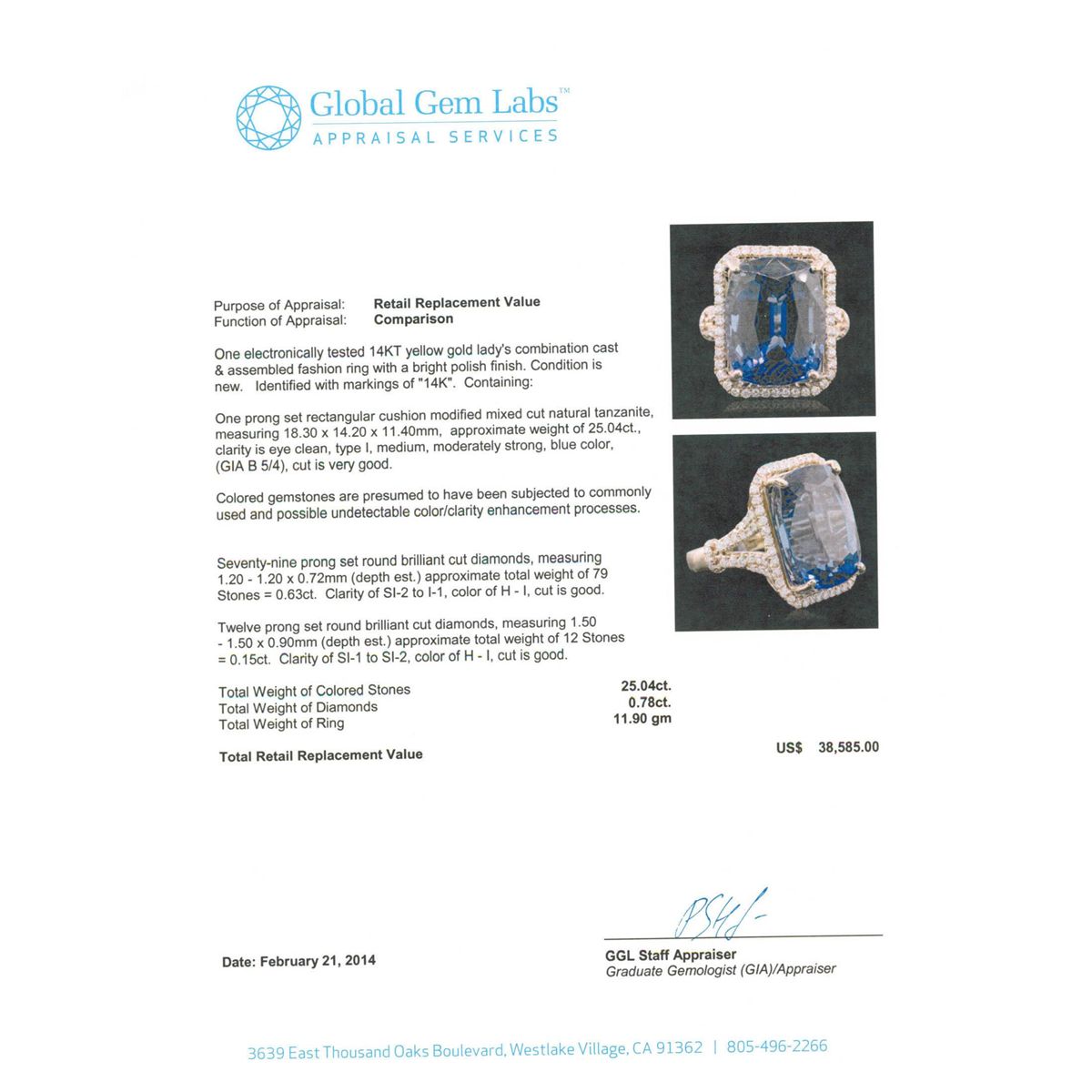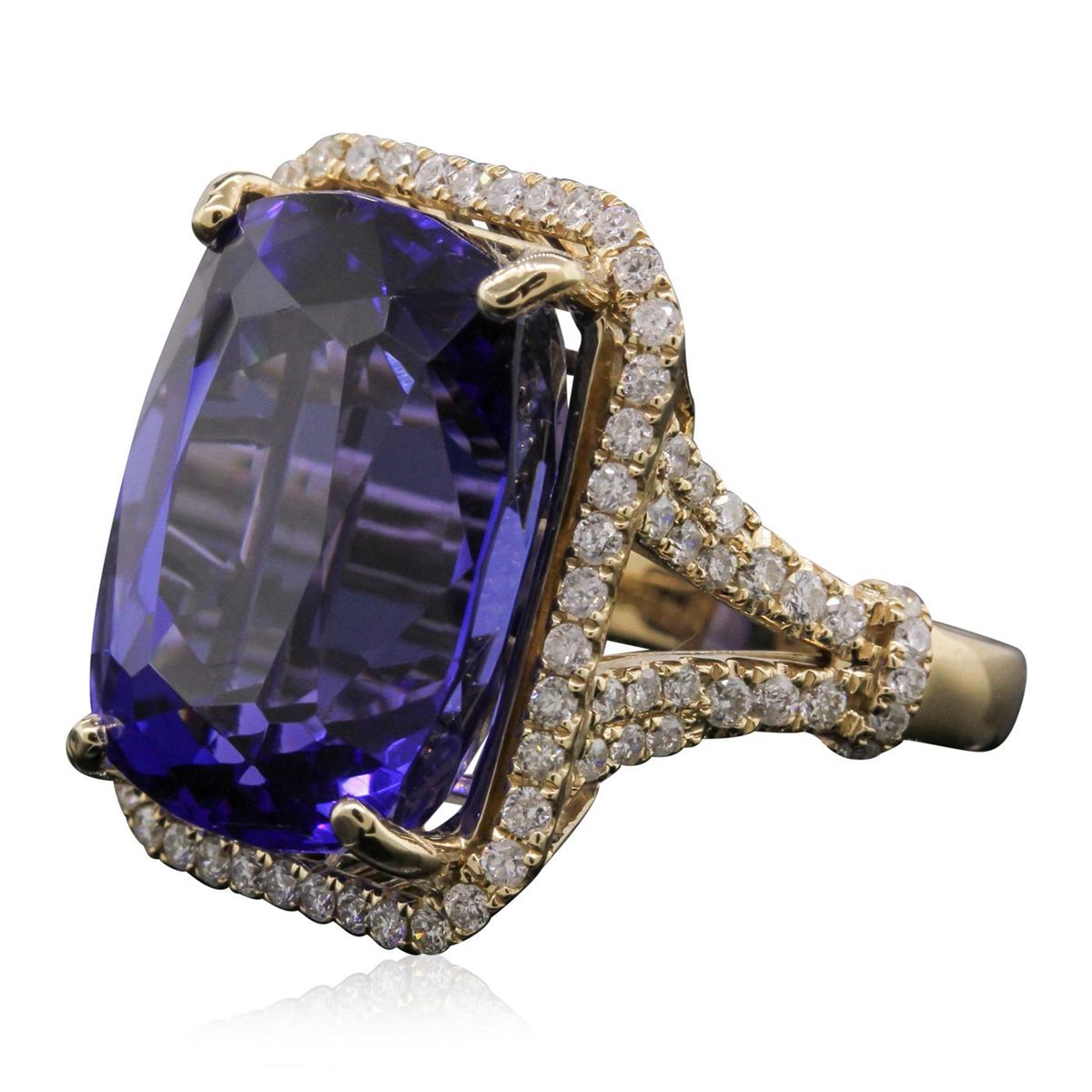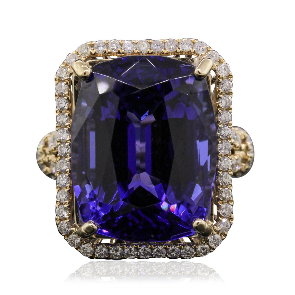 One electronically tested 14KT yellow gold Ladies combination cast & assembled fashion ring with a bright polish finish. Condition is new. Identified with markings of "14K". Containing: One prong set rectangular cushion modified mixed cut natural tanzanite, measuring 18.30 x 14.20 x 11.40mm, approximate weight of 25.04ct., clarity is eye clean, type I, medium, moderately strong, blue color, (GIA B 5/4), cut is very good. Colored gemstones are presumed to have been subjected to commonly used and possible undetectable color/clarity enhancement processes. Seventy-Nine prong set round brilliant cut diamonds, measuring 1.20 - 1.20 x 0.72mm (depth est.) approximate. Total Weight of 79 Stones = 0.63ct. Clarity: SI-2 to I-1. Color: H - I, Cut is Good. Twelve prong set round brilliant cut diamonds, measuring 1.50 - 1.50 x 0.90mm (depth est.) approximate. Total Weight of 12 Stones = 0.15ct. Clarity: SI-1 to SI-2. Color: H - I, Cut is Good. Total Weight of Colored Stones 25.04ct. Total Weight of Diamonds 0.78ct. Total Weight of Ring 11.90 grams. GGL Appraised at $38,585.00.