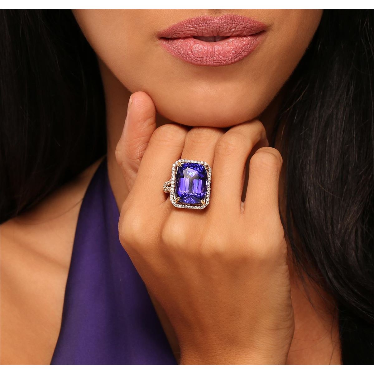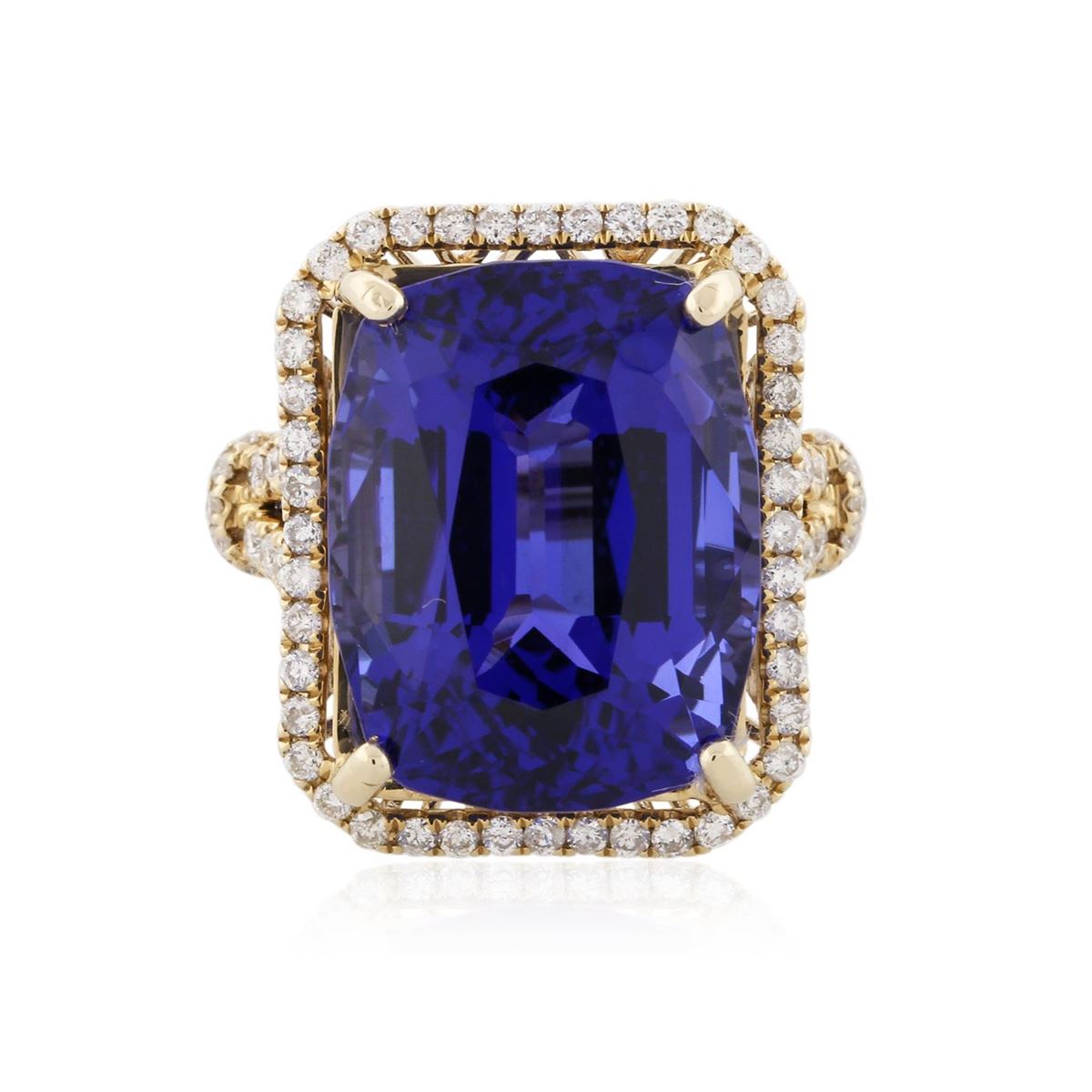 One electronically tested 14KT yellow gold Ladies combination cast & assembled fashion ring with a bright polish finish. Condition is new. Identified with markings of "14K". Containing: One prong set rectangular cushion modified mixed cut natural tanzanite, measuring 18.30 x 14.20 x 11.40mm, approximate weight of 25.04ct., clarity is eye clean, type I, medium, moderately strong, blue color, (GIA B 5/4), cut is very good. Colored gemstones are presumed to have been subjected to commonly used and possible undetectable color/clarity enhancement processes. Seventy-Nine prong set round brilliant cut diamonds, measuring 1.20 - 1.20 x 0.72mm (depth est.) approximate. Total Weight of 79 Stones = 0.63ct. Clarity: SI-2 to I-1. Color: H - I, Cut is Good. Twelve prong set round brilliant cut diamonds, measuring 1.50 - 1.50 x 0.90mm (depth est.) approximate. Total Weight of 12 Stones = 0.15ct. Clarity: SI-1 to SI-2. Color: H - I, Cut is Good. Total Weight of Colored Stones 25.04ct. Total Weight of Diamonds 0.78ct. Total Weight of Ring 11.90 grams. GGL Appraised at $38,585.00.