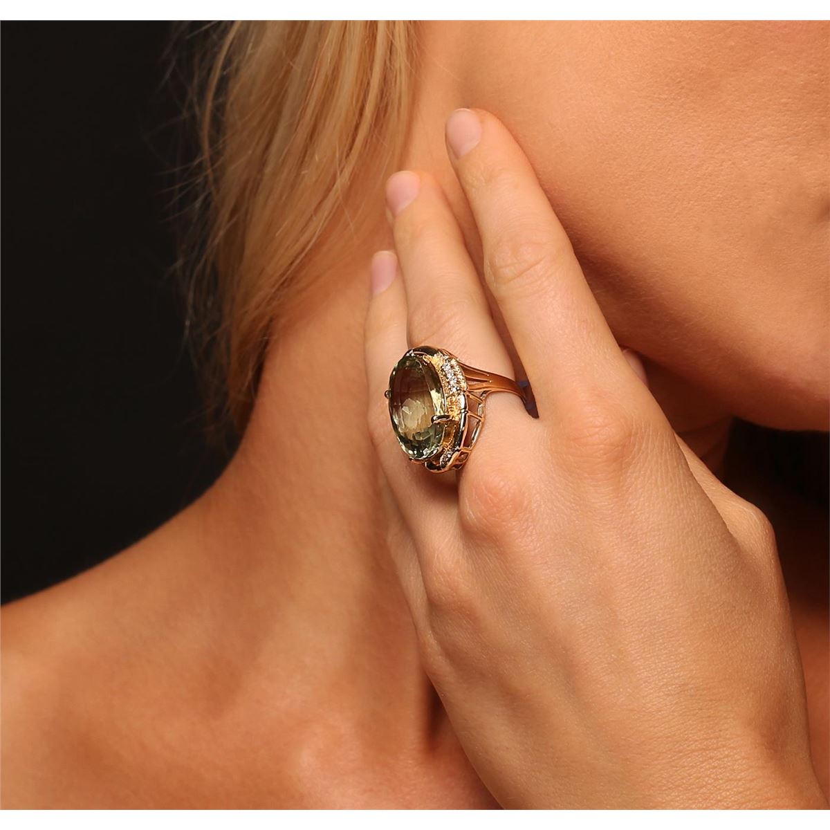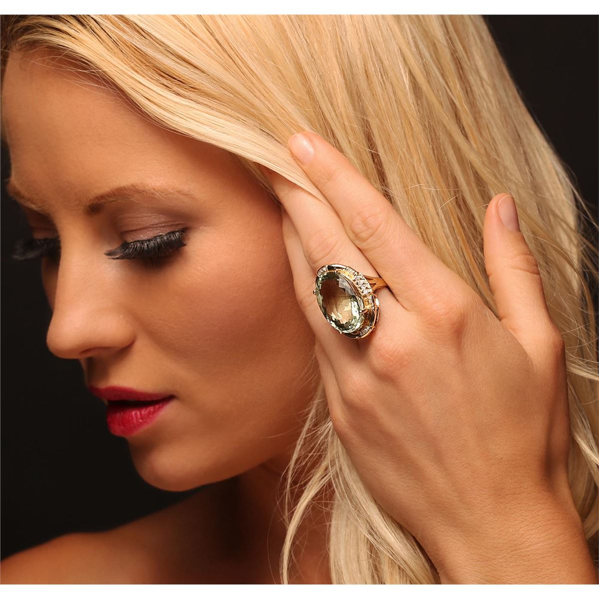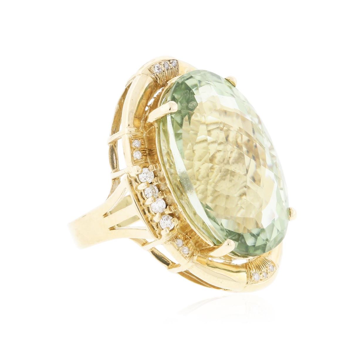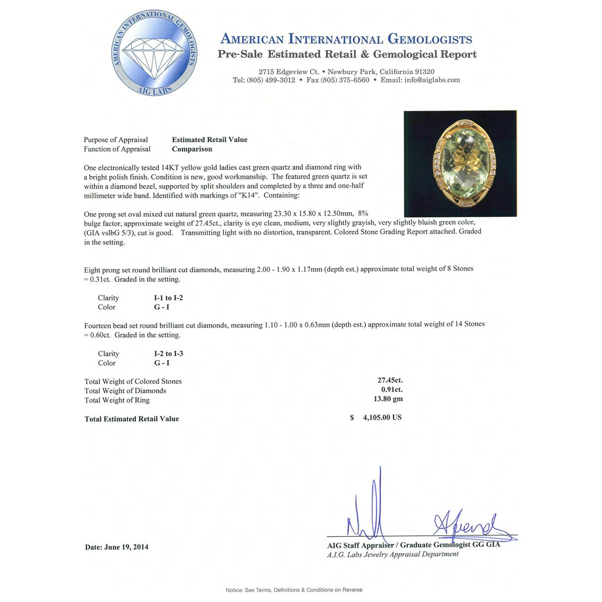 One electronically tested 14KT yellow gold ladies cast green quartz and diamond ring with a bright polish finish. Condition is new, good workmanship. The featured green quartz is set within a diamond bezel, supported by split shoulders and completed by a three and one-half millimeter wide band. Identified with markings of "K14". Containing: One prong set oval mixed cut natural green quartz, measuring 23.30 x 15.80 x 12.50mm, 8%. bulge factor, approximate weight of 27.45ct., clarity is eye clean, medium, very slightly grayish, very slightly bluish green color, (GIA vslbG 5/3), cut is good. Transmitting light with no distortion, transparent. Colored Stone Grading Report attached. Graded in the setting Eight prong set round brilliant cut diamonds, measuring 2.00 - 1.90 x 1.17mm (depth est.) approximate total weight of 8 Stones = 0.31ct. Graded in the setting. Clarity: I-1 to I-2 . Color: G - I Fourteen bead set round brilliant cut diamonds, measuring 1.10 - 1.00 x 0.63mm (depth est.) approximate total weight of 14 Stones = 0.60ct. Graded in the setting. Clarity: I-2 to I-3 . Color: G - I. Total Weight of Colored Stones 27.45ct. Total Weight of Diamonds 0.91ct. Total Weight of Ring 13.80 grams. AIG Appraised at $4,105.00.