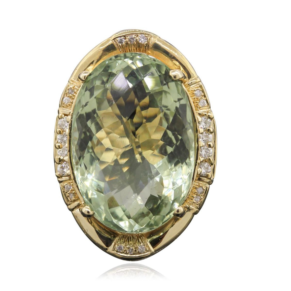 One electronically tested 14KT yellow gold ladies cast green quartz and diamond ring with a bright polish finish. Condition is new, good workmanship. The featured green quartz is set within a diamond bezel, supported by split shoulders and completed by a three and one-half millimeter wide band. Identified with markings of "K14". Containing: One prong set oval mixed cut natural green quartz, measuring 23.30 x 15.80 x 12.50mm, 8%. bulge factor, approximate weight of 27.45ct., clarity is eye clean, medium, very slightly grayish, very slightly bluish green color, (GIA vslbG 5/3), cut is good. Transmitting light with no distortion, transparent. Colored Stone Grading Report attached. Graded in the setting Eight prong set round brilliant cut diamonds, measuring 2.00 - 1.90 x 1.17mm (depth est.) approximate total weight of 8 Stones = 0.31ct. Graded in the setting. Clarity: I-1 to I-2 . Color: G - I Fourteen bead set round brilliant cut diamonds, measuring 1.10 - 1.00 x 0.63mm (depth est.) approximate total weight of 14 Stones = 0.60ct. Graded in the setting. Clarity: I-2 to I-3 . Color: G - I. Total Weight of Colored Stones 27.45ct. Total Weight of Diamonds 0.91ct. Total Weight of Ring 13.80 grams. AIG Appraised at $4,105.00.