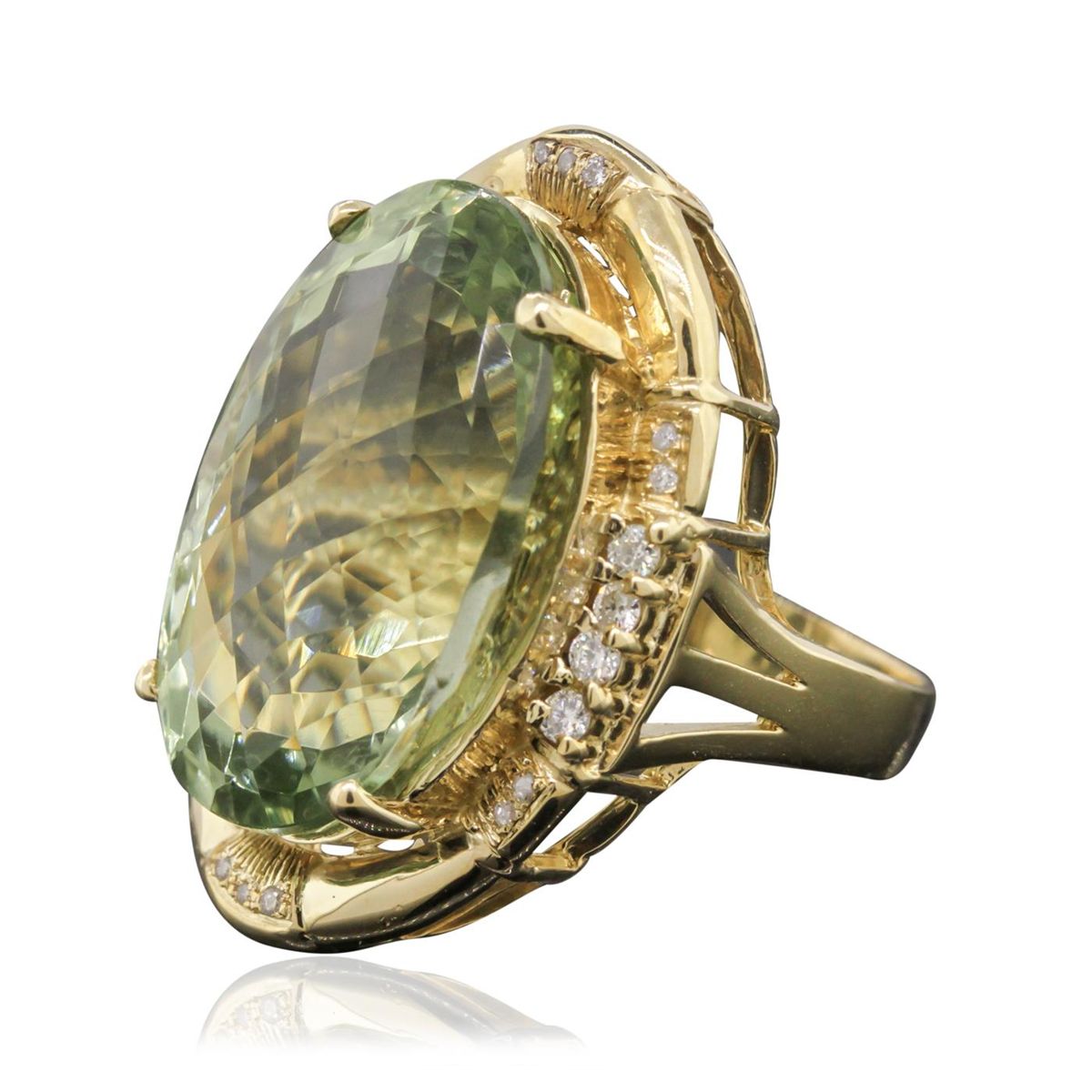 One electronically tested 14KT yellow gold ladies cast green quartz and diamond ring with a bright polish finish. Condition is new, good workmanship. The featured green quartz is set within a diamond bezel, supported by split shoulders and completed by a three and one-half millimeter wide band. Identified with markings of "K14". Containing: One prong set oval mixed cut natural green quartz, measuring 23.30 x 15.80 x 12.50mm, 8%. bulge factor, approximate weight of 27.45ct., clarity is eye clean, medium, very slightly grayish, very slightly bluish green color, (GIA vslbG 5/3), cut is good. Transmitting light with no distortion, transparent. Colored Stone Grading Report attached. Graded in the setting Eight prong set round brilliant cut diamonds, measuring 2.00 - 1.90 x 1.17mm (depth est.) approximate total weight of 8 Stones = 0.31ct. Graded in the setting. Clarity: I-1 to I-2 . Color: G - I Fourteen bead set round brilliant cut diamonds, measuring 1.10 - 1.00 x 0.63mm (depth est.) approximate total weight of 14 Stones = 0.60ct. Graded in the setting. Clarity: I-2 to I-3 . Color: G - I. Total Weight of Colored Stones 27.45ct. Total Weight of Diamonds 0.91ct. Total Weight of Ring 13.80 grams. AIG Appraised at $4,105.00.