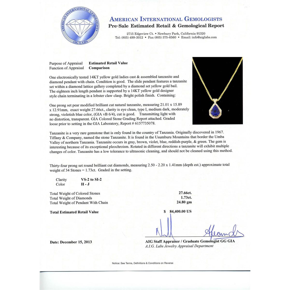 One electronically tested 14KT yellow gold ladies cast & assembled tanzanite and diamond pendant with chain. The slide pendant features a tanzanite set within a diamond lattice gallery completed by a diamond set yellow gold bail. The eighteen inch length pendant is supported by a 14KT yellow gold designer style chain terminating in a lobster claw clasp. Bright polish finish. Condition is good. Containing: One prong set pear modified brilliant cut natural tanzanite, measuring 21.01 x 15.89 x 12.91mm, exact weight 27.66ct., clarity is eye clean, type I, medium dark, moderately strong, violetish blue color, (GIA vB 6/4), cut is good. Transmitting light with no distortion, transparent. GIA Colored Stone Grading Report attached. Graded loose prior to setting in the GIA Laboratory, Report # 6157735078.Tanzanite is a very rare gemstone that is only found in the country of Tanzania. Originally discovered in 1967. Tiffany & Company, named the stone Tanzanite. It is found in the Usumburu Mountains that border the Umba Valley of northern Tanzania. Tanzanite occurs in gray, brown, violet, blue, reddish-purple, & green. The gem is interesting because of its exceptional pleochroism. Rotated in different directions a tanzanite will exhibit multiple changes of color. Tanzanite has a low tolerance to ultrasonic cleaning, and should not be cleaned using this method.Thirty-Four prong set round brilliant cut diamonds, measuring 2.50 - 2.20 x 1.41mm (depth est.) approximate. Total Weight of 34 Stones = 1.73ct. Graded in the setting. Clarity: VS-2 to SI-2. Color: H - J. Total Weight of Colored Stones 27.66ct.. Total Weight of Diamonds 1.73ct. AIG Appraised at $84,400.00.