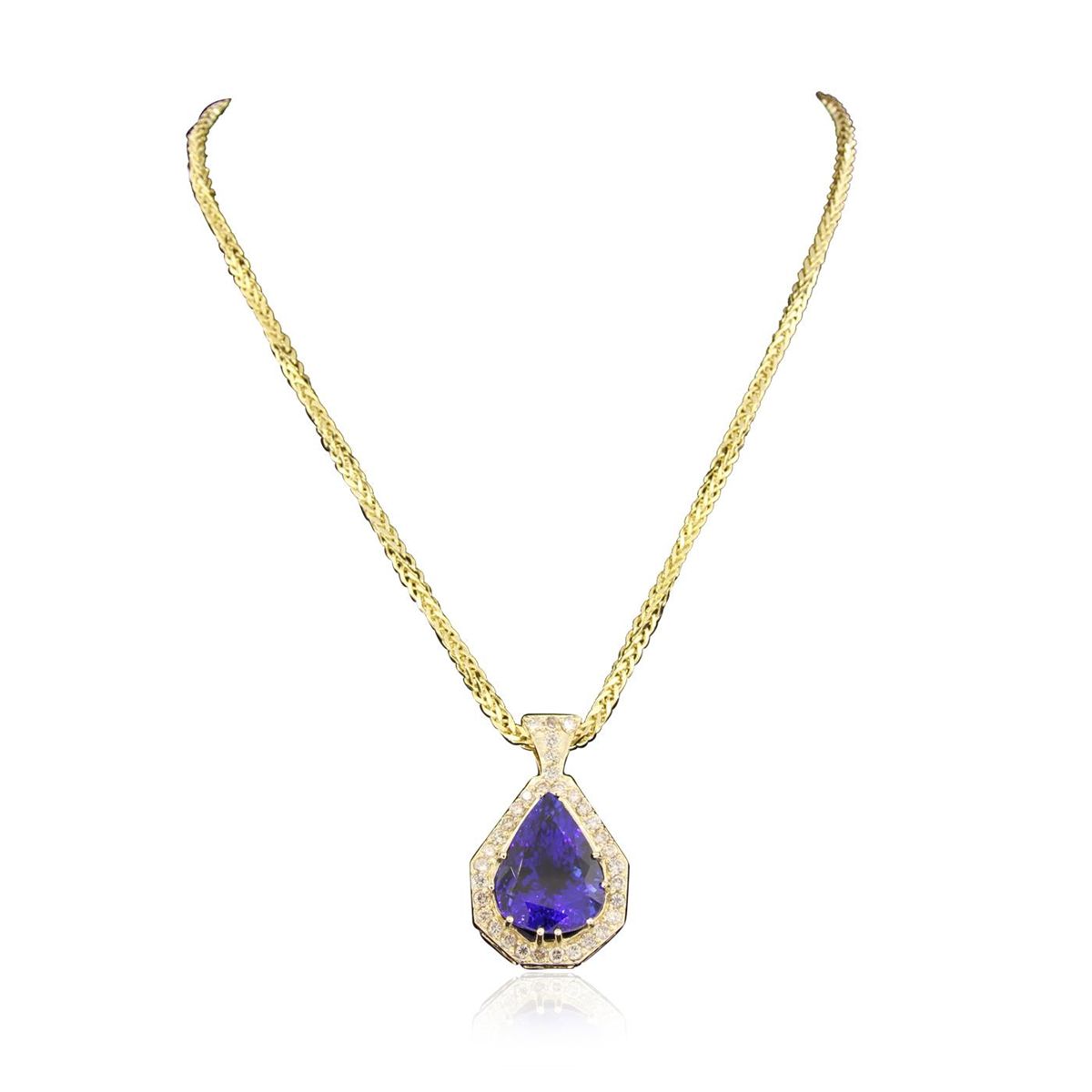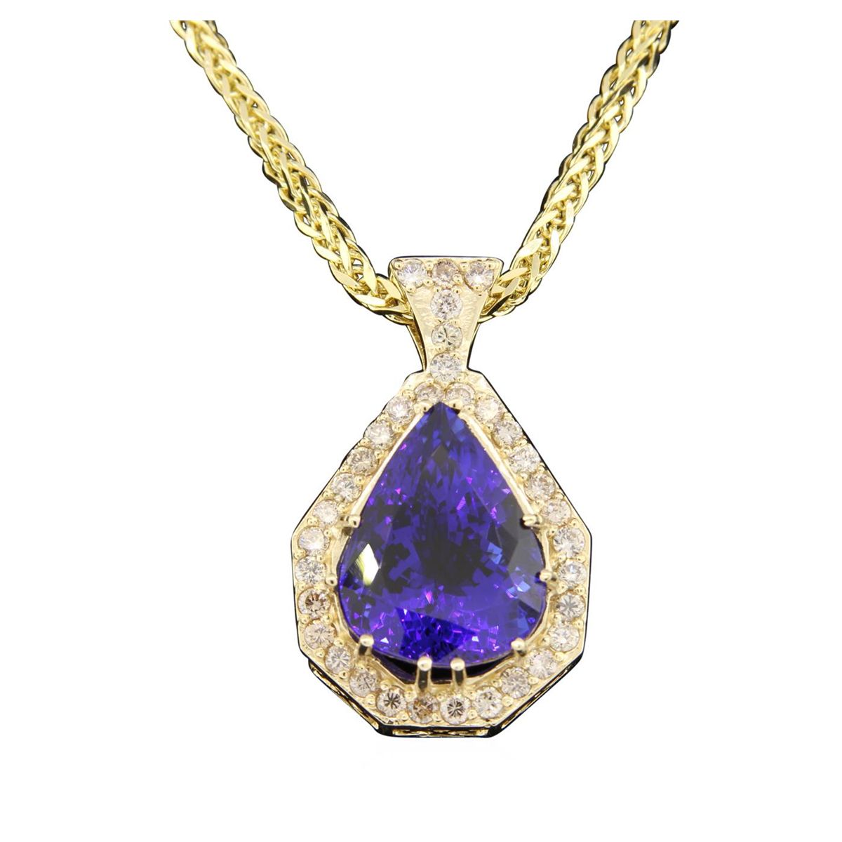 One electronically tested 14KT yellow gold ladies cast & assembled tanzanite and diamond pendant with chain. The slide pendant features a tanzanite set within a diamond lattice gallery completed by a diamond set yellow gold bail. The eighteen inch length pendant is supported by a 14KT yellow gold designer style chain terminating in a lobster claw clasp. Bright polish finish. Condition is good. Containing: One prong set pear modified brilliant cut natural tanzanite, measuring 21.01 x 15.89 x 12.91mm, exact weight 27.66ct., clarity is eye clean, type I, medium dark, moderately strong, violetish blue color, (GIA vB 6/4), cut is good. Transmitting light with no distortion, transparent. GIA Colored Stone Grading Report attached. Graded loose prior to setting in the GIA Laboratory, Report # 6157735078.Tanzanite is a very rare gemstone that is only found in the country of Tanzania. Originally discovered in 1967. Tiffany & Company, named the stone Tanzanite. It is found in the Usumburu Mountains that border the Umba Valley of northern Tanzania. Tanzanite occurs in gray, brown, violet, blue, reddish-purple, & green. The gem is interesting because of its exceptional pleochroism. Rotated in different directions a tanzanite will exhibit multiple changes of color. Tanzanite has a low tolerance to ultrasonic cleaning, and should not be cleaned using this method.Thirty-Four prong set round brilliant cut diamonds, measuring 2.50 - 2.20 x 1.41mm (depth est.) approximate. Total Weight of 34 Stones = 1.73ct. Graded in the setting. Clarity: VS-2 to SI-2. Color: H - J. Total Weight of Colored Stones 27.66ct.. Total Weight of Diamonds 1.73ct. AIG Appraised at $84,400.00.