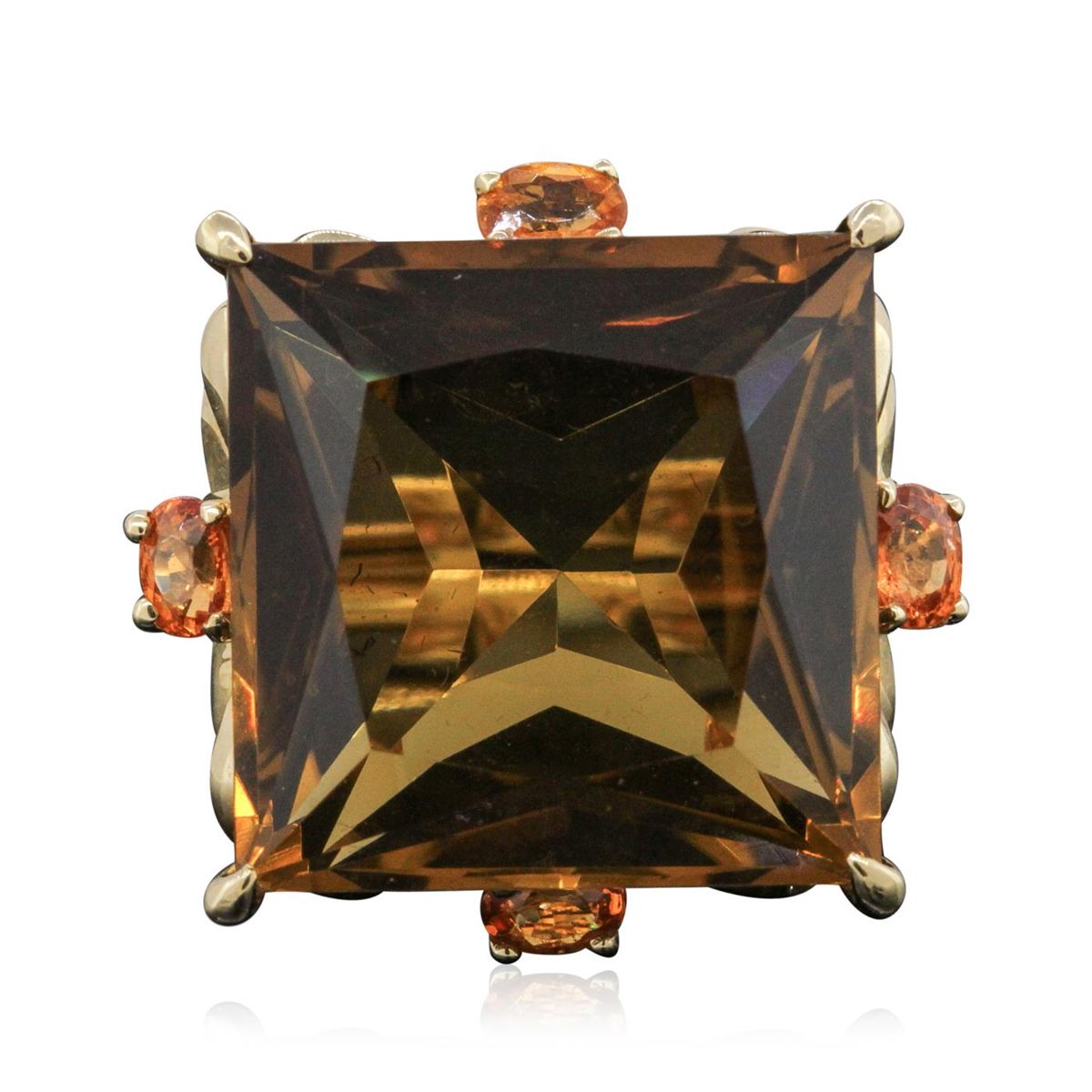 One ring featuring: 14KT yellow gold weighing 4.70 grams containing one champagne quartz with a total weight of 27.71ct and four orange sapphires with a total weight of 1.00cts.