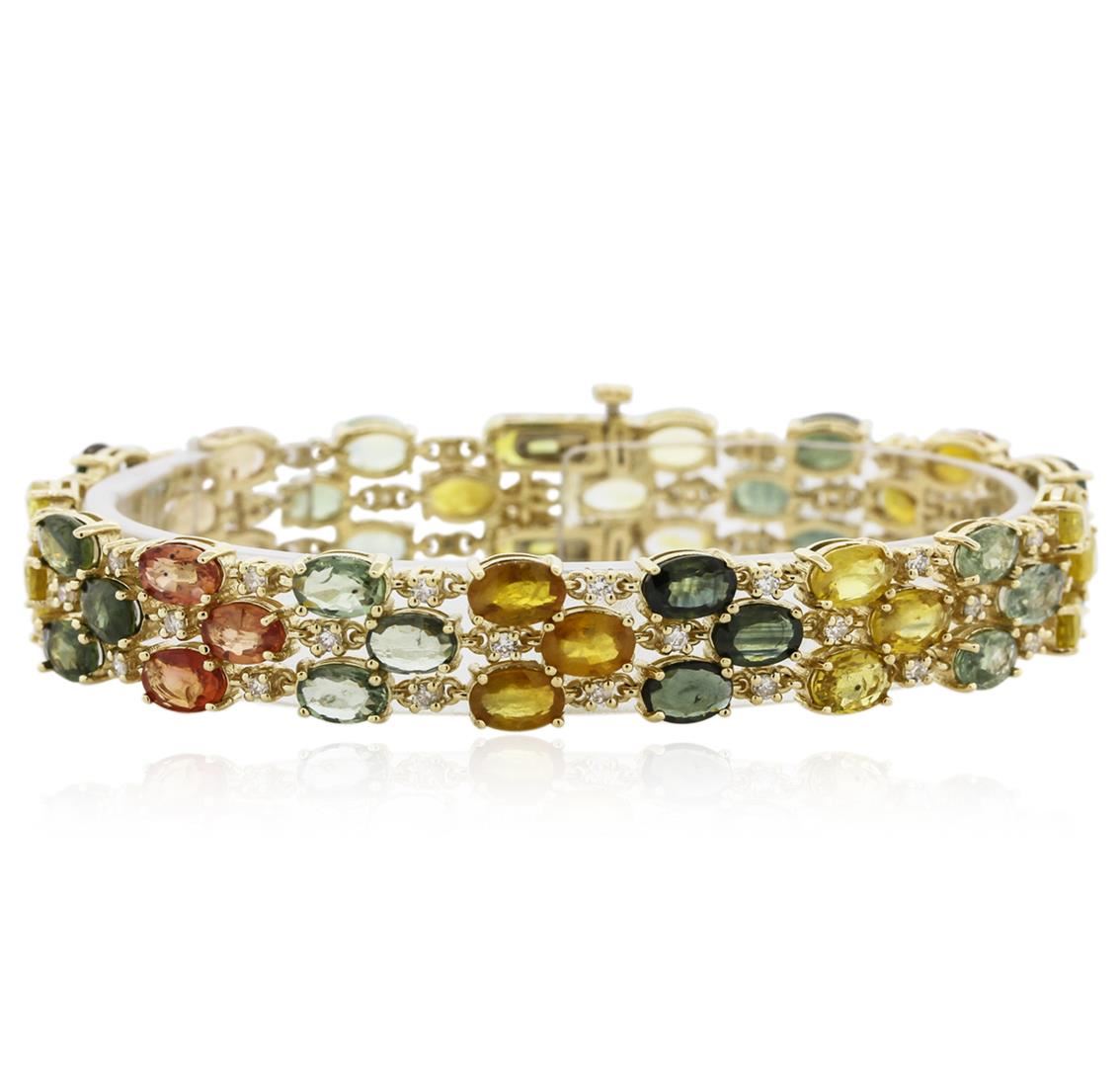 One electronically tested 14KT yellow gold ladies combination cast & assembled sapphire and diamond bracelet with a hidden box clasp with a bright polish finish. Bracelet measures 7-1/2" in length and 1/2" width. Condition is new. Containing: Fifty-one prong set oval modified brilliant cut natural sapphires, measuring 5.90 x 4.00 x 2.60mm, exact total weight 28.17ct., clarity is slightly included, type II, medium light, brownish, green, orange, pink and yellow color, (GIA Y 4/3), cut is good. Fifty-One prong set round brilliant cut diamonds, measuring 1.50 - 1.50 x 0.90mm (depth est.) approximate total weight of 51 Stones = 0.97ct. Clarity: SI-1 to SI-2. Color: J - K, Cut is Good. All diamonds and colored gemstones are graded in the mounting, unless otherwise stated. Colored gemstones are presumed to have been subjected to commonly used enhancement processes.. Total Weight of Colored Stones 28.17ct. Total Weight of Diamonds 0.97ct. Total Weight of Bracelet 25.90 grams. GGL Appraised at $8,410.00.