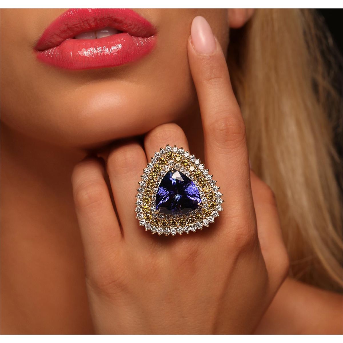 One electronically tested 14KT yellow gold Ladies combination cast & assembled ring with a bright polish finish. Condition is new. Identified with markings of "14K". Containing: One prong set triangle modified brilliant cut natural tanzanite, measuring 18.81 x 19.00 x 13.47mm, approximate weight of 28.41ct., clarity is eye clean, type I, medium, moderately strong, bluish violet color, (GIA bV 5/4), cut is very good. GIA Report: 6157962263. Sixty-Five prong set round brilliant cut diamonds, measuring 2.50 - 2.50 x 1.50mm (depth est.) approximate. Total Weight of 65 Stones = 3.71ct. Clarity: SI-2 to I-1. Color: I - J, Cut is Good. Twenty-Four prong set round brilliant cut diamonds, measuring 3.00 - 3.00 x 1.80mm (depth est.) approximate. Total Weight of 24 Stones = 2.37ct. Clarity: SI-1, Cut is Very Good. Color of the stones has been enhanced. Total Weight of Colored Stones 28.41ct. Total Weight of Diamonds 6.08ct. Total Weight of Ring 29.50 grams. GGLAppraised at $55,720.00.