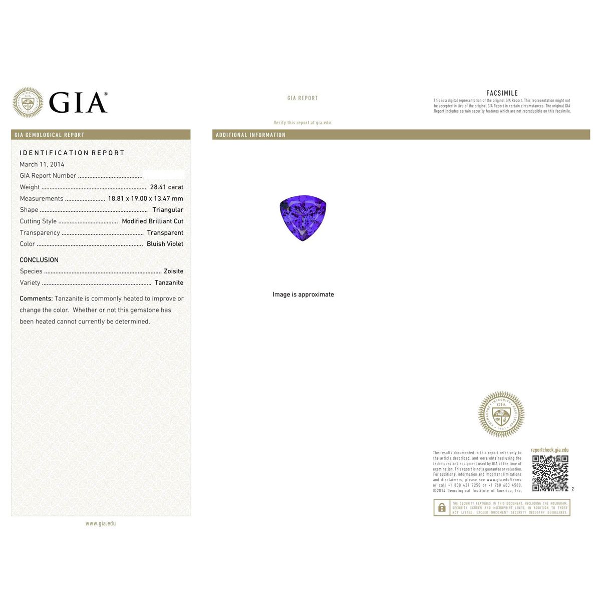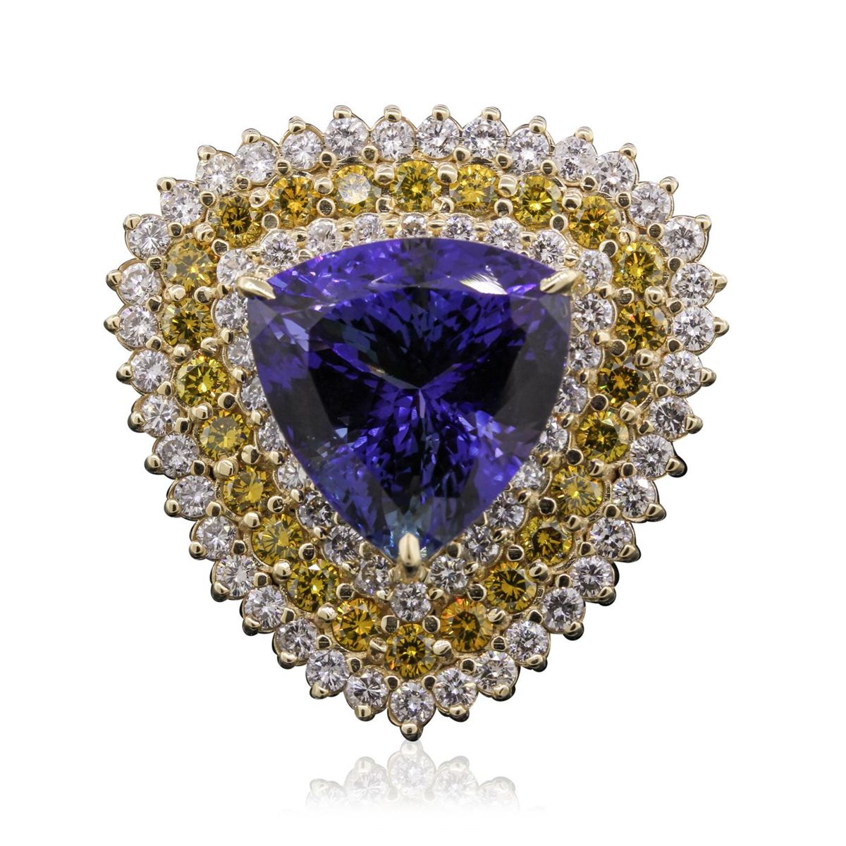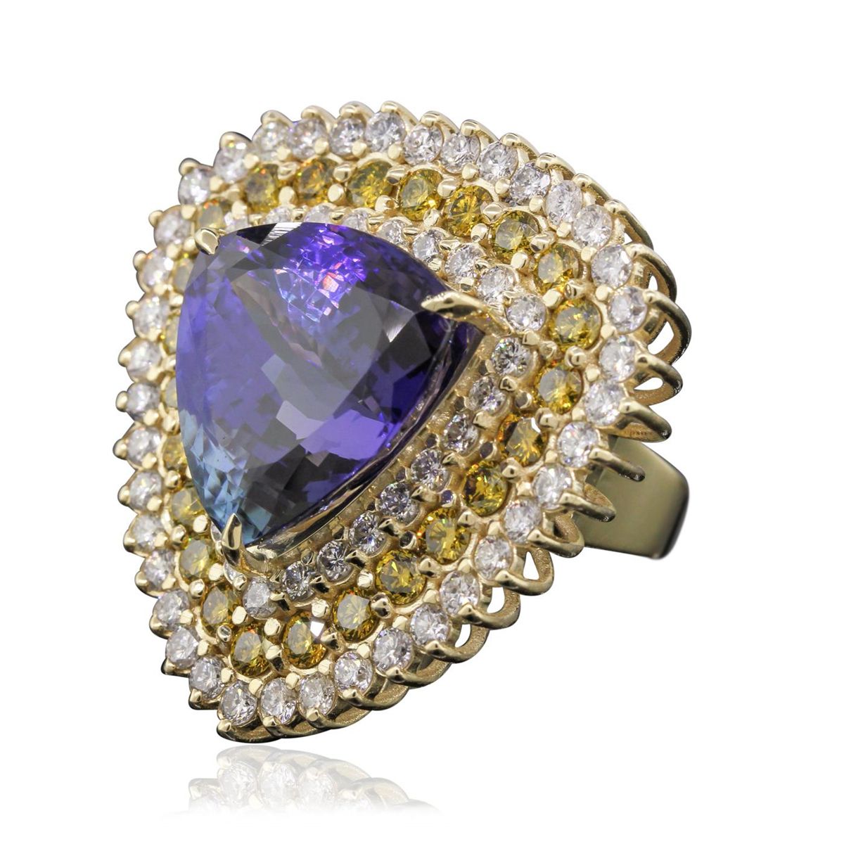 One electronically tested 14KT yellow gold Ladies combination cast & assembled ring with a bright polish finish. Condition is new. Identified with markings of "14K". Containing: One prong set triangle modified brilliant cut natural tanzanite, measuring 18.81 x 19.00 x 13.47mm, approximate weight of 28.41ct., clarity is eye clean, type I, medium, moderately strong, bluish violet color, (GIA bV 5/4), cut is very good. GIA Report: 6157962263. Sixty-Five prong set round brilliant cut diamonds, measuring 2.50 - 2.50 x 1.50mm (depth est.) approximate. Total Weight of 65 Stones = 3.71ct. Clarity: SI-2 to I-1. Color: I - J, Cut is Good. Twenty-Four prong set round brilliant cut diamonds, measuring 3.00 - 3.00 x 1.80mm (depth est.) approximate. Total Weight of 24 Stones = 2.37ct. Clarity: SI-1, Cut is Very Good. Color of the stones has been enhanced. Total Weight of Colored Stones 28.41ct. Total Weight of Diamonds 6.08ct. Total Weight of Ring 29.50 grams. GGL Appraised at $55,720.00.