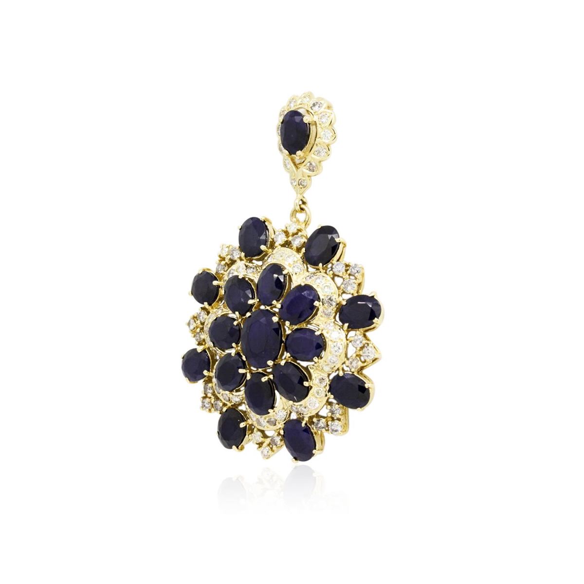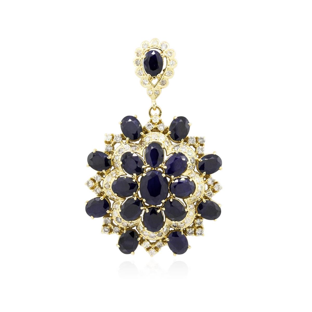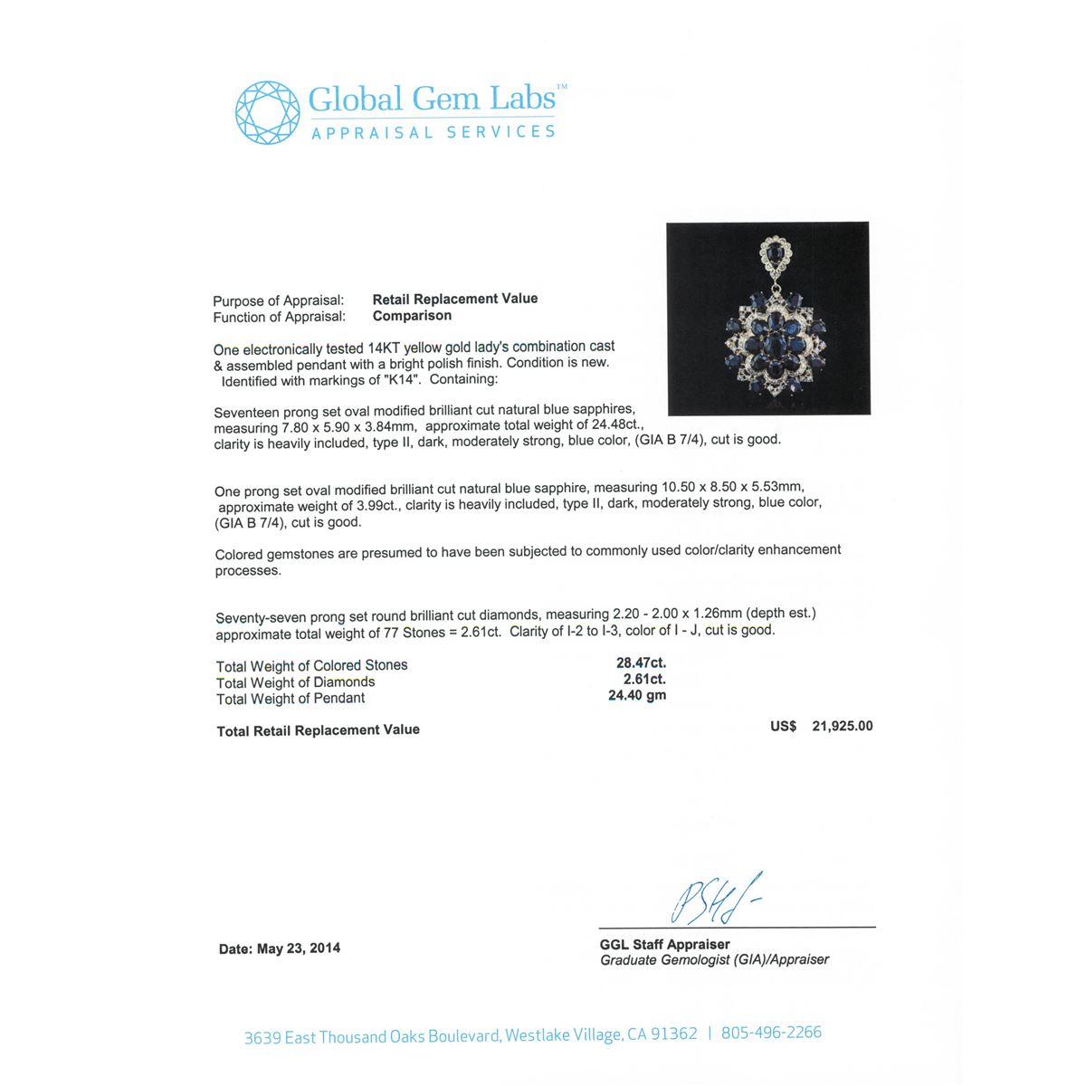 One electronically tested 14KT yellow gold Ladies combination cast & assembled pendant with a bright polish finish. Condition is new. Identified with markings of "K14". Containing: Seventeen prong set oval modified brilliant cut natural blue sapphires, measuring 7.80 x 5.90 x 3.84mm, approximate. Total Weight of 24.48ct., clarity is heavily included, type II, dark, moderately strong, blue color, (GIA B 7/4), cut is good. One prong set oval modified brilliant cut natural blue sapphire, measuring 10.50 x 8.50 x 5.53mm, approximate weight of 3.99ct., clarity is heavily included, type II, dark, moderately strong, blue color, (GIA B 7/4), cut is good. Colored gemstones are presumed to have been subjected to commonly used color/clarity enhancement processes. Seventy-Seven prong set round brilliant cut diamonds, measuring 2.20 - 2.00 x 1.26mm (depth est.) approximate. Total Weight of 77 Stones = 2.61ct. Clarity: I-2 to I-3. Color: I - J, Cut is Good. Total Weight of Colored Stones 28.47ct. Total Weight of Diamonds 2.61ct. Total Weight of Pendant 24.40 grams. GGL Appraised at $21,925.00.