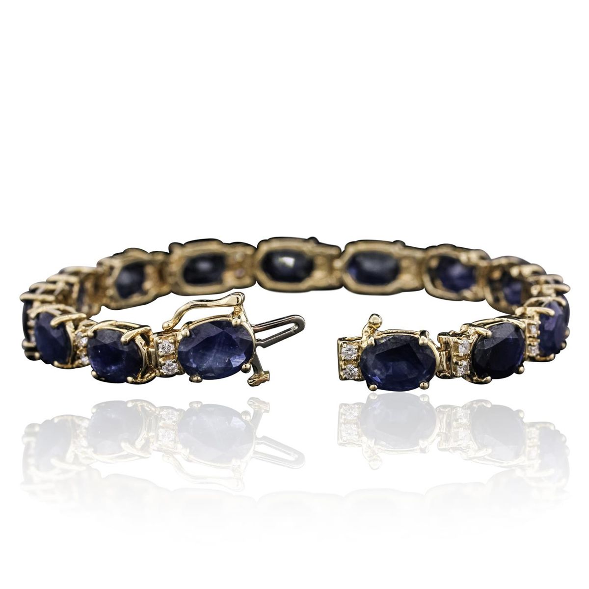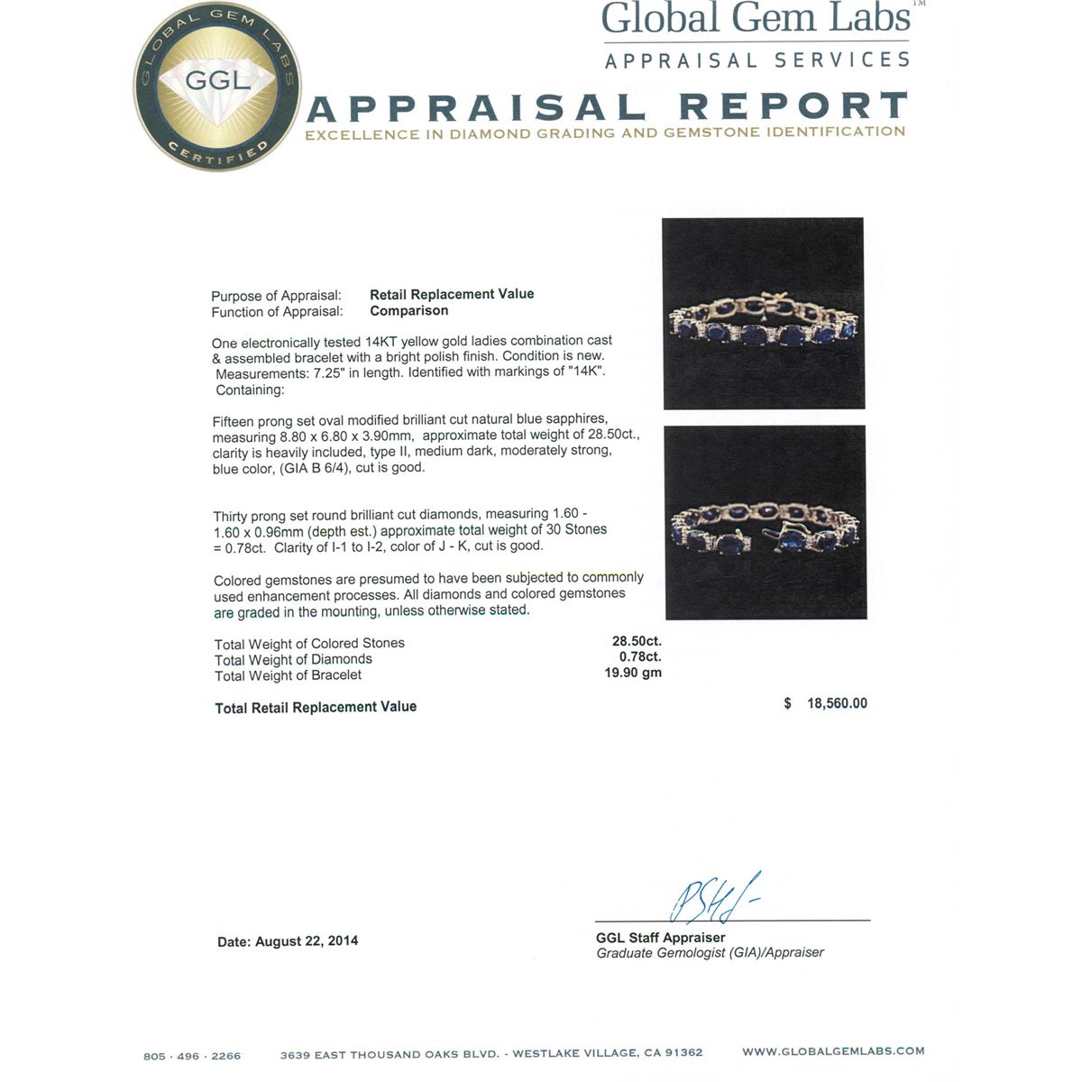 14KT Yellow Gold 28.50ctw Sapphire and Diamond Bracelet. One electronically tested 14KT yellow gold ladies combination cast & assembled bracelet with a bright polish finish. Measurements: 7.25" in length. Identified with markings of "14K". Condition is new. Containing: Fifteen prong set oval modified brilliant cut natural blue sapphires, measuring 8.80 x 6.80 x 3.90mm, approximate total weight of 28.50ct., clarity is heavily included, type II, medium dark, moderately strong, blue color, (GIA B 6/4), cut is good. Thirty prong set round brilliant cut diamonds, measuring 1.60 - 1.60 x 0.96mm (depth est.) approximate total weight of 30 Stones = 0.78ct. Clarity: I-1 to I-2. Color: J - K, Cut is Good. Colored gemstones are presumed to have been subjected to commonly used enhancement processes. All diamonds and colored gemstones are graded in the mounting, unless otherwise stated. Total Weight of Colored Stones 28.50ct. Total Weight of Diamonds 0.78ct. Total Weight of Bracelet 19.90 grams. GGL Appraised at $18,560.00.