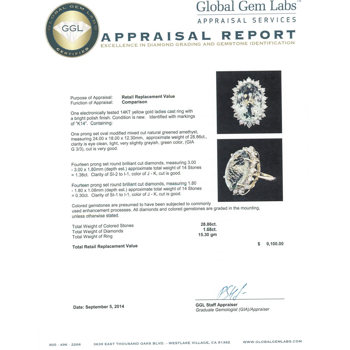 One electronically tested 14KT yellow gold ladies cast ring with a bright polish finish. Identified with markings of "K14". Condition is new. Containing: One prong set oval modified mixed cut natural greened amethyst, measuring 24.00 x 18.00 x 12.30mm, approximate weight of 28.86ct., clarity is eye clean, light, very slightly grayish, green color, (GIA G 3/3), cut is very good. Fourteen prong set round brilliant cut diamonds, measuring 3.00 - 3.00 x 1.80mm (depth est.) approximate total weight of 14 Stones = 1.38ct. Clarity: SI-2 to I-1. Color: J - K, Cut is Good. Fourteen prong set round brilliant cut diamonds, measuring 1.80 - 1.80 x 1.08mm (depth est.) approximate total weight of 14 Stones = 0.30ct. Clarity: SI-1 to I-1. Color: J - K, Cut is Good. Colored gemstones are presumed to have been subjected to commonly used enhancement processes. All diamonds and colored gemstones are graded in the mounting, unless otherwise stated. Total Weight of Colored Stones 28.86ct. Total Weight of Diamonds 1.68ct. Total Weight of Ring 15.30 grams. GGL Appraised at $9,100.00.