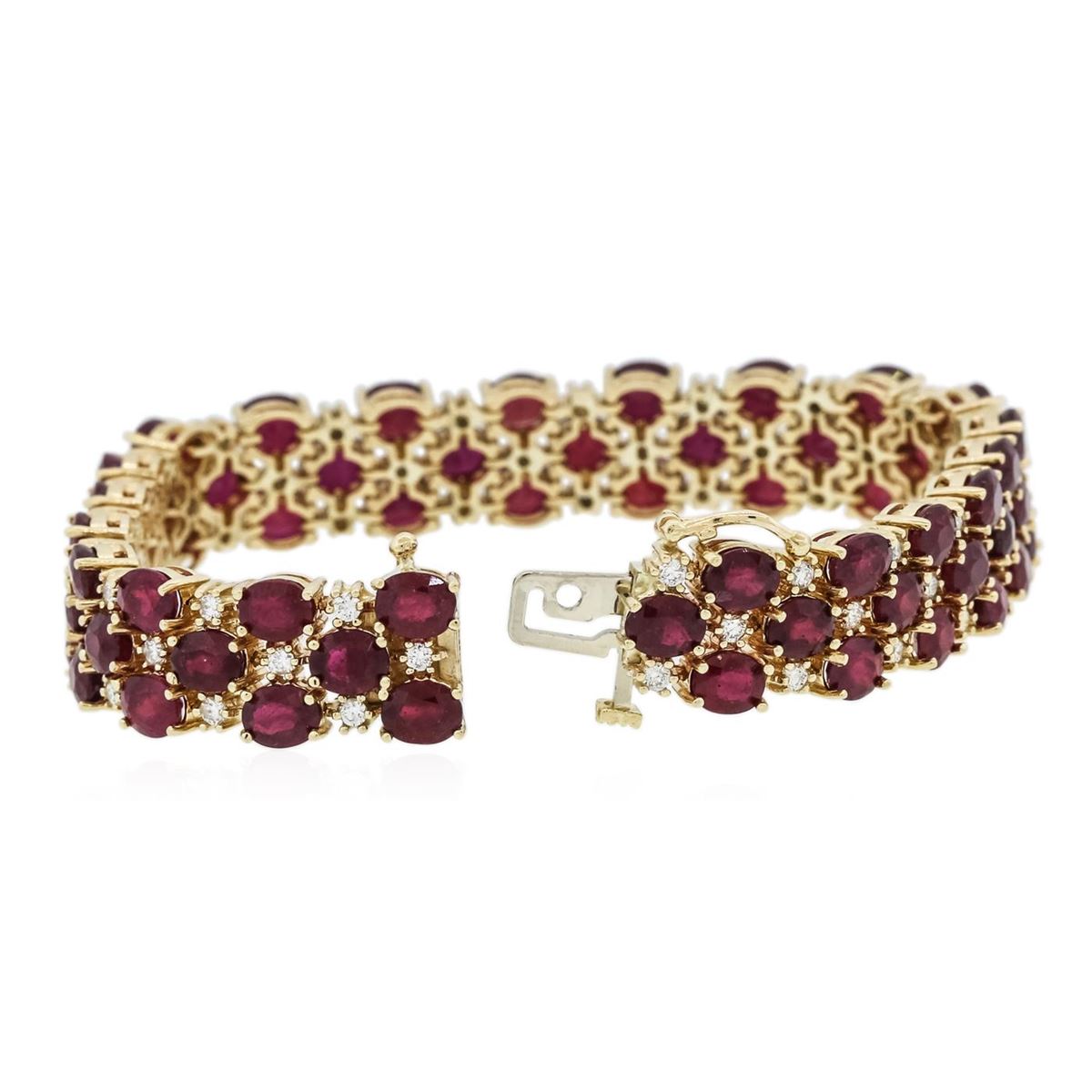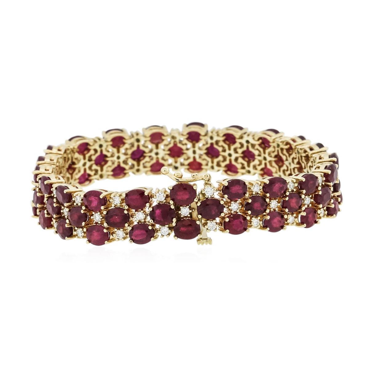 One electronically tested 14KT yellow gold ladies combination cast & assembled ruby and diamond bracelet with a hidden box clasp with a bright polish finish. Measurements: 7" in length. Identified with markings of "14K". Condition is new. Containing: Sixty-three prong set oval modified brilliant cut natural rubies, measuring 5.00 x 4.20 x 2.72mm, approximate total weight of 28.98ct., clarity is heavily included, type II, medium, moderately strong, red color, (GIA R 5/4), cut is good. Sixty-Three prong set round brilliant cut diamonds, measuring 1.50 - 1.50 x 0.90mm (depth est.) approximate total weight of 63 Stones = 0.78ct. Clarity: SI-1 to SI-2. Color: K - L, Cut is Good. Colored gemstones are presumed to have been subjected to commonly used enhancement processes. All diamonds and colored gemstones are graded in the mounting, unless otherwise stated. Total Weight of Colored Stones 28.98ct. Total Weight of Diamonds 0.78ct. Total Weight of Bracelet 34.20 grams. GGL Appraised at $23,045.00.
