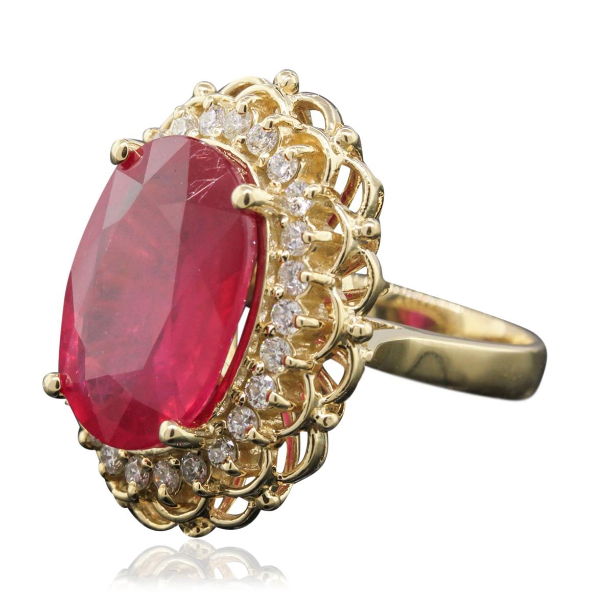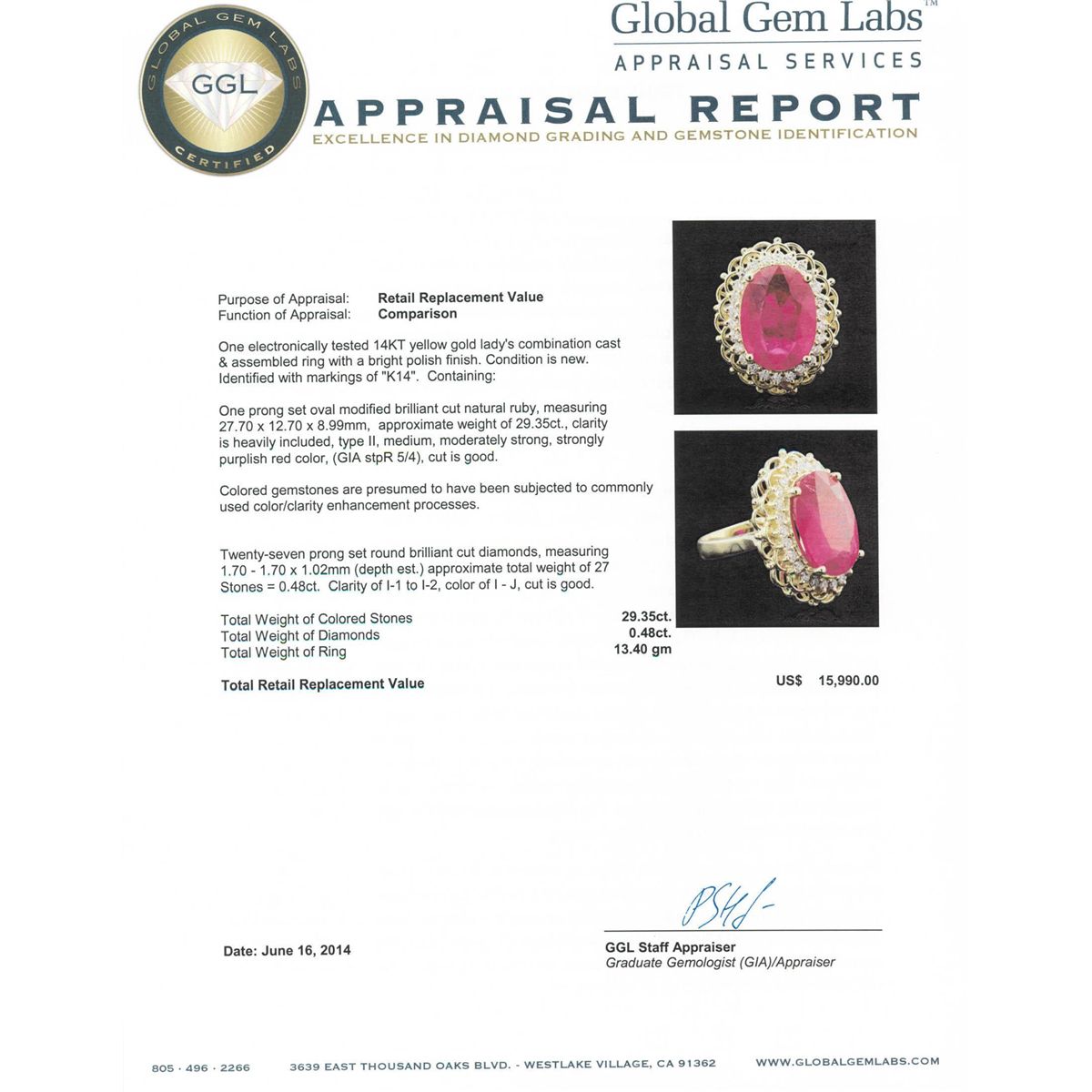 One electronically tested 14KT yellow gold Ladies combination cast & assembled ring with a bright polish finish. Condition is new. Identified with markings of "K14". Containing: One prong set oval modified brilliant cut natural ruby, measuring 27.70 x 12.70 x 8.99mm, approximate weight of 29.35ct., clarity is heavily included, type II, medium, moderately strong, strongly purplish red color, (GIA stpR 5/4), cut is good. Colored gemstones are presumed to have been subjected to commonly used color/clarity enhancement processes. Twenty-Seven prong set round brilliant cut diamonds, measuring 1.70 - 1.70 x 1.02mm (depth est.) approximate. Total Weight of 27 Stones = 0.48ct. Clarity: I-1 to I-2. Color: I - J, Cut is Good. Total Weight of Colored Stones 29.35ct. Total Weight of Diamonds 0.48ct. Total Weight of Ring 13.40 grams. GGL Appraised at $15,990.00.