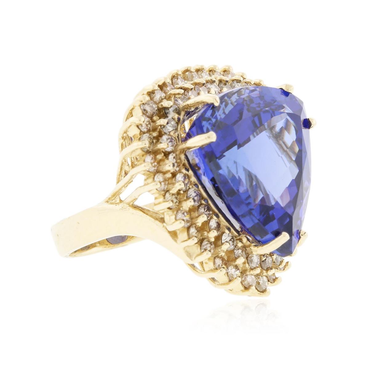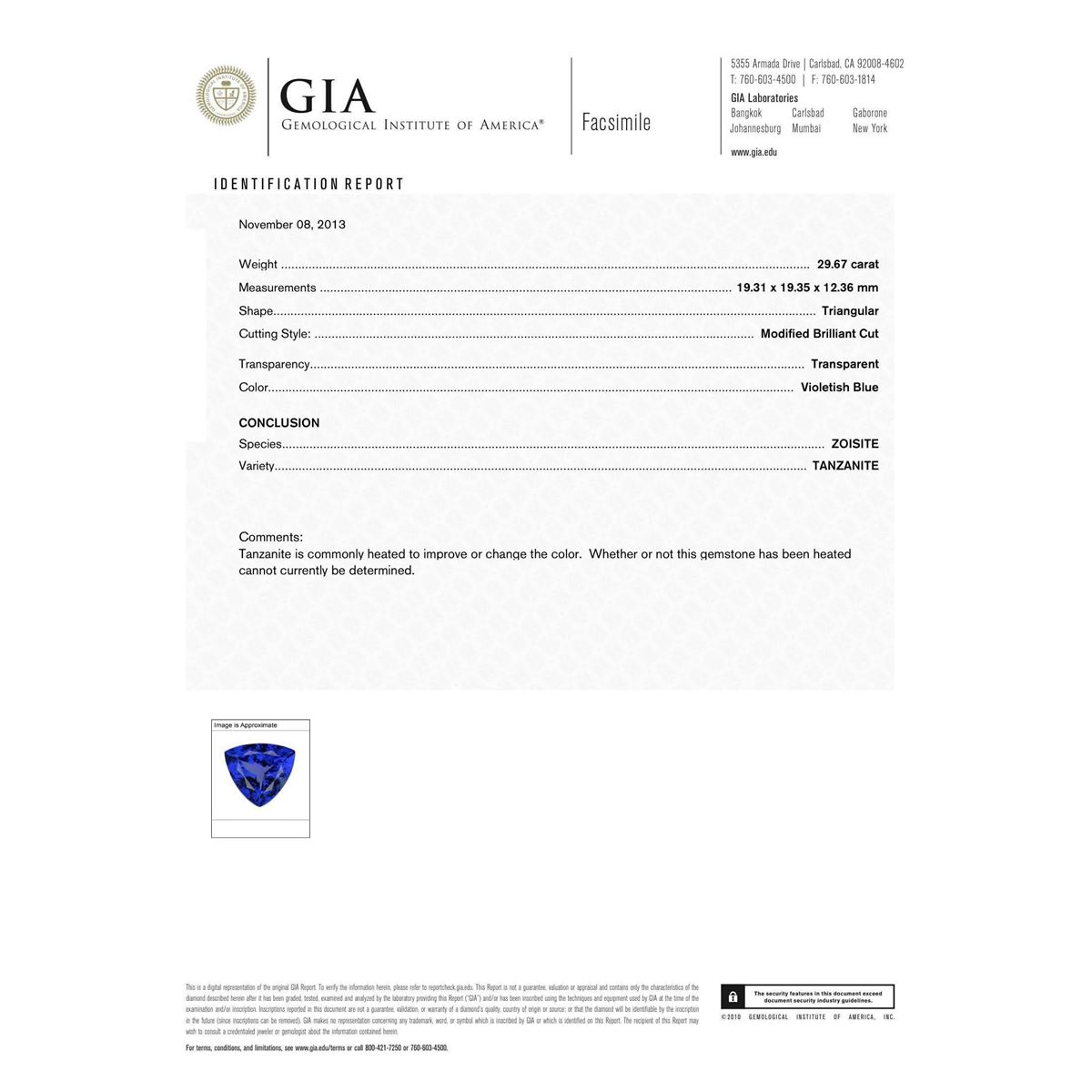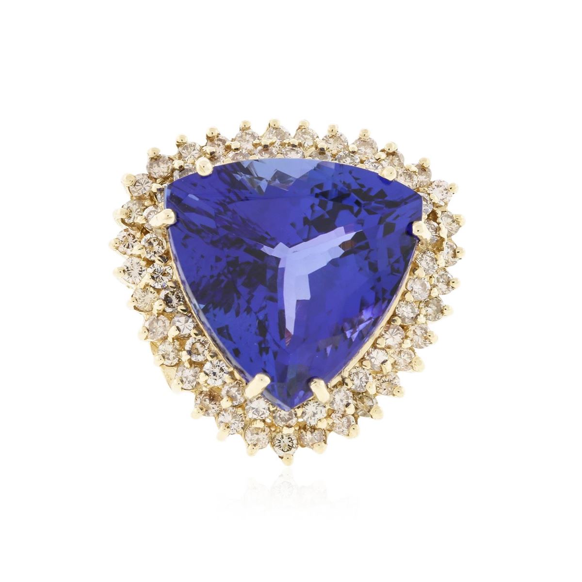 One electronically tested 14KT yellow gold ladies cast tanzanite and diamond ring with a bright polish finish. Condition is new, good workmanship. The featured tanzanite is set within tiered diamond bezels supported by a lattice under gallery, completed by a three and one-half millimeter wide band. Identified with markings of "K14". Containing: One prong set triangular modified brilliant cut natural tanzanite, measuring 19.31 x 19.35 x 12.36mm, exact weight 29.67ct., clarity is eye clean, type I, dark, very slightly grayish, violetish blue color, (GIA vB 7/3), cut is good. Transmitting light with no distortion, transparent. GIA Colored Stone Grading Report attached. Graded loose prior to setting in the GIA Laboratory, Report #6157735278. Tanzanite is a very rare gemstone that is only found in the country of Tanzania. Originally discovered in 1967. Tiffany & Company, named the stone Tanzanite. It is found in the Usumburu Mountains that border the Umba Valley of northern Tanzania. Tanzanite occurs in gray, brown, violet, blue, reddish-purple, & green. The gem is interesting because of its exceptional pleochroism. Rotated in different directions a tanzanite will exhibit multiple changes of color. Tanzanite has a low tolerance to ultrasonic cleaning, and should not be cleaned using this method. Sixty-three prong set round brilliant cut diamonds, measuring 2.20 - 2.00 x 1.26mm (depth est.) approximate total weight of 63 Stones = 2.23ct. Faint brown secondary color throughout. Graded in the setting. Clarity VS-2 to SI-2. Color K - M. Total Weight of Colored Stones 29.67ct. Total Weight of Diamonds 2.23ct. Total Weight of Ring 18.64gm. AIG Appraised at $87,710.00.