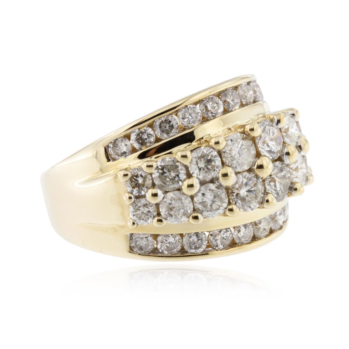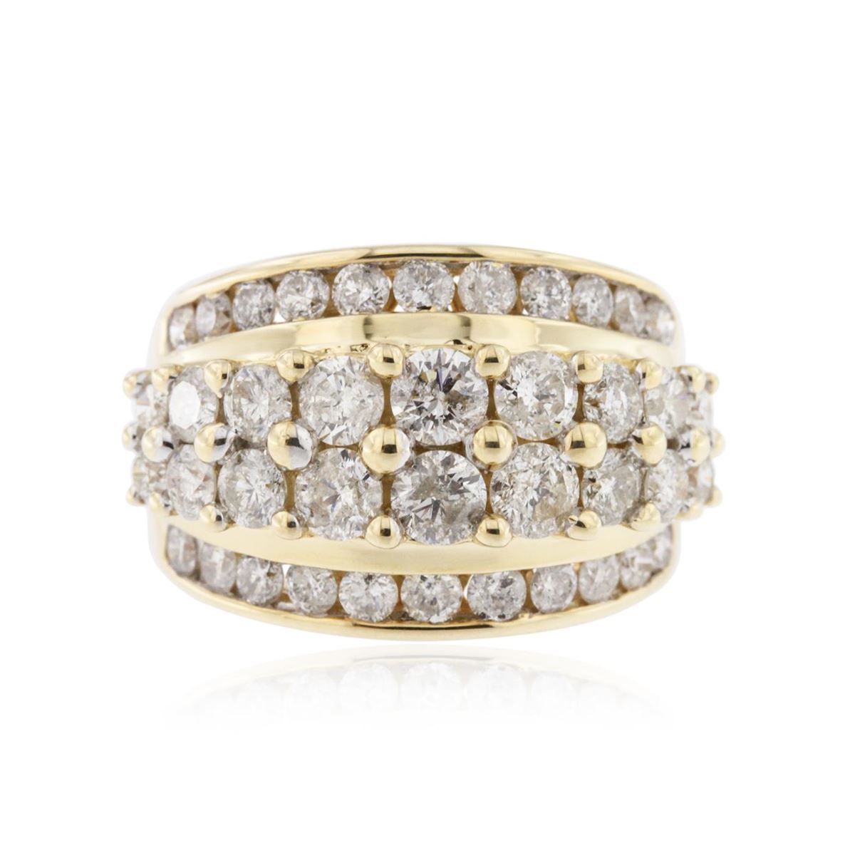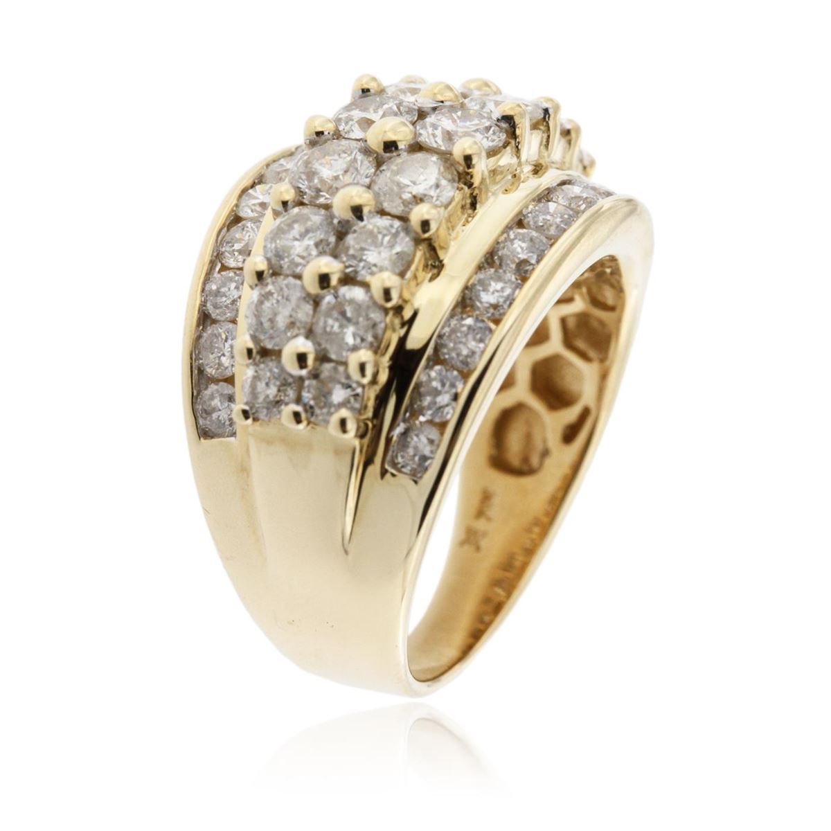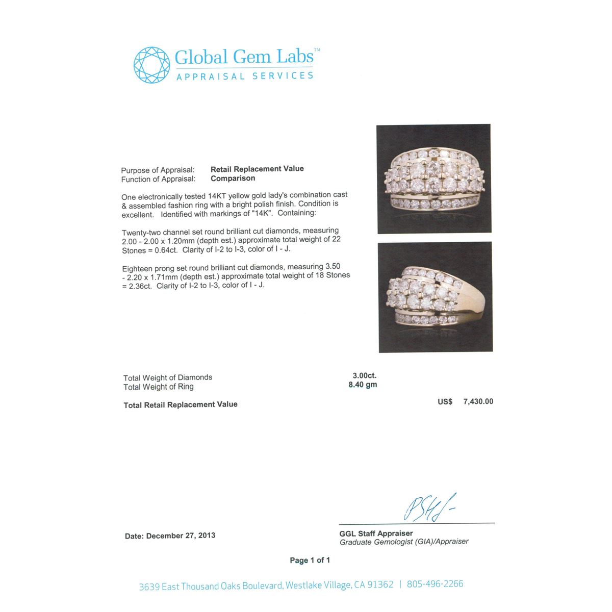 One electronically tested 14KT yellow gold Ladies combination cast & assembled fashion ring with a bright polish finish. Identified with markings of "14K". Condition is excellent. Containing: Twenty-Two channel set round brilliant cut diamonds, measuring 2.00 - 2.00 x 1.20mm (depth est.) approximate total weight of 22 Stones = 0.64ct. Clarity of I-2 to I-3, Color of I - J. Eighteen prong set round brilliant cut diamonds, measuring 3.50 - 2.20 x 1.71mm (depth est.) approximate total weight of 18 Stones = 2.36ct. Clarity of I-2 to I-3, Color of I - J. Total Weight of Diamonds 3.00ct. Total Weight of Ring 8.40gm. GGL Appraised at $7,430.00.