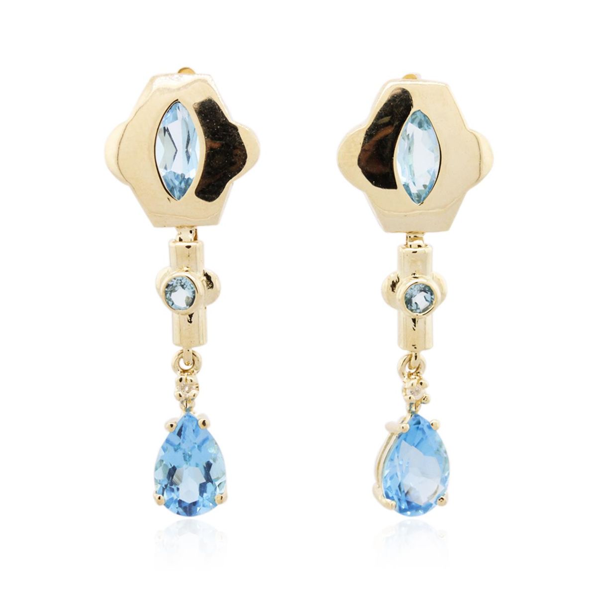 One pair of earrings featuring: 14KT yellow gold weighing 5.30 grams containing blue topaz with a total weight of 3.00cts and diamonds with a total weight of 0.20cts.