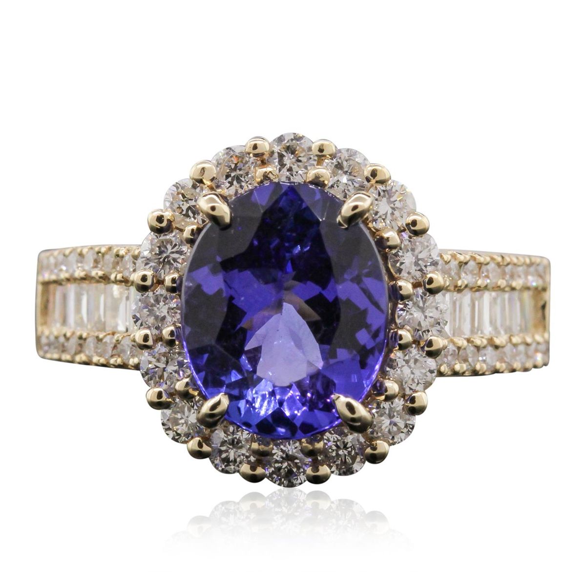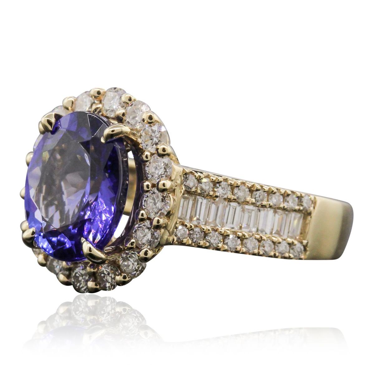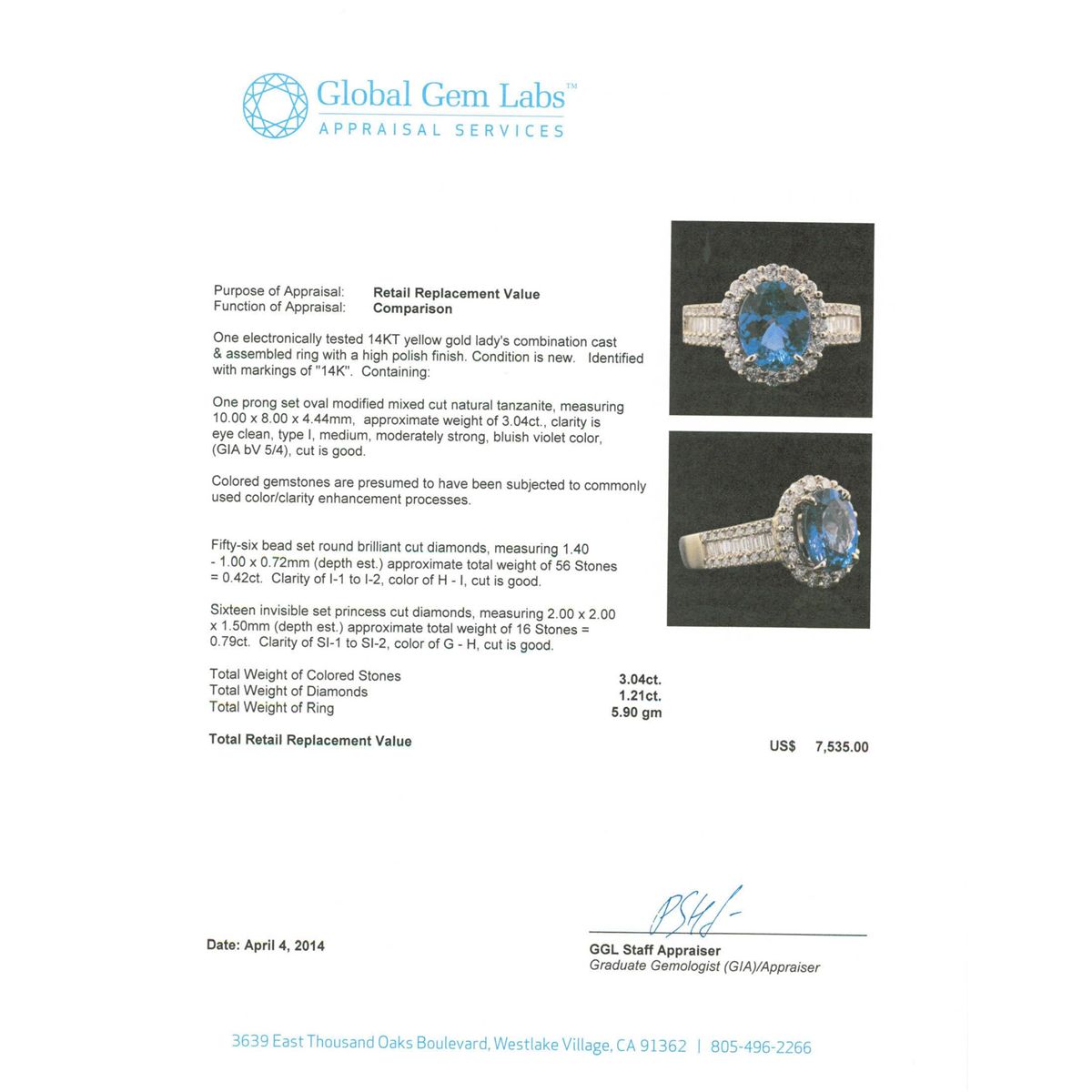 One electronically tested 14KT yellow gold Ladies combination cast & assembled ring with a high polish finish. Condition is new. Identified with markings of "14K". Containing: One prong set oval modified mixed cut natural tanzanite, measuring 10.00 x 8.00 x 4.44mm, approximate weight of 3.04ct., clarity is eye clean, type I, medium, moderately strong, bluish violet color, (GIA bV 5/4), cut is good. Colored gemstones are presumed to have been subjected to commonly used color/clarity enhancement processes. Fifty-Six bead set round brilliant cut diamonds, measuring 1.40 - 1.00 x 0.72mm (depth est.) approximate. Total Weight of 56 Stones = 0.42ct. Clarity: I-1 to I-2. Color: H - I, Cut is Good. Sixteen invisible set princess cut diamonds, measuring 2.00 x 2.00 x 1.50mm (depth est.) approximate. Total Weight of 16 Stones = 0.79ct. Clarity: SI-1 to SI-2. Color: G - H, Cut is Good. Total Weight of Colored Stones 3.04ct. Total Weight of Diamonds 1.21ct. Total Weight of Ring 5.90 grams. GGL Appraised at $7,535.00.