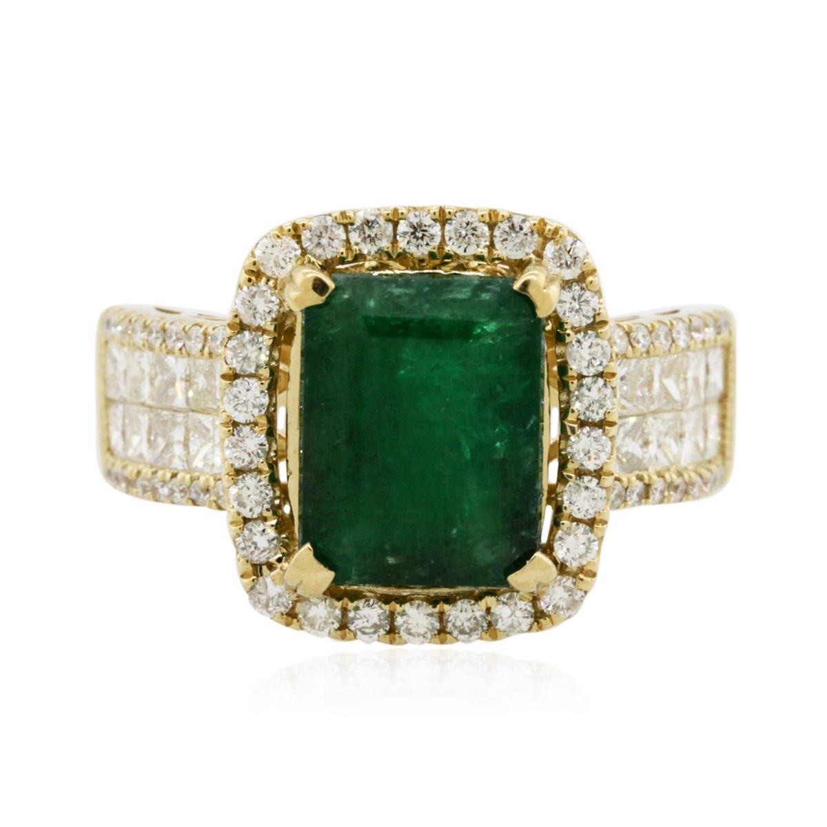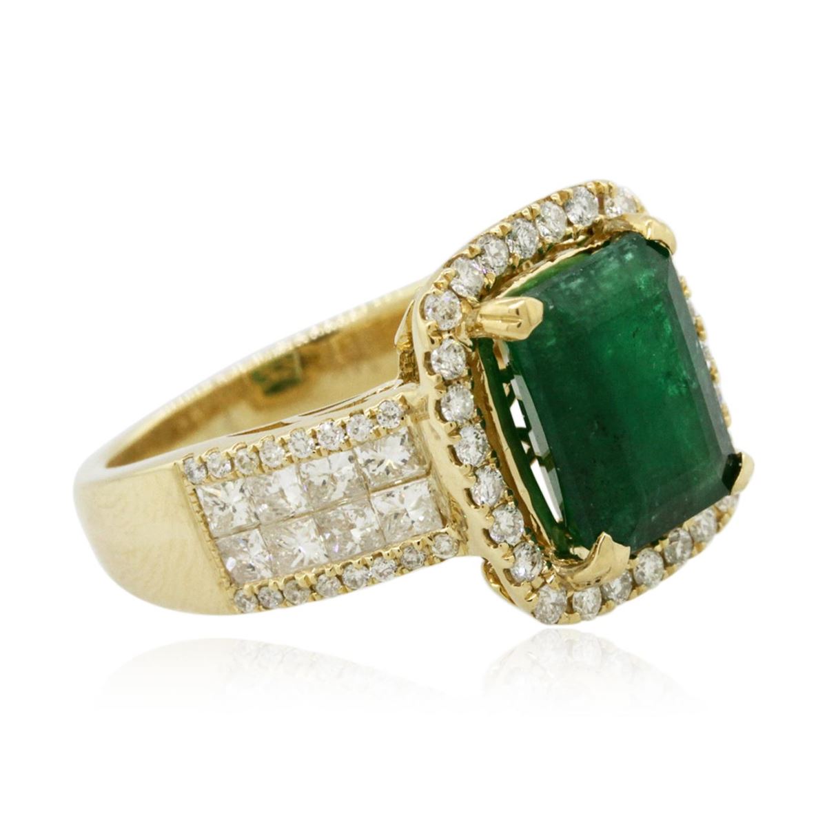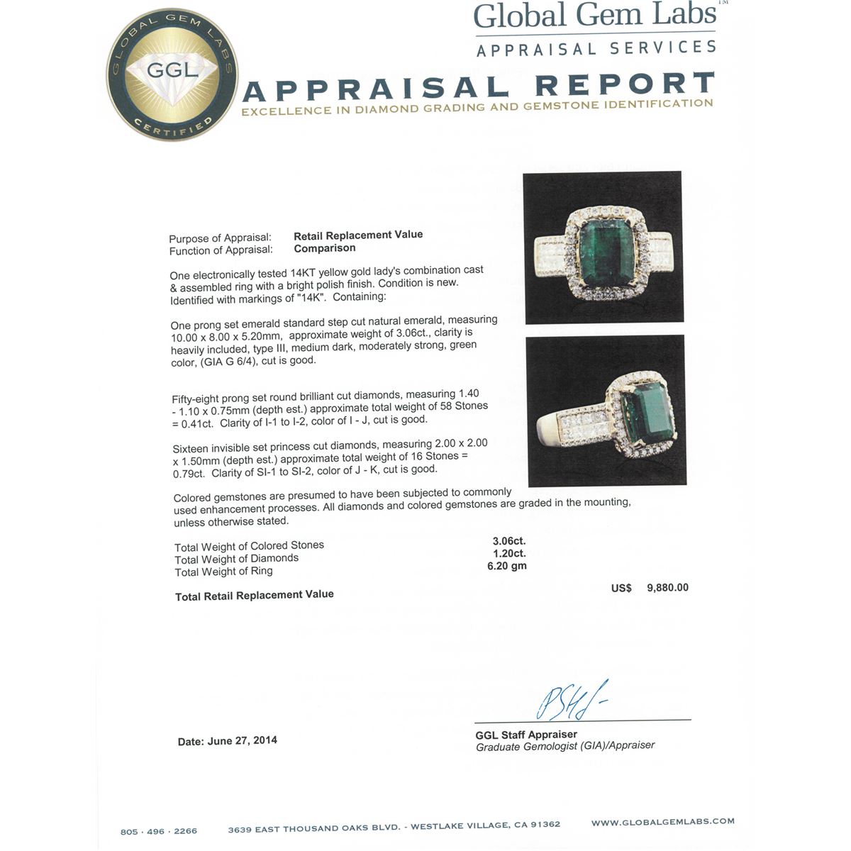 One electronically tested 14KT yellow gold Ladies combination cast & assembled ring with a bright polish finish. Condition is new. Identified with markings of "14K". Containing: One prong set emerald standard step cut natural emerald, measuring 10.00 x 8.00 x 5.20mm, approximate weight of 3.06ct., clarity is heavily included, type III, medium dark, moderately strong, green color, (GIA G 6/4), cut is good. Fifty-Eight prong set round brilliant cut diamonds, measuring 1.40 - 1.10 x 0.75mm (depth est.) approximate total weight of 58 Stones = 0.41ct. Clarity: I-1 to I-2. Color: I - J, Cut is Good. Sixteen invisible set princess cut diamonds, measuring 2.00 x 2.00 x 1.50mm (depth est.) approximate total weight of 16 Stones = 0.79ct. Clarity: SI-1 to SI-2. Color: J - K, Cut is Good. Colored gemstones are presumed to have been subjected to commonly used enhancement processes. All diamonds and colored gemstones are graded in the mounting, unless otherwise stated. Total Weight of Colored Stones 3.06ct. Total Weight of Diamonds 1.20ct. Total Weight of Ring 6.20 grams. GGL Appraised at $9,880.00.