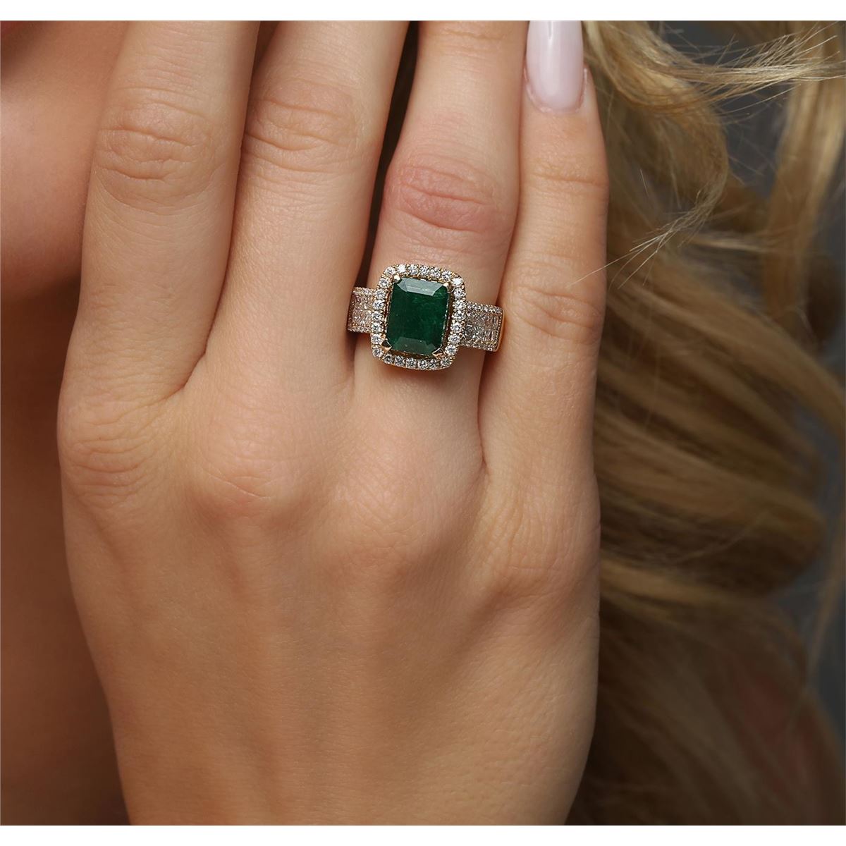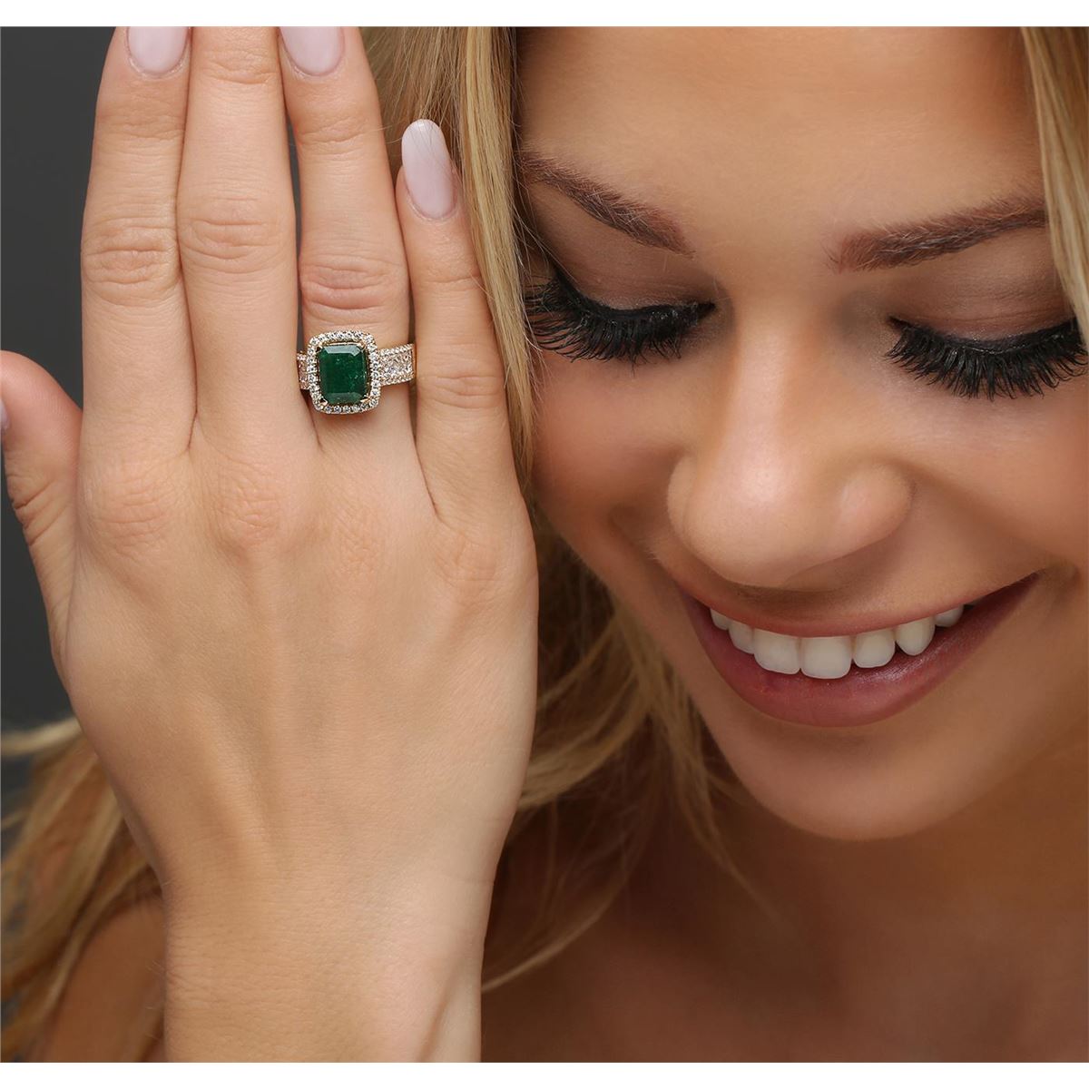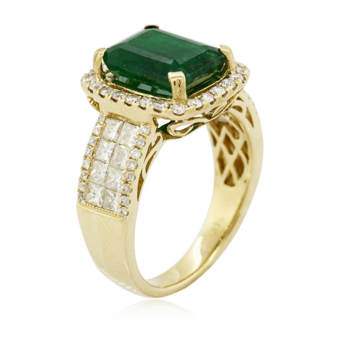 One electronically tested 14KT yellow gold Ladies combination cast & assembled ring with a bright polish finish. Condition is new. Identified with markings of "14K". Containing: One prong set emerald standard step cut natural emerald, measuring 10.00 x 8.00 x 5.20mm, approximate weight of 3.06ct., clarity is heavily included, type III, medium dark, moderately strong, green color, (GIA G 6/4), cut is good. Fifty-Eight prong set round brilliant cut diamonds, measuring 1.40 - 1.10 x 0.75mm (depth est.) approximate total weight of 58 Stones = 0.41ct. Clarity: I-1 to I-2. Color: I - J, Cut is Good. Sixteen invisible set princess cut diamonds, measuring 2.00 x 2.00 x 1.50mm (depth est.) approximate total weight of 16 Stones = 0.79ct. Clarity: SI-1 to SI-2. Color: J - K, Cut is Good. Colored gemstones are presumed to have been subjected to commonly used enhancement processes. All diamonds and colored gemstones are graded in the mounting, unless otherwise stated. Total Weight of Colored Stones 3.06ct. Total Weight of Diamonds 1.20ct. Total Weight of Ring 6.20 grams. GGL Appraised at $9,880.00.