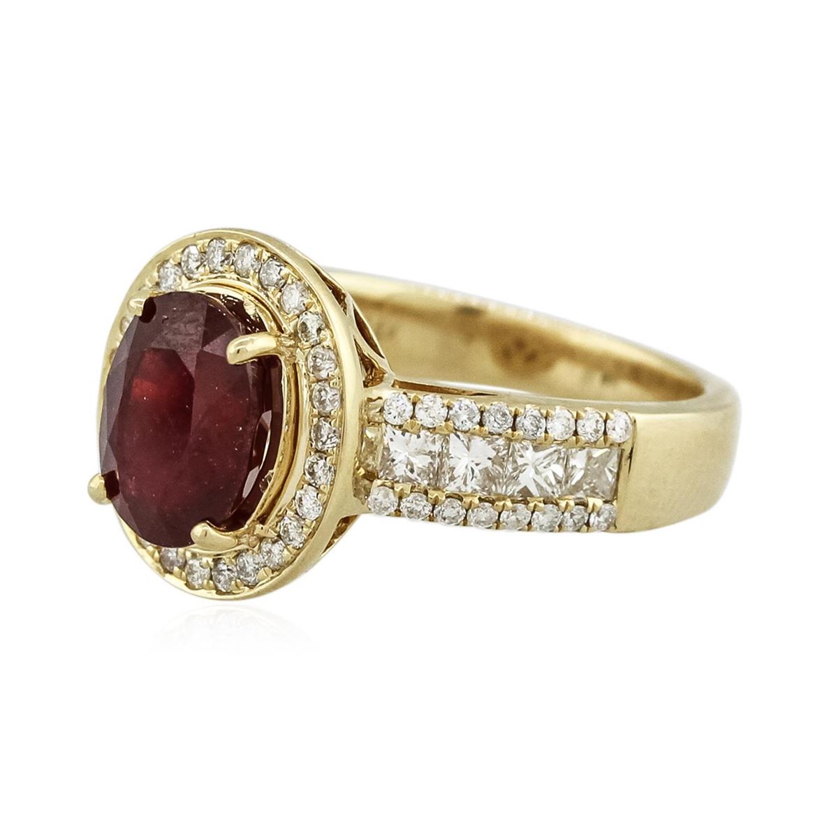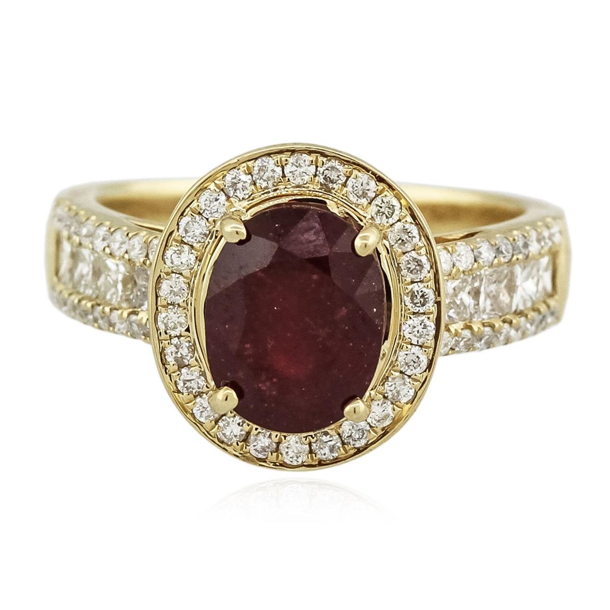 One electronically tested 14KT yellow gold Ladies combination cast & assembled ring with a bright polish finish. Condition is new. Identified with markings of "14K". Containing: One prong set oval modified brilliant cut natural ruby, measuring 9.10 x 7.11 x 4.62mm, exact weight 3.06ct., clarity is heavily included, type II, medium dark, moderately strong, strongly purplish red color, (GIA stpR 6/4), cut is very good. Colored gemstones are presumed to have been subjected to commonly used color/clarity enhancement processes. Fifty-Eight prong set round brilliant cut diamonds, measuring 1.20 - 1.20 x 0.72mm (depth est.) approximate. Total Weight of 58 Stones = 0.37ct. Clarity: I-1 to I-2. Color: I - J, Cut is Good. Eight channel set princess cut diamonds, measuring 2.50 x 2.50 x 1.88mm (depth est.) approximate. Total Weight of 8 Stones = 0.67ct. Clarity: SI-1. Color: I - J, Cut is Good.. Total Weight of Colored Stones 3.06ct. Total Weight of Diamonds 1.03ct. Total Weight of Ring 5.70 grams. GGL Appraised at $4,680.00.