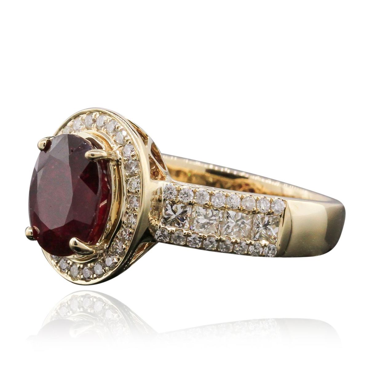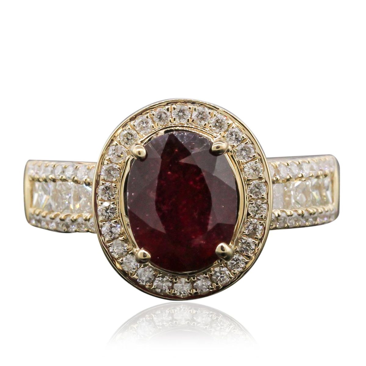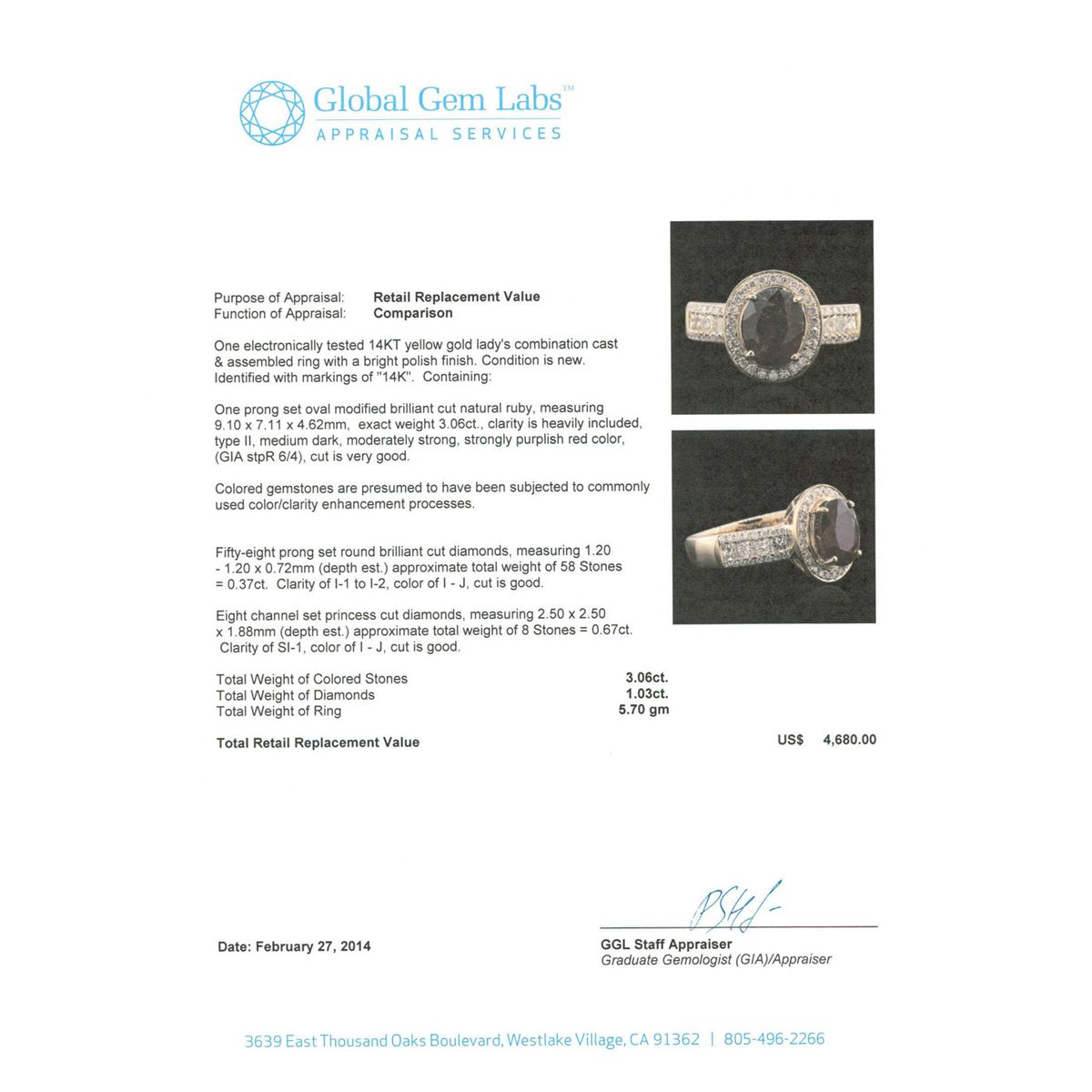 One electronically tested 14KT yellow gold Ladies combination cast & assembled ring with a bright polish finish. Condition is new. Identified with markings of "14K". Containing: One prong set oval modified brilliant cut natural ruby, measuring 9.10 x 7.11 x 4.62mm, exact weight 3.06ct., clarity is heavily included, type II, medium dark, moderately strong, strongly purplish red color, (GIA stpR 6/4), cut is very good. Colored gemstones are presumed to have been subjected to commonly used color/clarity enhancement processes. Fifty-Eight prong set round brilliant cut diamonds, measuring 1.20 - 1.20 x 0.72mm (depth est.) approximate. Total Weight of 58 Stones = 0.37ct. Clarity: I-1 to I-2. Color: I - J, Cut is Good. Eight channel set princess cut diamonds, measuring 2.50 x 2.50 x 1.88mm (depth est.) approximate. Total Weight of 8 Stones = 0.67ct. Clarity: SI-1. Color: I - J, Cut is Good.. Total Weight of Colored Stones 3.06ct. Total Weight of Diamonds 1.03ct. Total Weight of Ring 5.70 grams. GGL Appraised at $4,680.00.