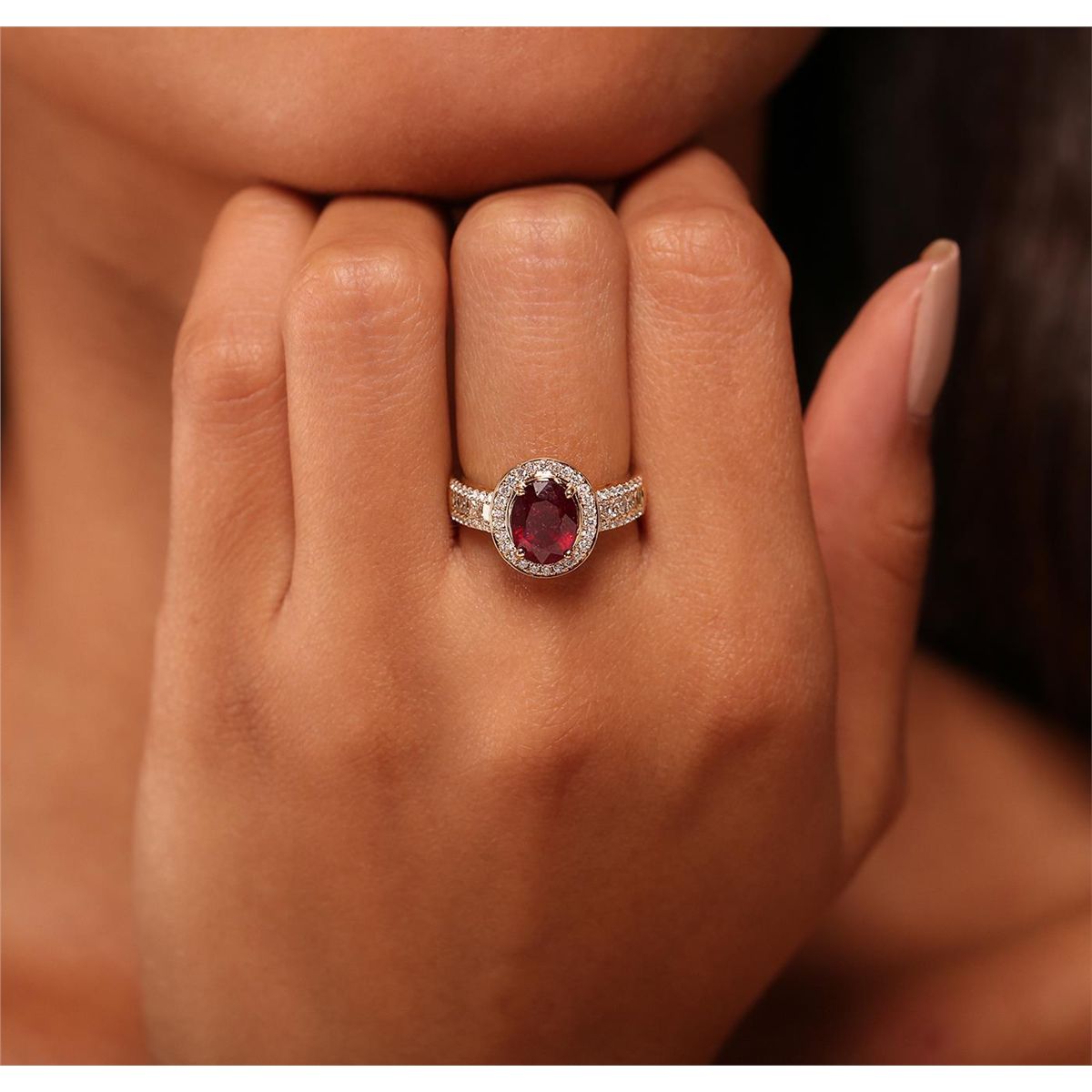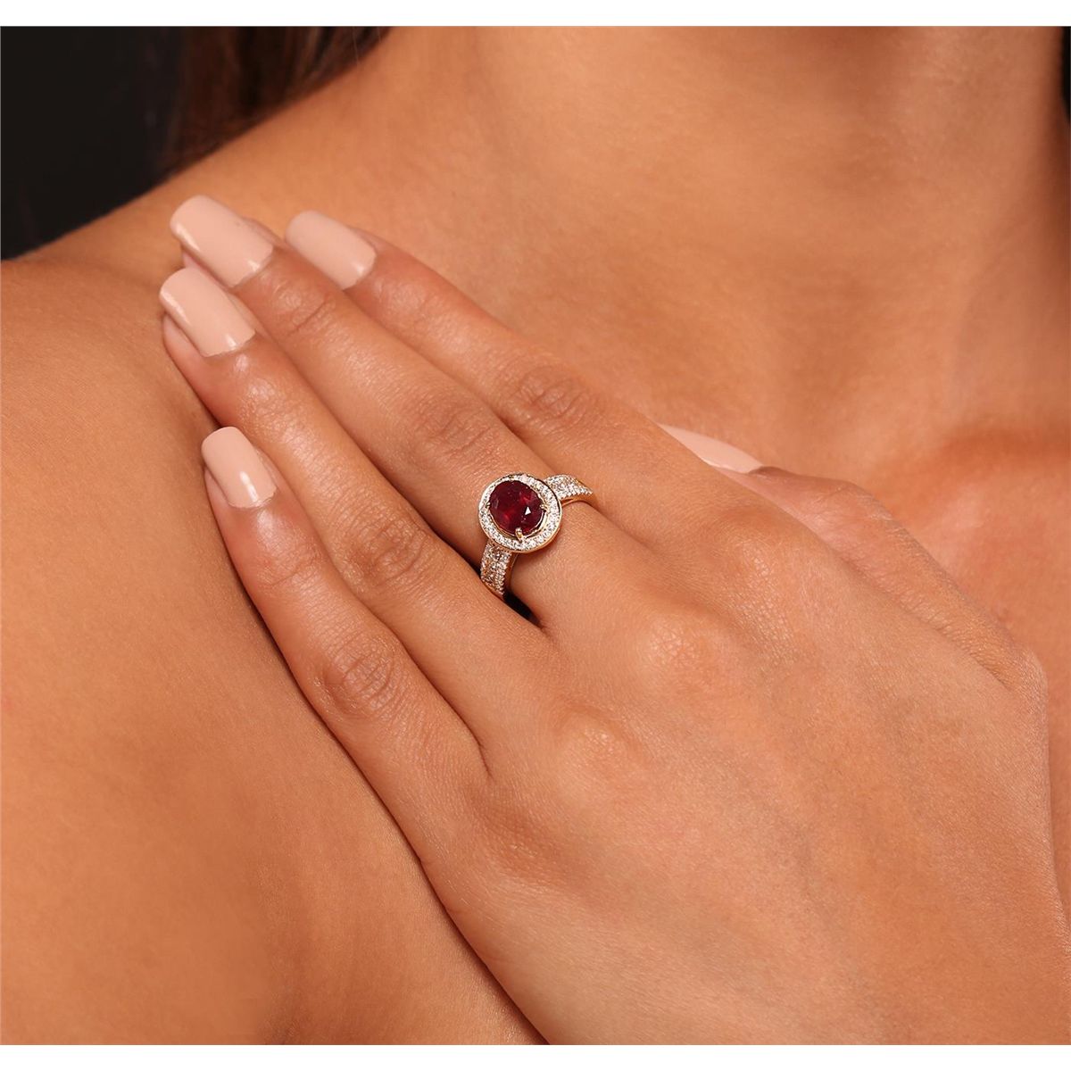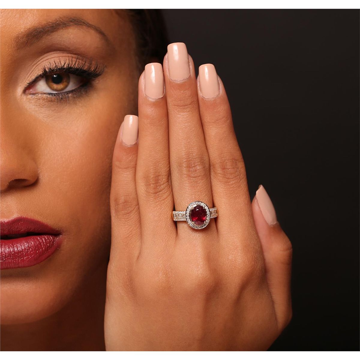 One electronically tested 14KT yellow gold Ladies combination cast & assembled ring with a bright polish finish. Condition is new. Identified with markings of "14K". Containing: One prong set oval modified brilliant cut natural ruby, measuring 9.10 x 7.11 x 4.62mm, exact weight 3.06ct., clarity is heavily included, type II, medium dark, moderately strong, strongly purplish red color, (GIA stpR 6/4), cut is very good. Colored gemstones are presumed to have been subjected to commonly used color/clarity enhancement processes. Fifty-Eight prong set round brilliant cut diamonds, measuring 1.20 - 1.20 x 0.72mm (depth est.) approximate. Total Weight of 58 Stones = 0.37ct. Clarity: I-1 to I-2. Color: I - J, Cut is Good. Eight channel set princess cut diamonds, measuring 2.50 x 2.50 x 1.88mm (depth est.) approximate. Total Weight of 8 Stones = 0.67ct. Clarity: SI-1. Color: I - J, Cut is Good.. Total Weight of Colored Stones 3.06ct. Total Weight of Diamonds 1.03ct. Total Weight of Ring 5.70 grams. GGL Appraised at $4,680.00.