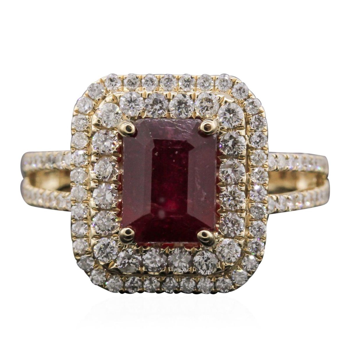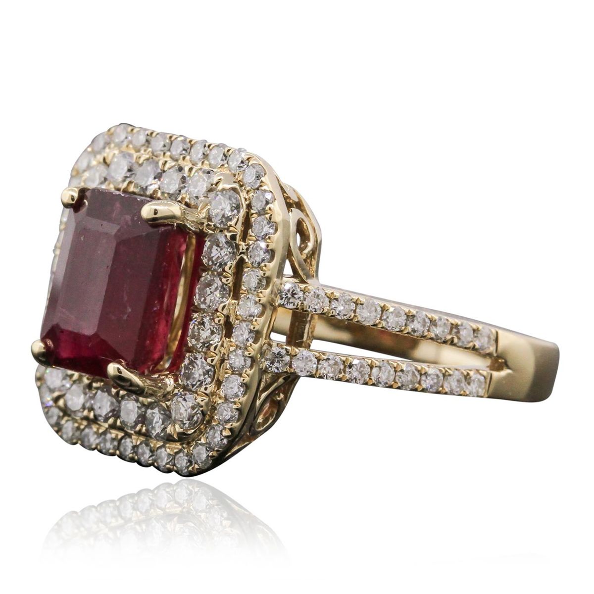 One electronically tested 14KT yellow gold Ladies combination cast & assembled ring with a bright polish finish. Condition is new. Identified with markings of "14K". Containing: One prong set emerald standard step cut natural ruby, measuring 8.00 x 6.00 x 3.43mm, approximate weight of 3.06ct., clarity is heavily included, type II, cut is good. Colored gemstones are presumed to have been subjected to commonly used color/clarity enhancement processes. Ninety-Seven prong set round brilliant cut diamonds, measuring 1.60 - 1.20 x 0.84mm (depth est.) approximate. Total Weight of 97 Stones = 0.97ct. Clarity: SI-2 to I-1. Color: J, Cut is Good. Total Weight of Colored Stones 3.06ct. Total Weight of Diamonds 0.97ct. Total Weight of Ring 5.90 grams. GGL Appraised at $5,285.00.