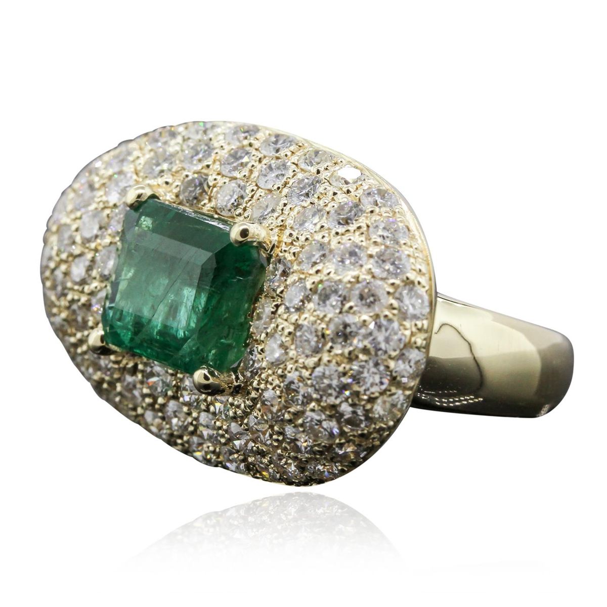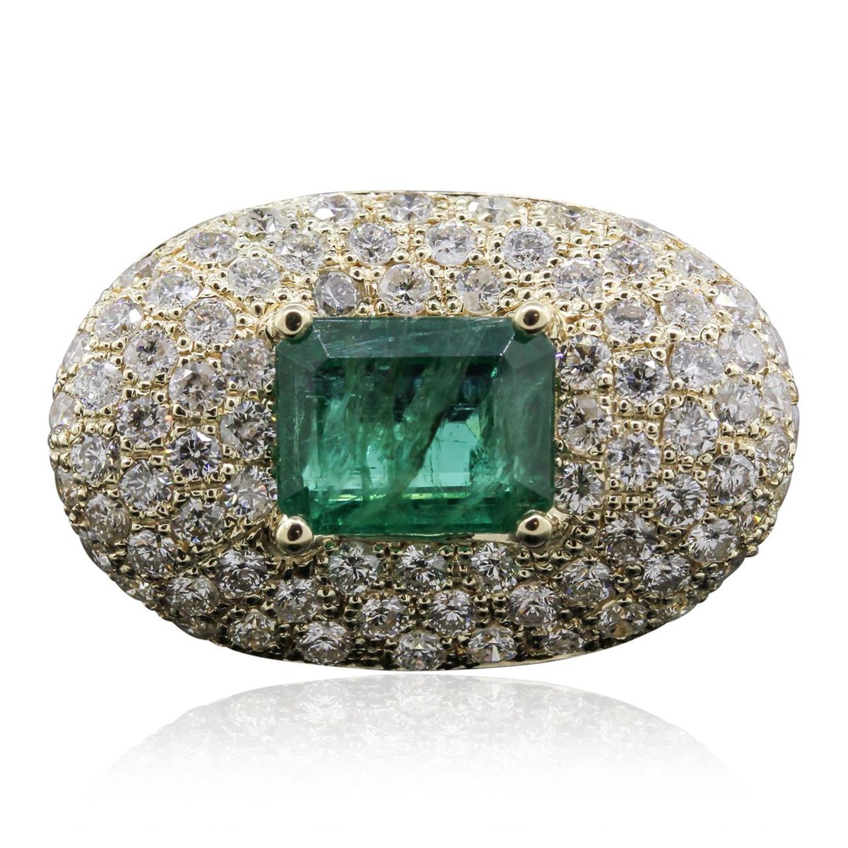 One electronically tested 14KT yellow gold Ladies combination cast & assembled fashion ring with a high polish finish. Condition is new. Identified with markings of "14K". Containing: One prong set emerald standard step cut natural emerald, measuring 10.17 x 8.25 x 5.00mm, approximate weight of 3.08ct., clarity is moderately included, type III, medium dark, moderately strong, green color, (GIA G 6/4), cut is good. Colored gemstones are presumed to have been subjected to commonly used and possible undetectable color/clarity enhancement processes. Eighty prong set round brilliant cut diamonds, measuring 2.10 - 2.00 x 1.23mm (depth est.) approximate total weight of 80 Stones = 2.52ct. Clarity of SI-1 to I-1, Color of H - I, Cut is Good. Total Weight of Colored Stones 3.08ct. Total Weight of Diamonds 2.52ct. Total Weight of Ring 12.10 grams. GGL Appraised at $15,820.00.