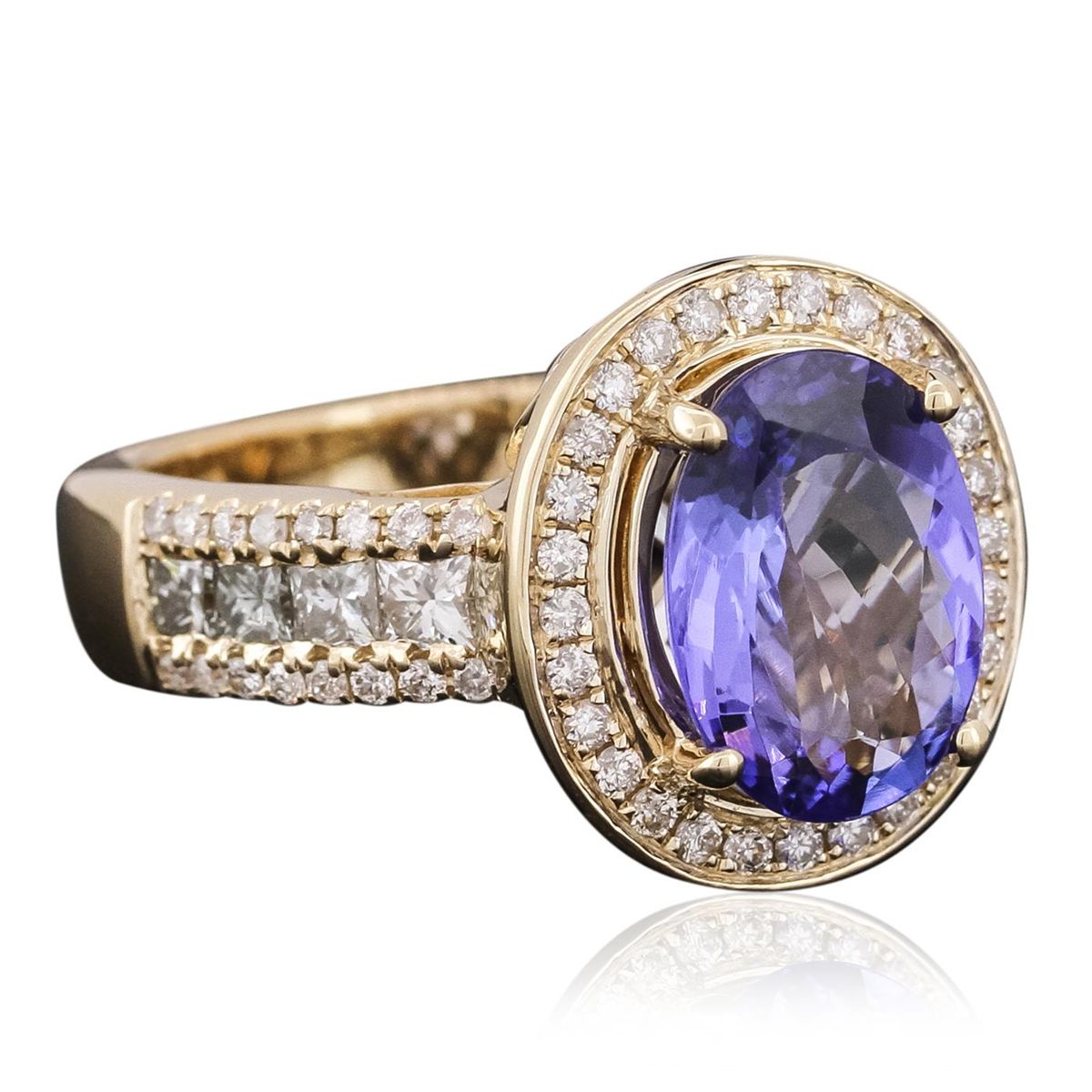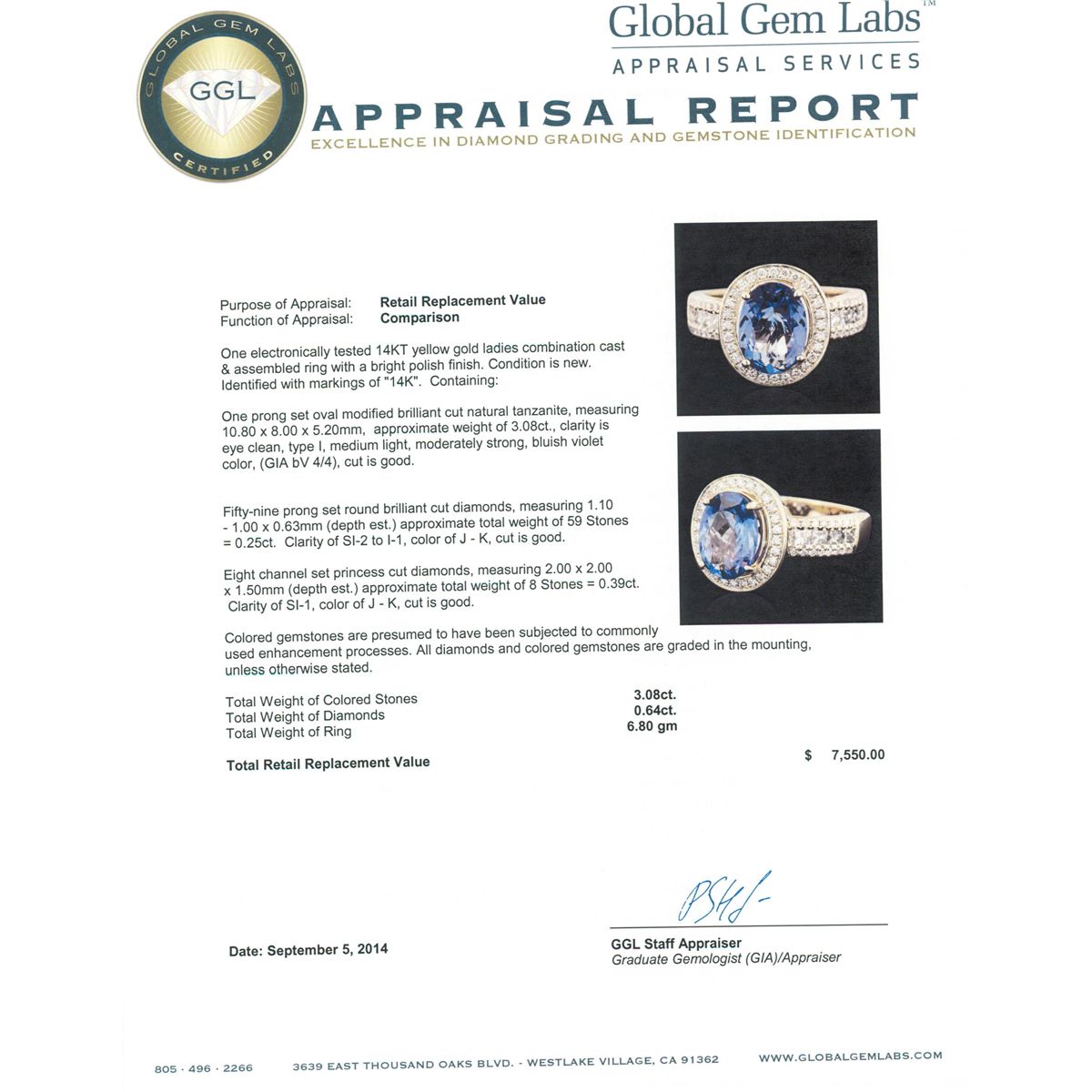 One electronically tested 14KT yellow gold ladies combination cast & assembled ring with a bright polish finish. Identified with markings of "14K". Condition is new. Containing: One prong set oval modified brilliant cut natural tanzanite, measuring 10.80 x 8.00 x 5.20mm, approximate weight of 3.08ct., clarity is eye clean, type I, medium light, moderately strong, bluish violet color, (GIA bV 4/4), cut is good. Fifty-Nine prong set round brilliant cut diamonds, measuring 1.10 - 1.00 x 0.63mm (depth est.) approximate total weight of 59 Stones = 0.25ct. Clarity: SI-2 to I-1. Color: J - K, Cut is Good. Eight channel set princess cut diamonds, measuring 2.00 x 2.00 x 1.50mm (depth est.) approximate total weight of 8 Stones = 0.39ct. Clarity: SI-1. Color: J - K, Cut is Good. Colored gemstones are presumed to have been subjected to commonly used enhancement processes. All diamonds and colored gemstones are graded in the mounting, unless otherwise stated. Total Weight of Colored Stones 3.08ct. Total Weight of Diamonds 0.64ct. Total Weight of Ring 6.80 grams. GGL Appraised at $7,550.00.