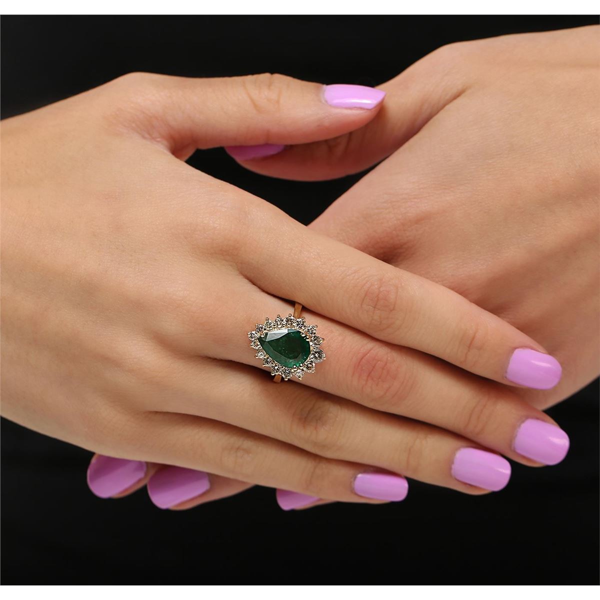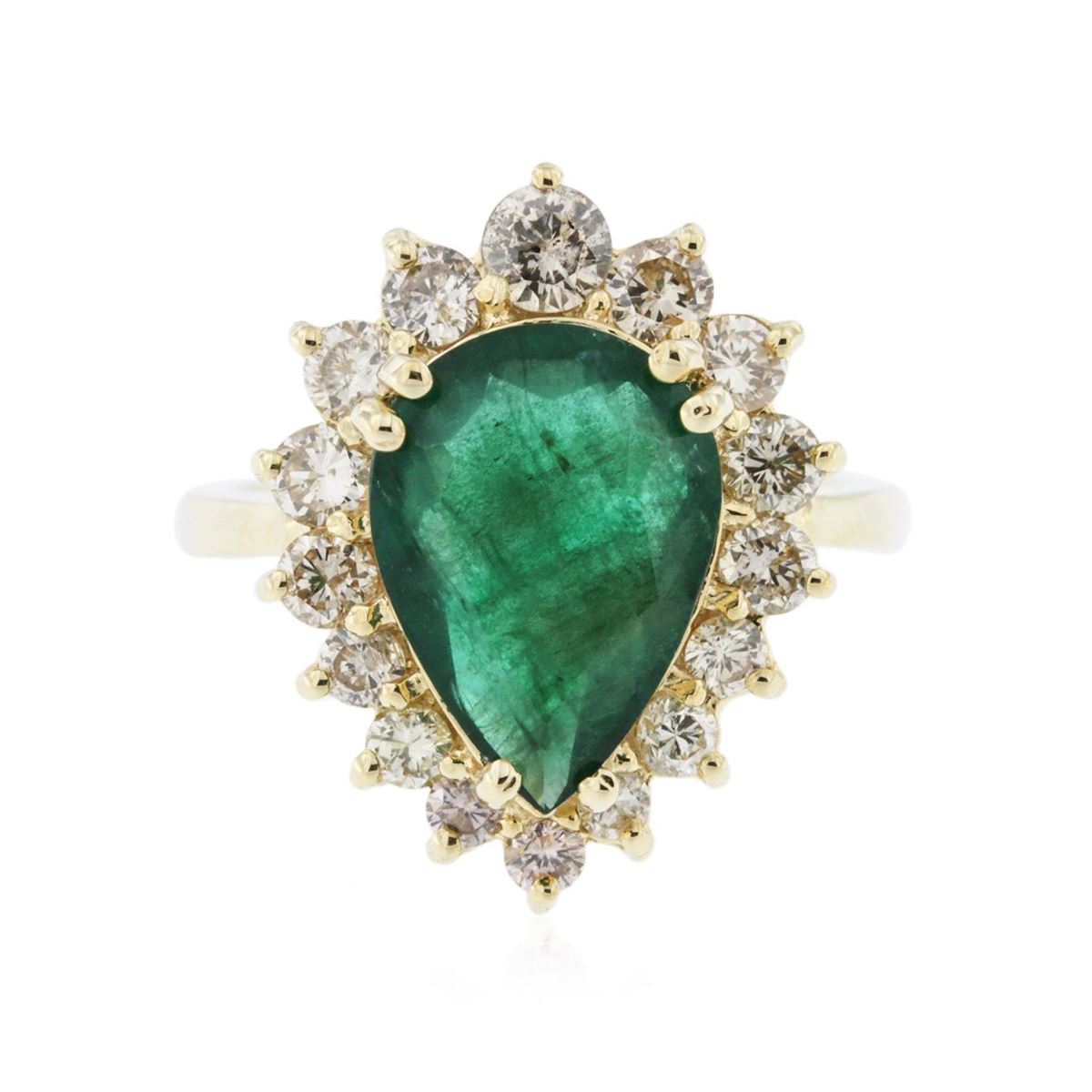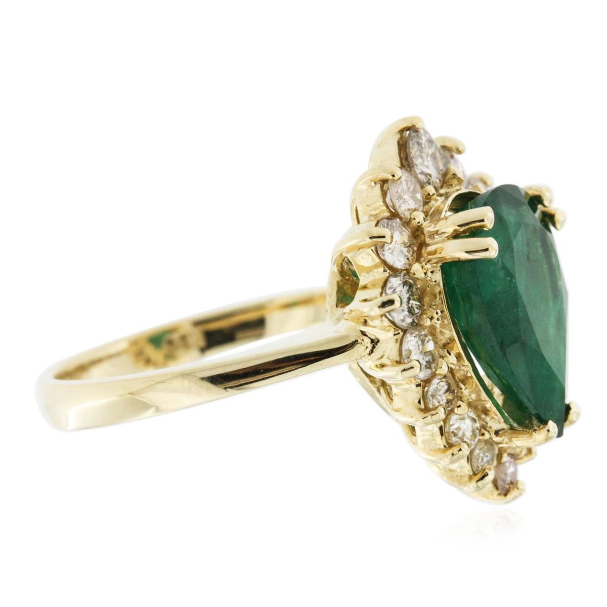 One electronically tested 14KT yellow gold ladies cast emerald and diamond ring with a bright polish finish. The featured emerald is set within a diamond bezel supported by tapering shoulders, completed by a two and one-half millimeter wide band. Identified with markings of "K14". Condition is new, good workmanship. Containing: One prong set pear mixed cut natural emerald, measuring 12.25 x 8.79 x 4.90mm, 8%. bulge factor, approximate weight of 3.10ct., clarity is heavily included, type III, medium dark, very slightly grayish, green color, (GIA G 6/3), cut is good. Transmitting light with a minimum of distortion, transparent. Naturally occurring internal & external characteristics are present. Indications of oil & opticon residue. Graded in the setting. Three prong set round brilliant cut diamonds, measuring 3.30 - 3.00 x 1.89mm (depth est.) approximate. Total Weight of 3 Stones = 0.44ct. Graded in the setting. Clarity: SI-1 to SI-2 . Color: I - K Six prong set round brilliant cut diamonds, measuring 2.70 - 2.50 x 1.56mm (depth est.) approximate. Total Weight of 6 Stones = 0.48ct. Graded in the setting. Clarity: SI-1 to I-1 . Color: I - K Seven prong set round brilliant cut diamonds, measuring 2.20 - 2.10 x 1.29mm (depth est.) approximate. Total Weight of 7 Stones = 0.35ct. Graded in the setting. Clarity: SI-1 to I-1 . Color: I - K. Total Weight of Colored Stones 3.10ct. Total Weight of Diamonds 1.27ct. AIG Appraised at $9,385.00.