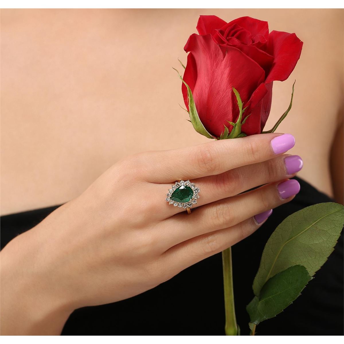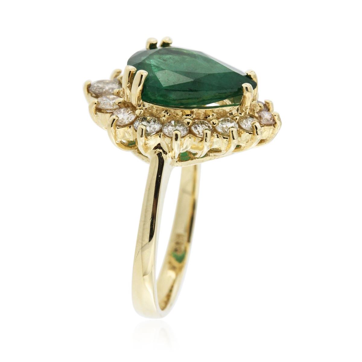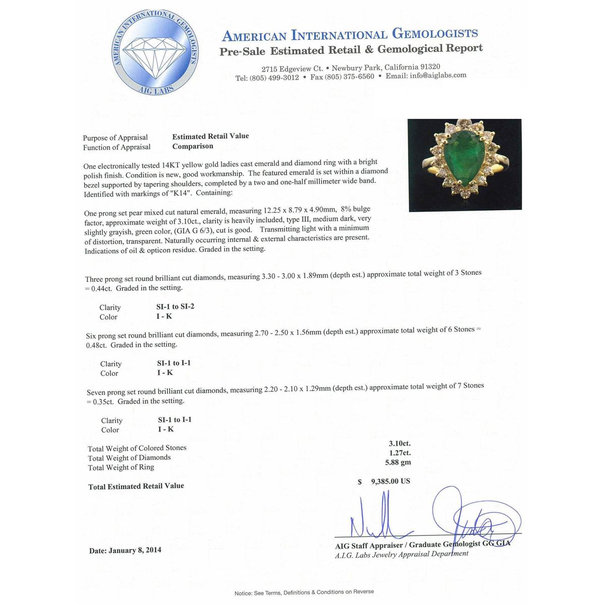 One electronically tested 14KT yellow gold ladies cast emerald and diamond ring with a bright polish finish. The featured emerald is set within a diamond bezel supported by tapering shoulders, completed by a two and one-half millimeter wide band. Identified with markings of "K14". Condition is new, good workmanship. Containing: One prong set pear mixed cut natural emerald, measuring 12.25 x 8.79 x 4.90mm, 8%. bulge factor, approximate weight of 3.10ct., clarity is heavily included, type III, medium dark, very slightly grayish, green color, (GIA G 6/3), cut is good. Transmitting light with a minimum of distortion, transparent. Naturally occurring internal & external characteristics are present. Indications of oil & opticon residue. Graded in the setting. Three prong set round brilliant cut diamonds, measuring 3.30 - 3.00 x 1.89mm (depth est.) approximate. Total Weight of 3 Stones = 0.44ct. Graded in the setting. Clarity: SI-1 to SI-2 . Color: I - K Six prong set round brilliant cut diamonds, measuring 2.70 - 2.50 x 1.56mm (depth est.) approximate. Total Weight of 6 Stones = 0.48ct. Graded in the setting. Clarity: SI-1 to I-1 . Color: I - K Seven prong set round brilliant cut diamonds, measuring 2.20 - 2.10 x 1.29mm (depth est.) approximate. Total Weight of 7 Stones = 0.35ct. Graded in the setting. Clarity: SI-1 to I-1 . Color: I - K. Total Weight of Colored Stones 3.10ct. Total Weight of Diamonds 1.27ct. AIG Appraised at $9,385.00.