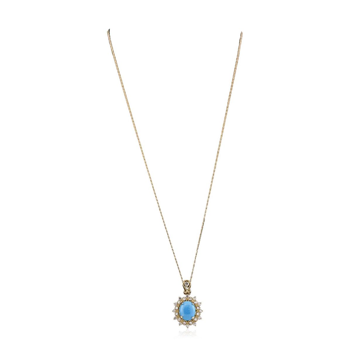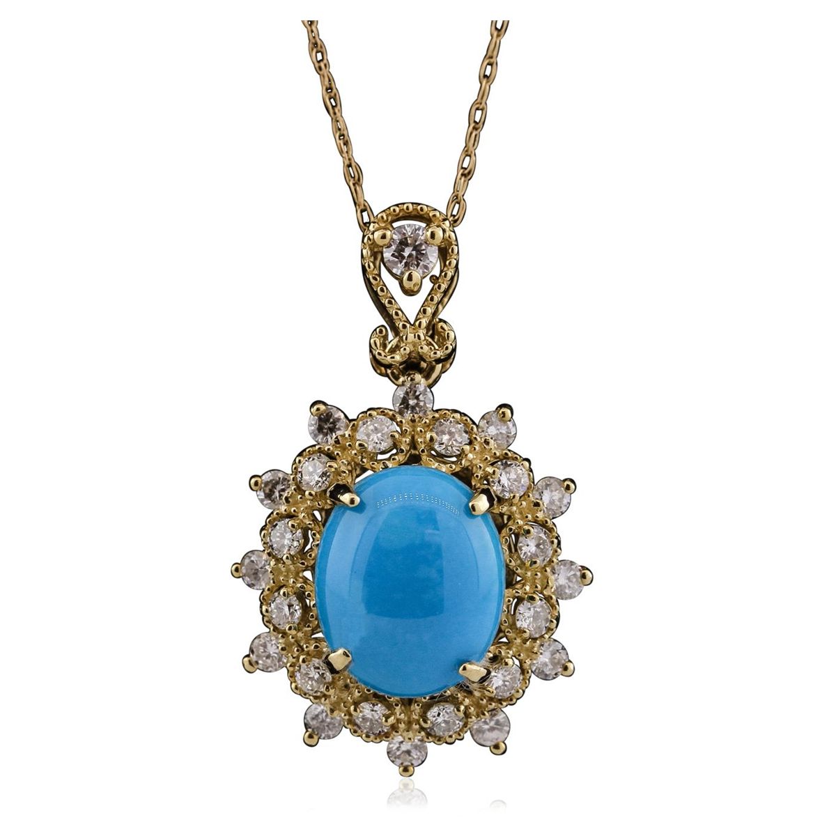 One pendant with chain featuring: 4.2 grams of 14KT yellow gold, turquoise with a total weight of 3.10ct, diamonds with a total weight of 0.69cts.