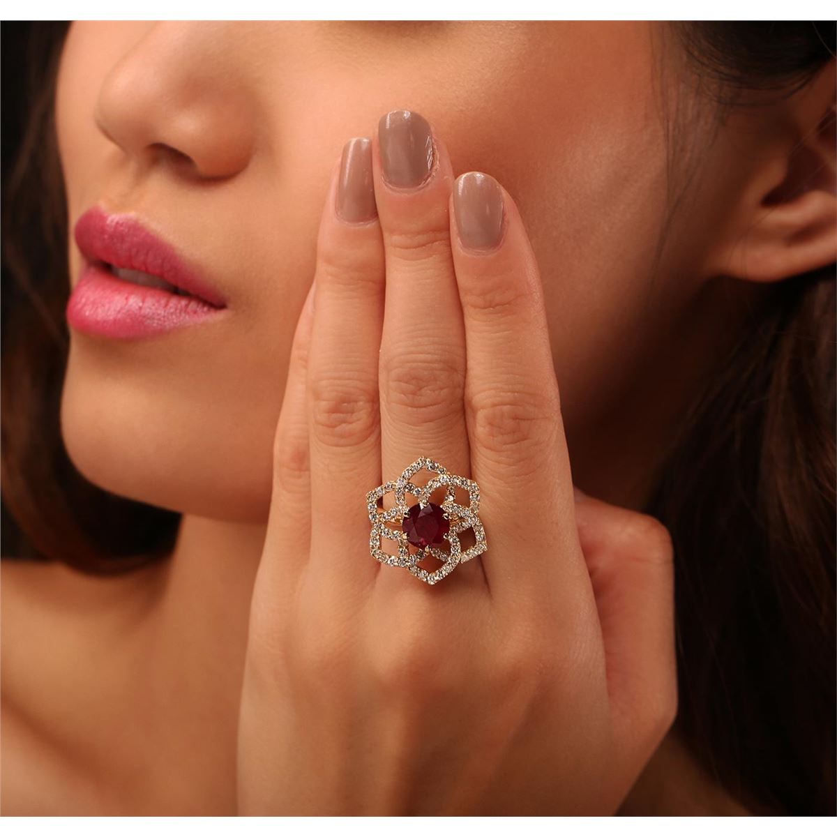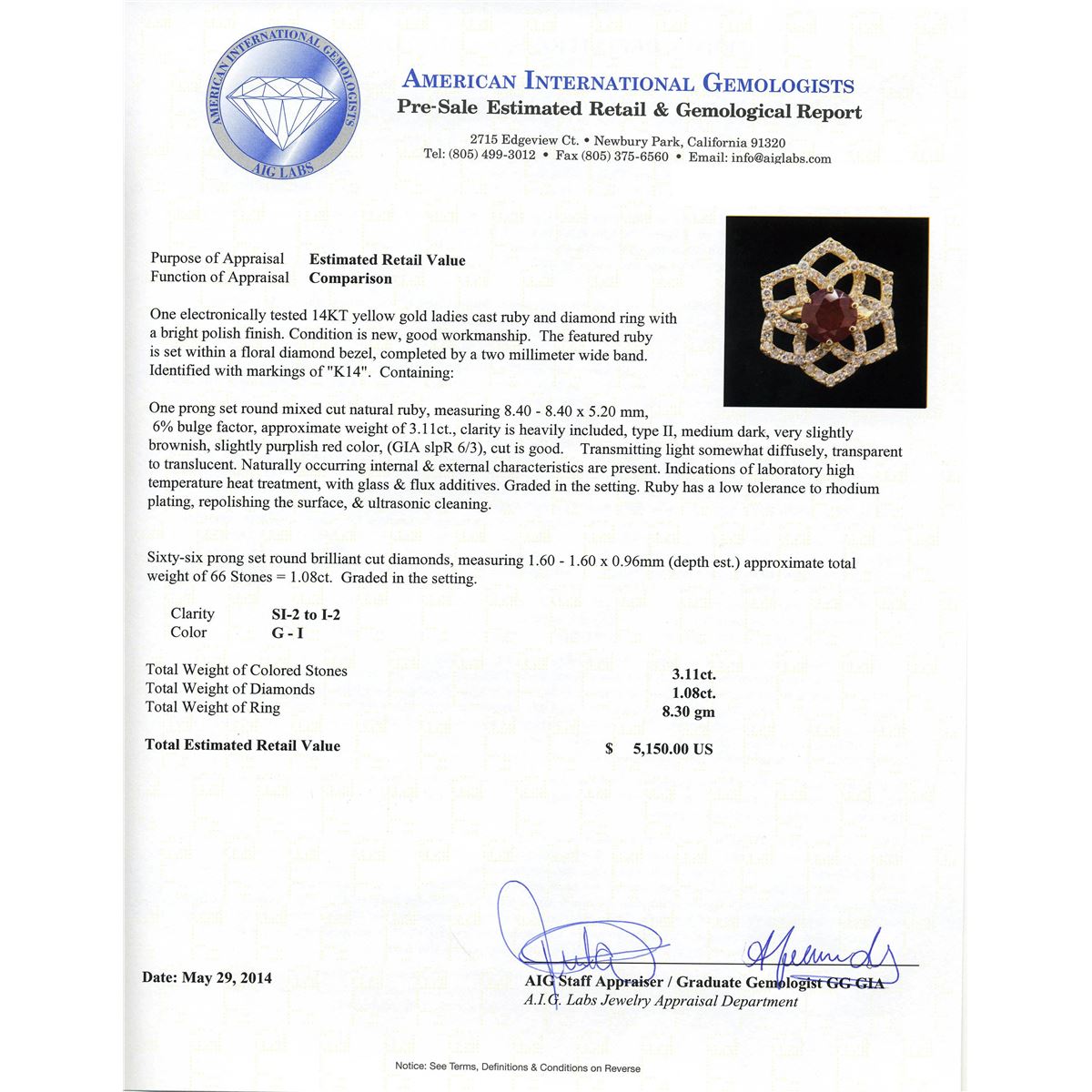 One electronically tested 14KT yellow gold ladies cast ruby and diamond ring with a bright polish finish. Condition is new, good workmanship. The featured ruby is set within a floral diamond bezel, completed by a two millimeter wide band. Identified with markings of "K14". Containing: One prong set round mixed cut natural ruby, measuring 8.40 - 8.40 x 5.20 mm, 6%. bulge factor, approximate weight of 3.11ct., clarity is heavily included, type II, medium dark, very slightly brownish, slightly purplish red color, (GIA slpR 6/3), cut is good. Transmitting light somewhat diffusely, transparent to translucent. Naturally occurring internal & external characteristics are present. Indications of laboratory high temperature heat treatment, with glass & flux additives. Graded in the setting. Ruby has a low tolerance to rhodium plating, repolishing the surface, & ultrasonic cleaning. Sixty-Six prong set round brilliant cut diamonds, measuring 1.60 - 1.60 x 0.96mm (depth est.) approximate. Total Weight of 66 Stones = 1.08ct. Graded in the setting. Clarity: SI-2 to I-2 . Color: G - I. Total Weight of Colored Stones 3.11ct.. Total Weight of Diamonds 1.08ct.. Total Weight of Ring 8.30gm. AIG Appraised at $5,150.00.