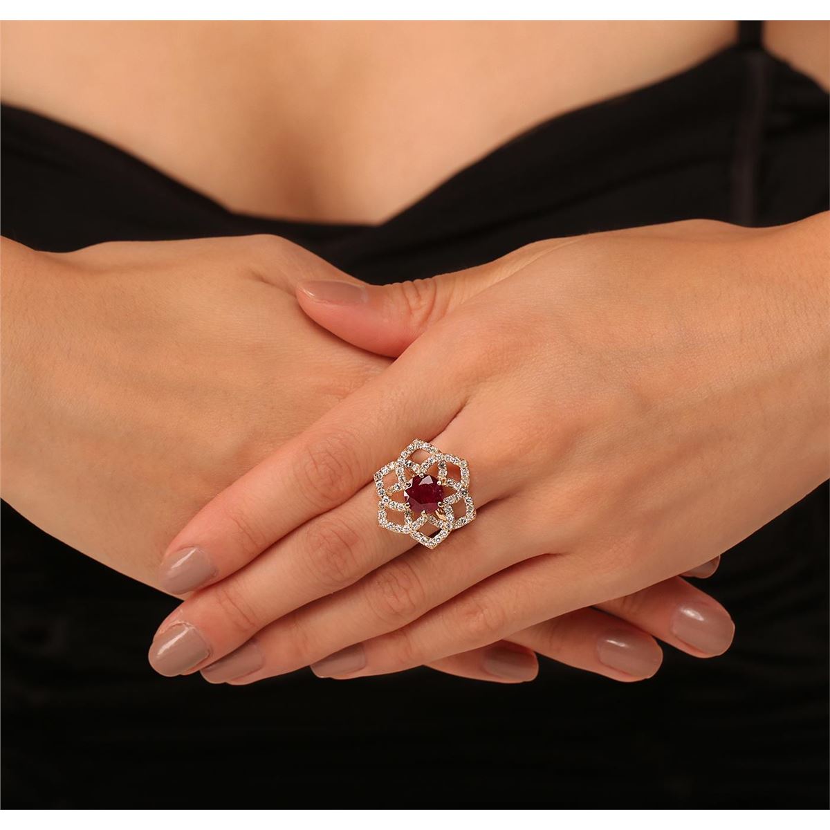One electronically tested 14KT yellow gold ladies cast ruby and diamond ring with a bright polish finish. Condition is new, good workmanship. The featured ruby is set within a floral diamond bezel, completed by a two millimeter wide band. Identified with markings of "K14". Containing: One prong set round mixed cut natural ruby, measuring 8.40 - 8.40 x 5.20 mm, 6%. bulge factor, approximate weight of 3.11ct., clarity is heavily included, type II, medium dark, very slightly brownish, slightly purplish red color, (GIA slpR 6/3), cut is good. Transmitting light somewhat diffusely, transparent to translucent. Naturally occurring internal & external characteristics are present. Indications of laboratory high temperature heat treatment, with glass & flux additives. Graded in the setting. Ruby has a low tolerance to rhodium plating, repolishing the surface, & ultrasonic cleaning. Sixty-Six prong set round brilliant cut diamonds, measuring 1.60 - 1.60 x 0.96mm (depth est.) approximate. Total Weight of 66 Stones = 1.08ct. Graded in the setting. Clarity: SI-2 to I-2 . Color: G - I. Total Weight of Colored Stones 3.11ct.. Total Weight of Diamonds 1.08ct.. Total Weight of Ring 8.30gm. AIG Appraised at $5,150.00.