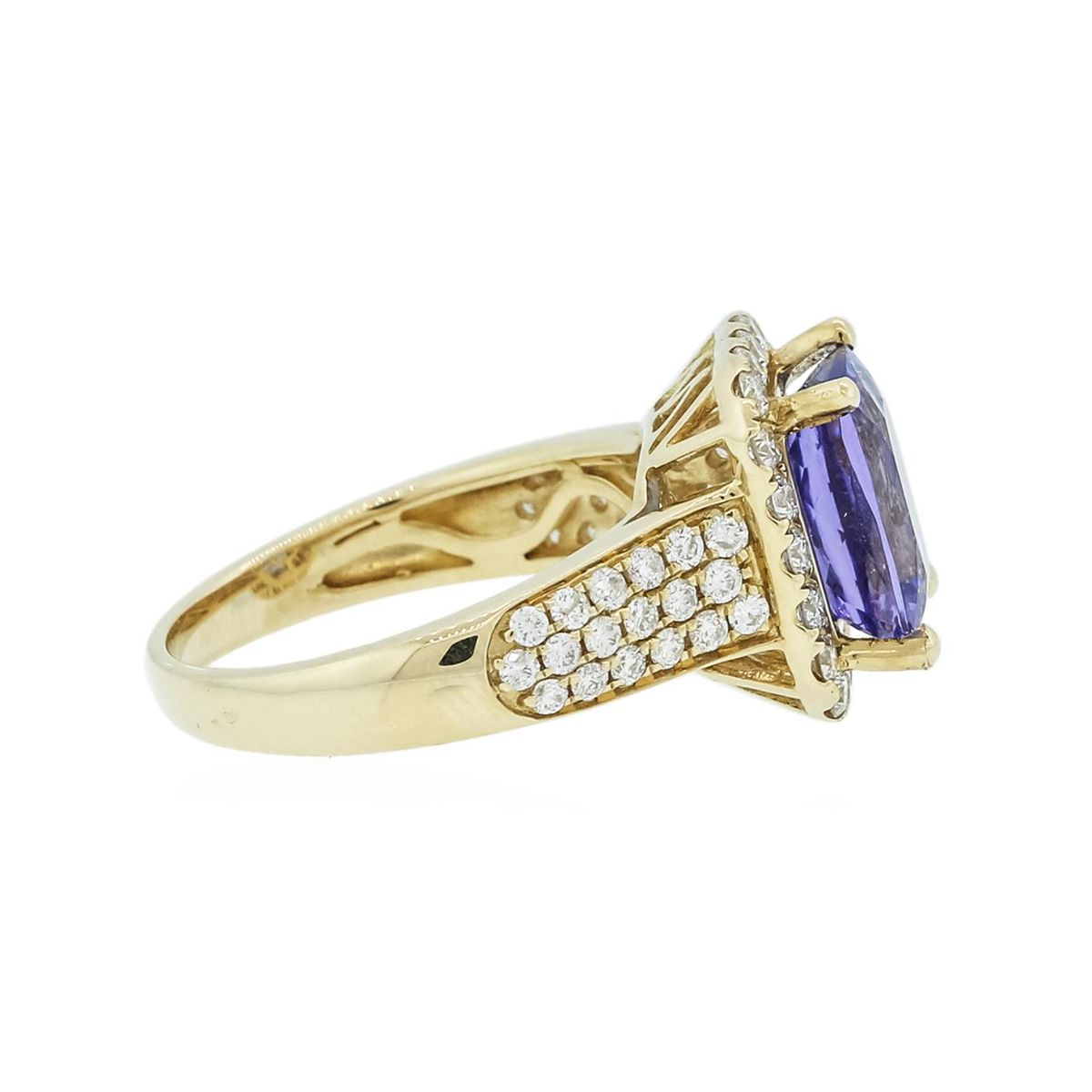 One electronically tested 14KT yellow gold ladies combination cast & assembled tanzanite and diamond ring with a flat shank with a bright polish finish. Identified with markings of "14K". Condition is new. Containing: One prong set rectangular cushion modified brilliant cut natural tanzanite, measuring 10.04 x 7.71 x 5.10mm, approximate weight of 3.11ct., clarity is eye clean, type I, medium, moderately strong, bluish violet color, (GIA bV 5/4), cut is good. Fifty-Six prong set round brilliant cut diamonds, measuring 1.70 - 1.30 x 0.90mm (depth est.) stated total weight of 56 Stones = 0.69ct. Clarity: SI-2 to I-2. Color: I - J, Cut is Good. Colored gemstones are presumed to have been subjected to commonly used enhancement processes. All diamonds and colored gemstones are graded in the mounting, unless otherwise stated total weight of Colored Stones 3.11ct. Total Weight of Diamonds 0.69ct. Total Weight of Ring 5.80 grams. GGL Appraised at $7,870.00.