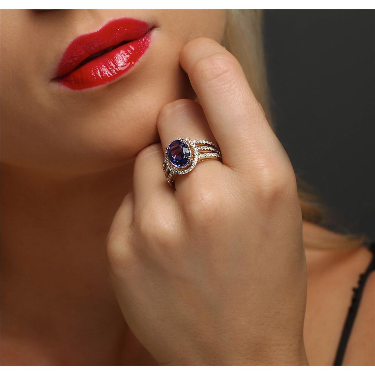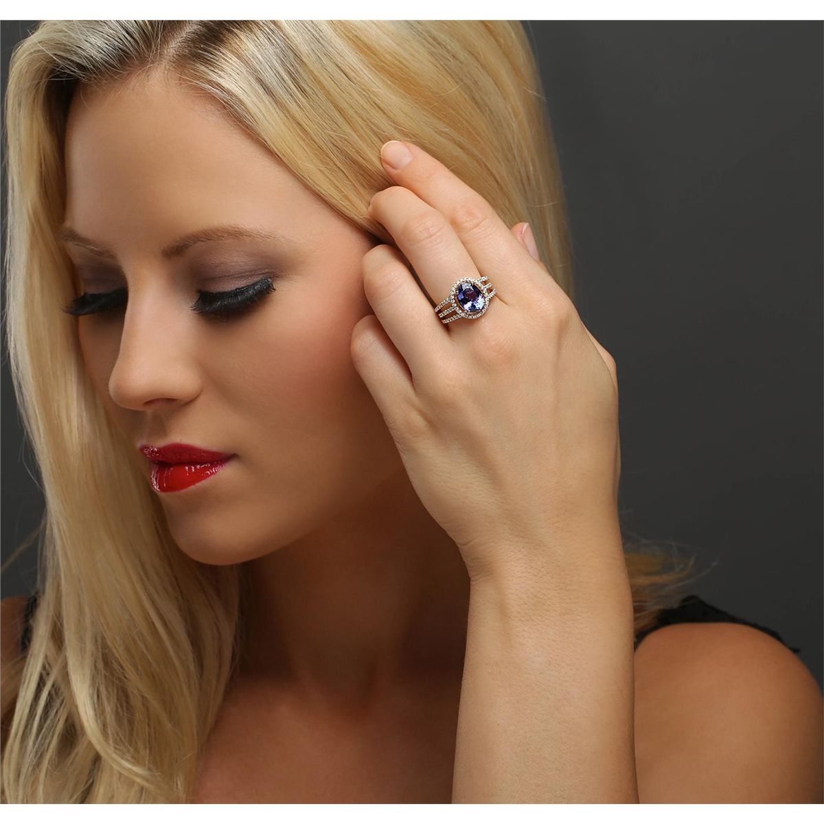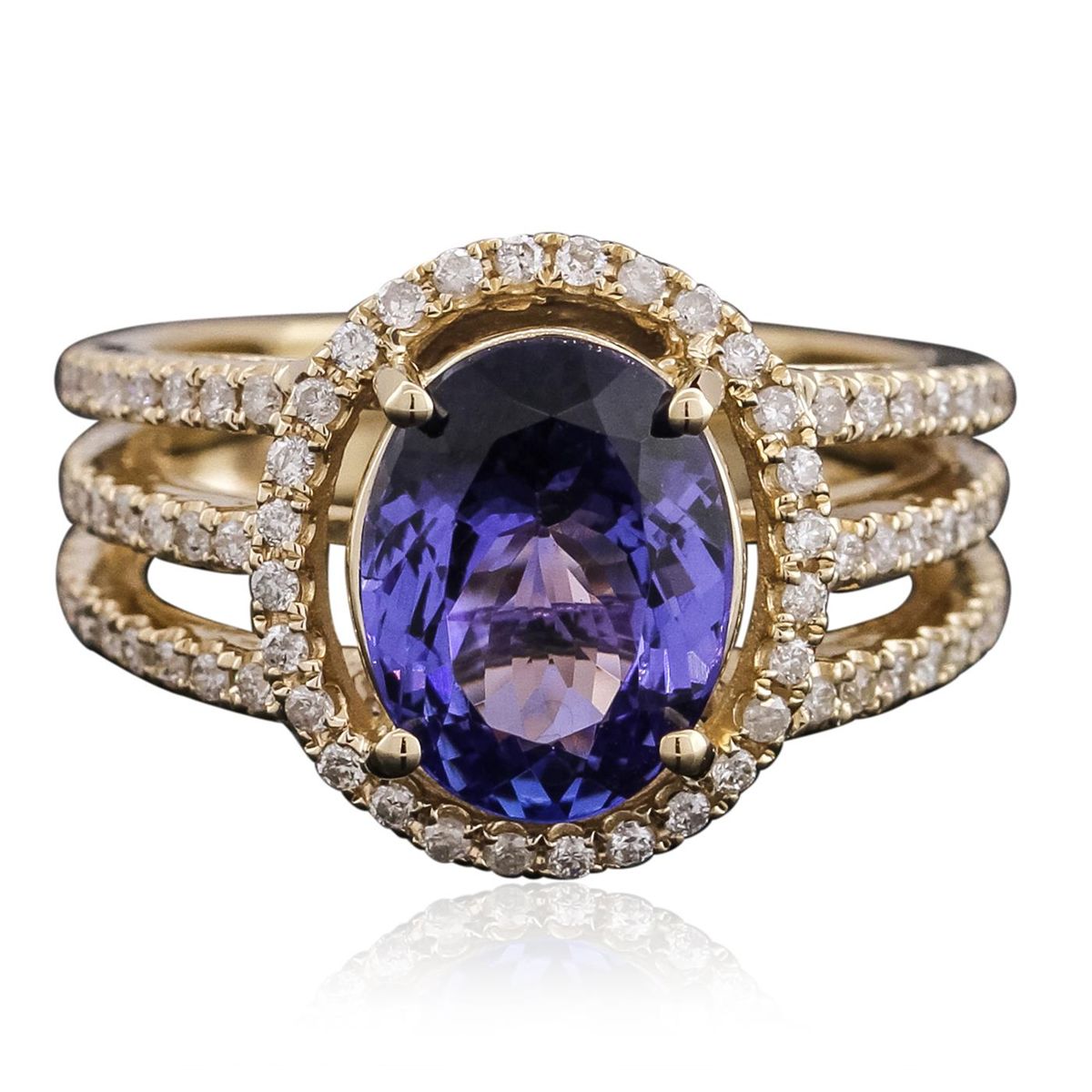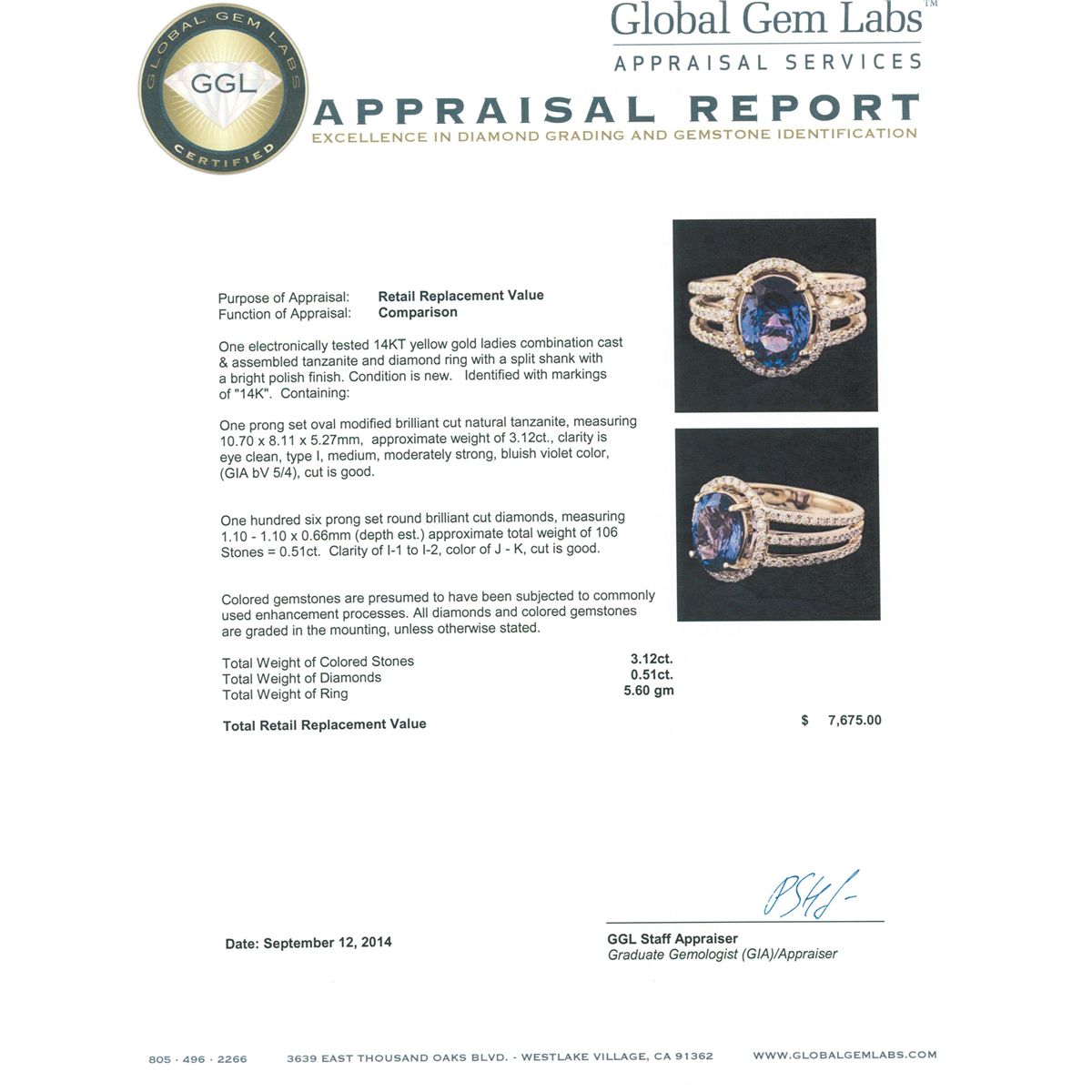 One electronically tested 14KT yellow gold ladies combination cast & assembled tanzanite and diamond ring with a split shank with a bright polish finish. Identified with markings of "14K". Condition is new. Containing: One prong set oval modified brilliant cut natural tanzanite, measuring 10.70 x 8.11 x 5.27mm, approximate weight of 3.12ct., clarity is eye clean, type I, medium, moderately strong, bluish violet color, (GIA bV 5/4), cut is good. One Hundred Six prong set round brilliant cut diamonds, measuring 1.10 - 1.10 x 0.66mm (depth est.) approximate total weight of 106 Stones = 0.51ct. Clarity: I-1 to I-2. Color: J - K, Cut is Good. Colored gemstones are presumed to have been subjected to commonly used enhancement processes. All diamonds and colored gemstones are graded in the mounting, unless otherwise stated total weight of Colored Stones 3.12ct. Total Weight of Diamonds 0.51ct. Total Weight of Ring 5.60 grams. GGL Appraised at $7,675.00.
