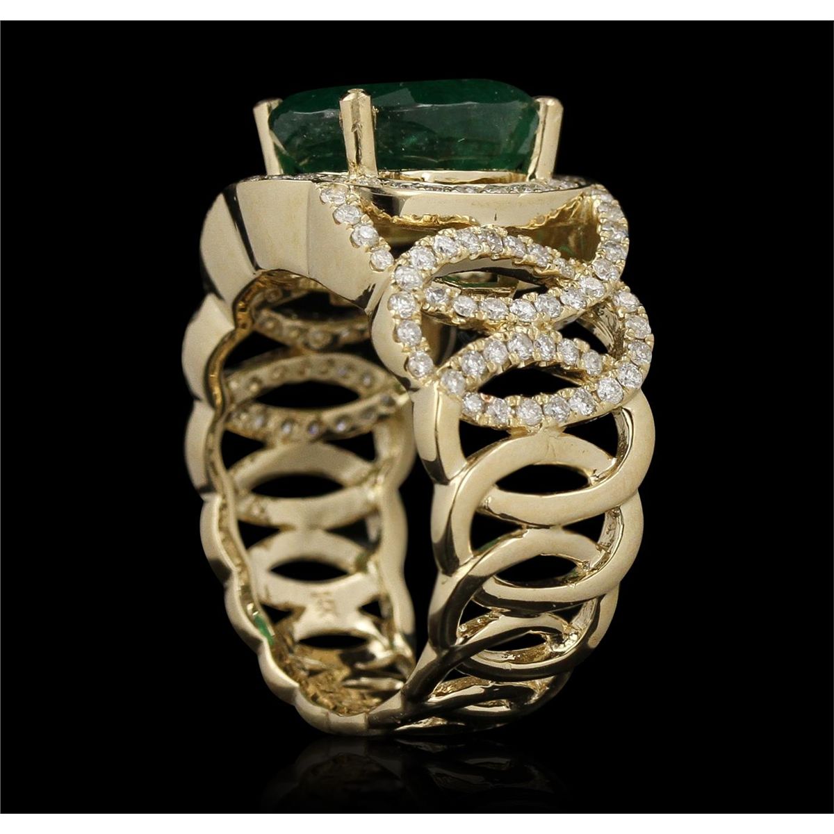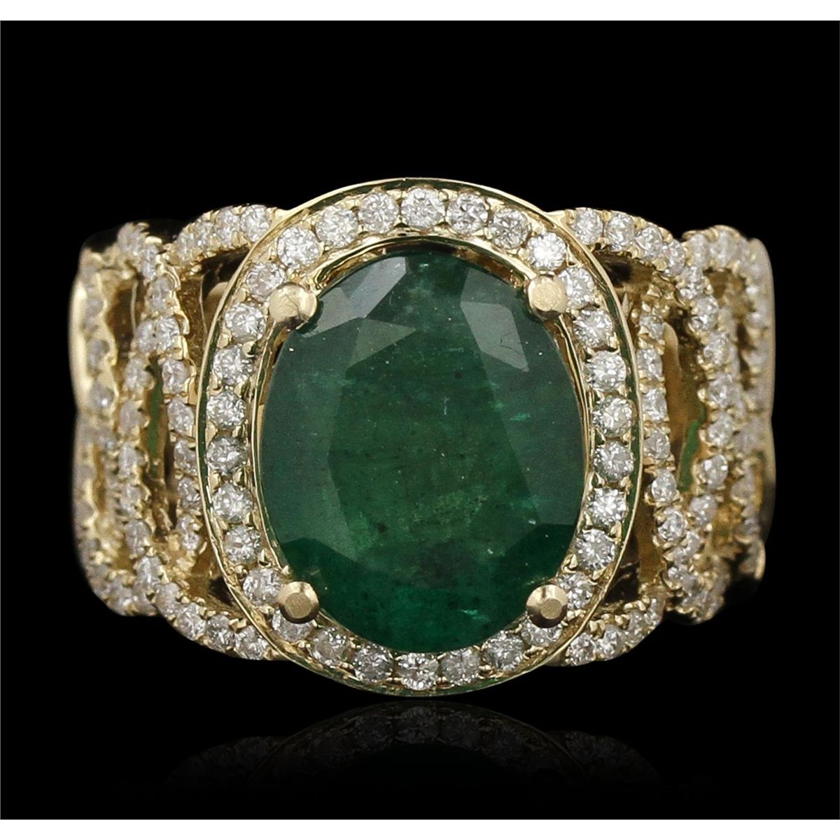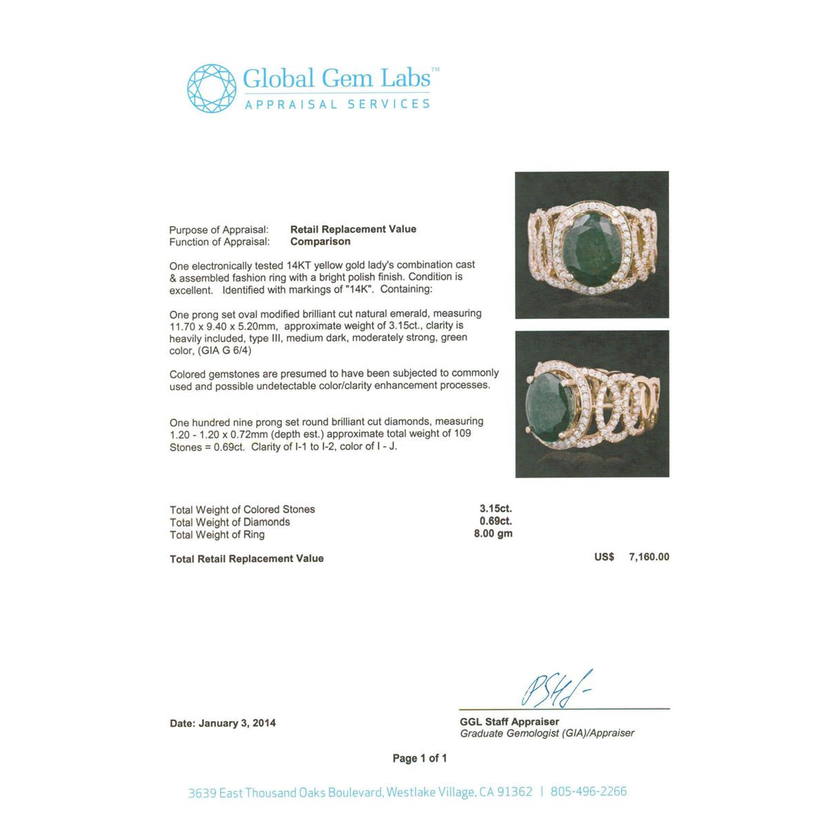One electronically tested 14KT yellow gold Ladies combination cast & assembled fashion ring with a bright polish finish. Identified with markings of "14K". Condition is excellent. Containing: One prong set oval modified brilliant cut natural emerald, measuring 11.70 x 9.40 x 5.20mm, approximate weight of 3.15ct., clarity is heavily included, type III, medium dark, moderately strong, green color, (GIA G 6/4) . Colored gemstones are presumed to have been subjected to commonly used and possible undetectable color/clarity enhancement processes. One Hundred Nine prong set round brilliant cut diamonds, measuring 1.20 - 1.20 x 0.72mm (depth est.) approximate total weight of 109 Stones = 0.69ct. Clarity of I-1 to I-2, Color of I - J. Total Weight of Colored Stones 3.15ct. Total Weight of Diamonds 0.69ct. Total Weight of Ring 8.00gm. GGL Appraised at $7,160.00.