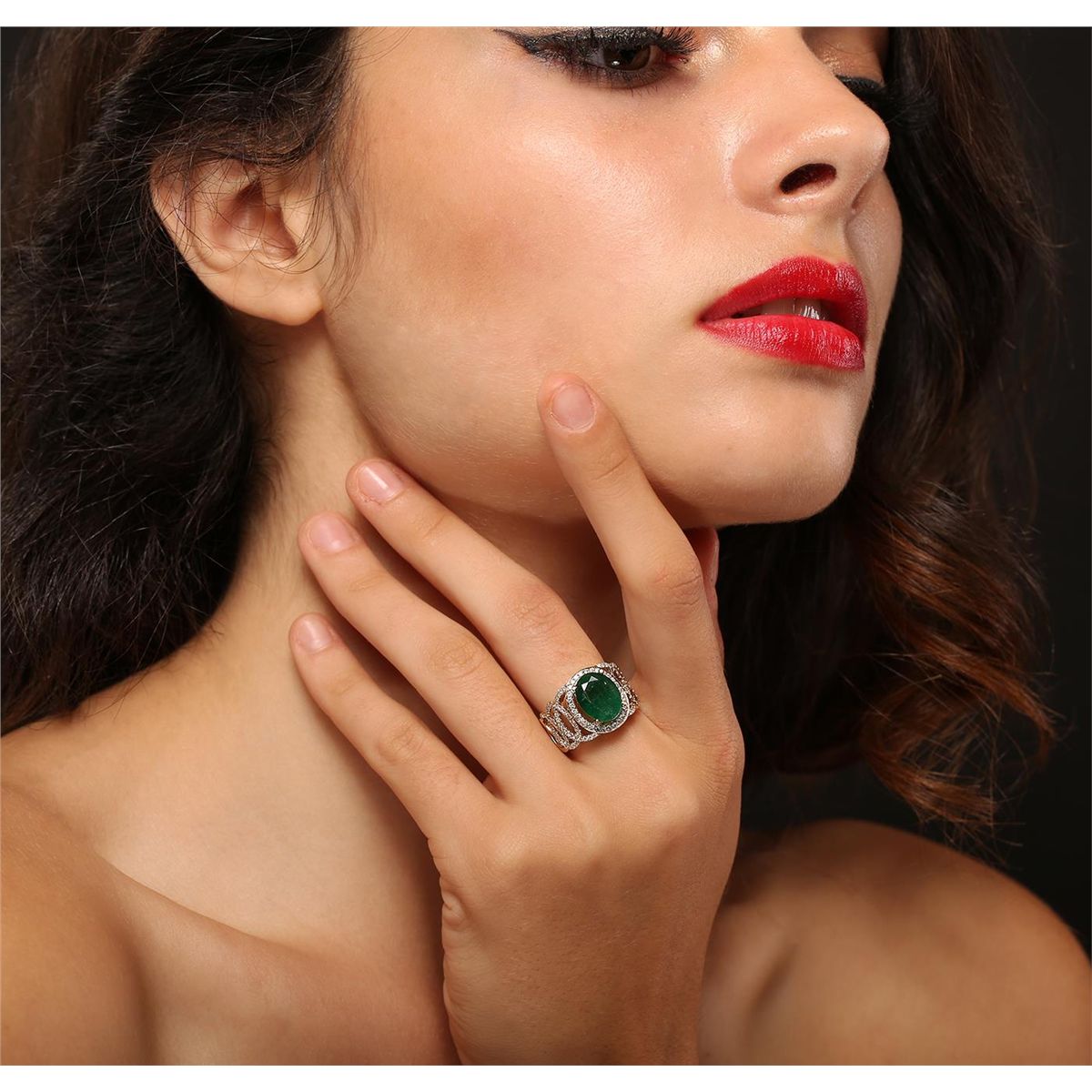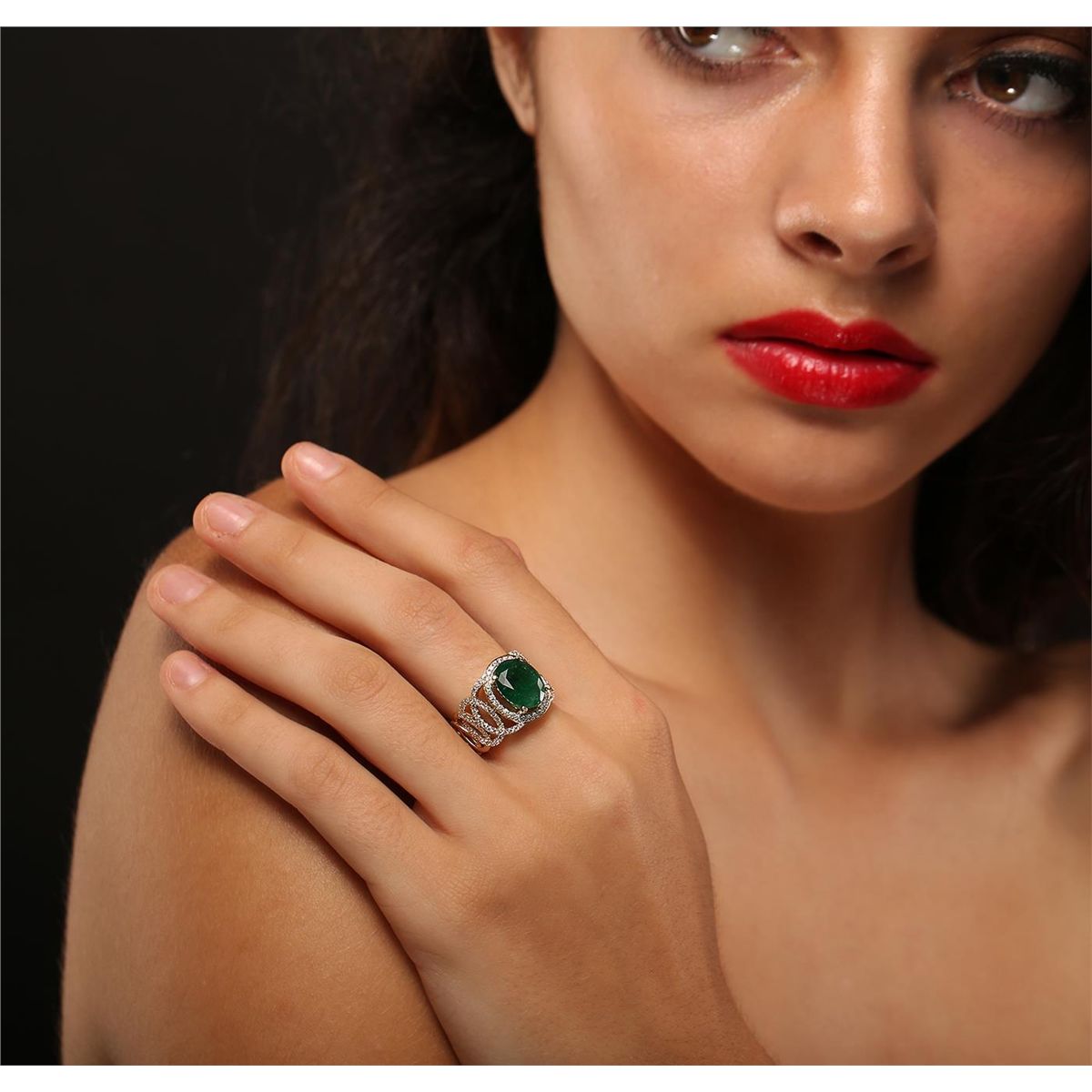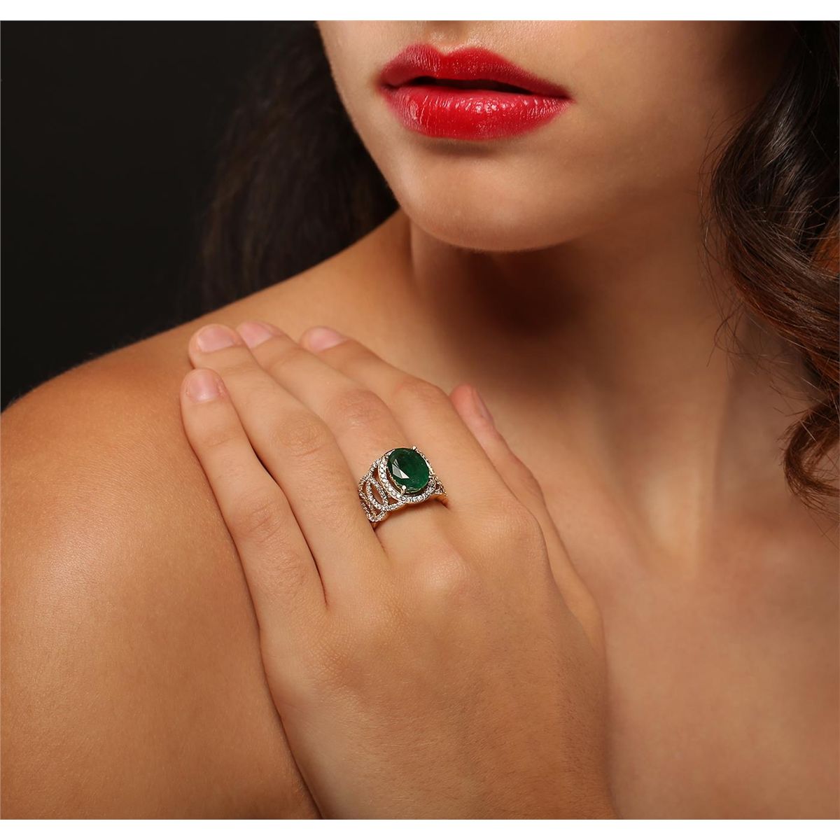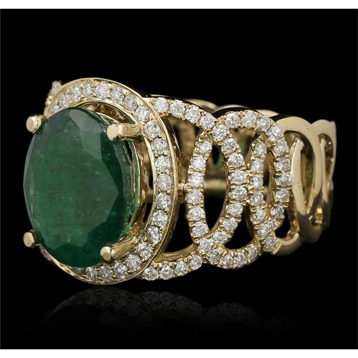 One electronically tested 14KT yellow gold Ladies combination cast & assembled fashion ring with a bright polish finish. Identified with markings of "14K". Condition is excellent. Containing: One prong set oval modified brilliant cut natural emerald, measuring 11.70 x 9.40 x 5.20mm, approximate weight of 3.15ct., clarity is heavily included, type III, medium dark, moderately strong, green color, (GIA G 6/4) . Colored gemstones are presumed to have been subjected to commonly used and possible undetectable color/clarity enhancement processes. One Hundred Nine prong set round brilliant cut diamonds, measuring 1.20 - 1.20 x 0.72mm (depth est.) approximate total weight of 109 Stones = 0.69ct. Clarity of I-1 to I-2, Color of I - J. Total Weight of Colored Stones 3.15ct. Total Weight of Diamonds 0.69ct. Total Weight of Ring 8.00gm. GGL Appraised at $7,160.00.