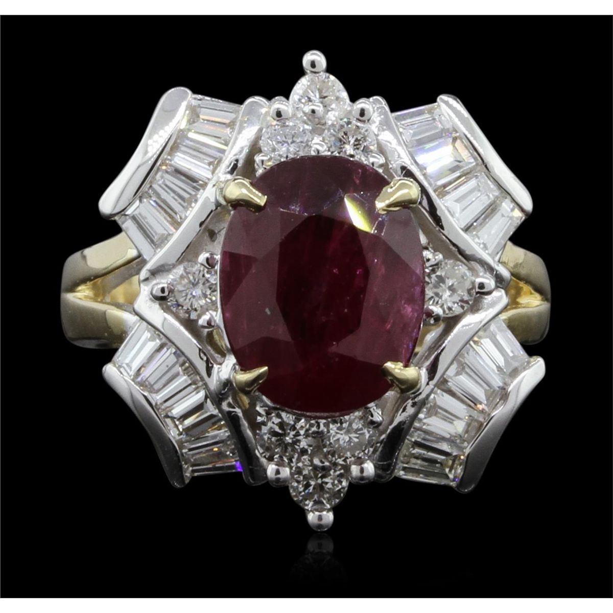 One electronically tested 14KT yellow with rhodium plating gold Ladies combination cast & assembled cocktail ring with a bright polish finish. Identified with markings of "14K". Condition is new. Containing: One prong set oval modified brilliant cut natural ruby, measuring 9.60 x 7.70 x 5.00mm, approximate weight of 3.15ct., clarity is heavily included, type II, dark, moderately strong, strongly purplish red color, (GIA stpR 7/4), cut is good. Indications of heat treatment with glass and flux residue. Colored gemstones are presumed to have been subjected to commonly used and possible undetectable color/clarity enhancement processes. Eight prong set round brilliant cut diamonds, measuring 2.50 - 2.50 x 1.50mm (depth est.) approximate total weight of 8 Stones = 0.46ct. Clarity of SI-1 to SI-2, Color of I - J, Cut is Very Good. Sixteen channel set baguette cut diamonds, measuring 3.00 x 2.00 x 1.70mm (depth est.) approximate total weight of 16 Stones = 1.49ct. Clarity of VS-1 to VS-2, Color of I - J, Cut is Very Good. Total Weight of Colored Stones 3.15ct. Total Weight of Diamonds 1.95ct. Total Weight of Ring 7.70gm. GGL Appraised at $9,015.00.