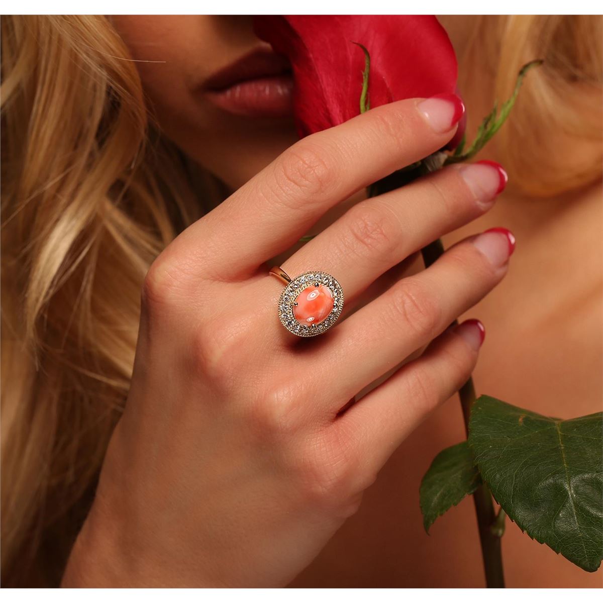 One electronically tested 14KT yellow gold ladies cast coral and diamond ring with a bright and milgrain finish. Condition is new, good workmanship. The featured coral is set within a diamond lattice gallery, completed by a two millimeter wide band. Identified with markings of "K14". Containing: One prong set oval cabochon cut natural salmon coral, measuring 10.90 x 9.00 x 4.50mm, approximate weight of 3.16ct., clarity is severely included, medium light, moderately strong, reddish orange color, (GIA rO 4/4), cut is good. Transmitting light very diffusely, opaque. Naturally occurring internal & external characteristics are present. Graded in the setting. Coral (Corallium Japonicum) is formed undersea by microscopic animals called coral polyps. These tiny, creatures form minute, hard shells. As a colony grows, it takes on complex branching, tree-like forms which allows the maximum number of polyps to be fed by the nutrients in the water. It grows about one quarter inch per year. This color of coral is commonly treated to improve or change the color and stability. Evidence that may confirm this is typically lacking. Twenty bead set round brilliant cut diamonds, measuring 2.00 - 1.90 x 1.17mm (depth est.) approximate. Total Weight of 20 Stones = 0.64ct. Graded in the setting. Clarity: SI-1 to I-1. Color: G - I. Total Weight of Colored Stones 3.16ct. Total Weight of Diamonds 0.64ct. Total Weight of Ring 5.80 grams. AIG Appraised at $3,865.00.